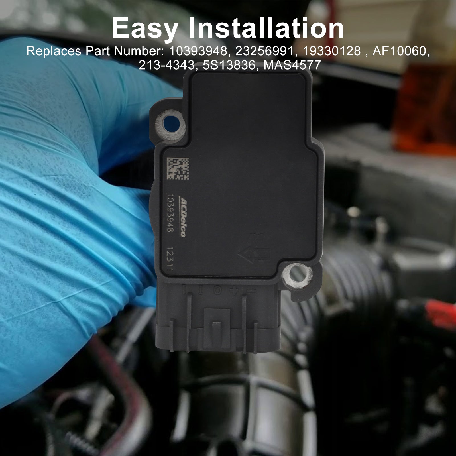 Experience optimal engine performance across various temperatures with our Replacement MAF Sensor. Expertly engineered to precisely measure air intake, this sensor ensures your engine runs smoothly and efficiently. Compatible with multiple Cadillac, Chevrolet, and GMC models, this MAF sensor replaces part numbers 10393948, 23256991, 19330128, AF10060, 213-4343, 5S13836, MAS4577, making it a versatile and reliable choice. Installation is a breeze—simply disconnect the battery, loosen clamps, replace the old unit with the new one, and reconnect.