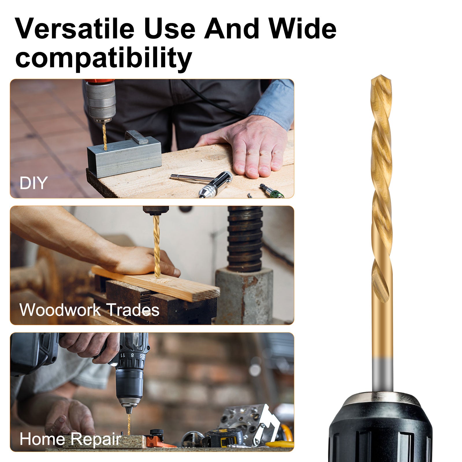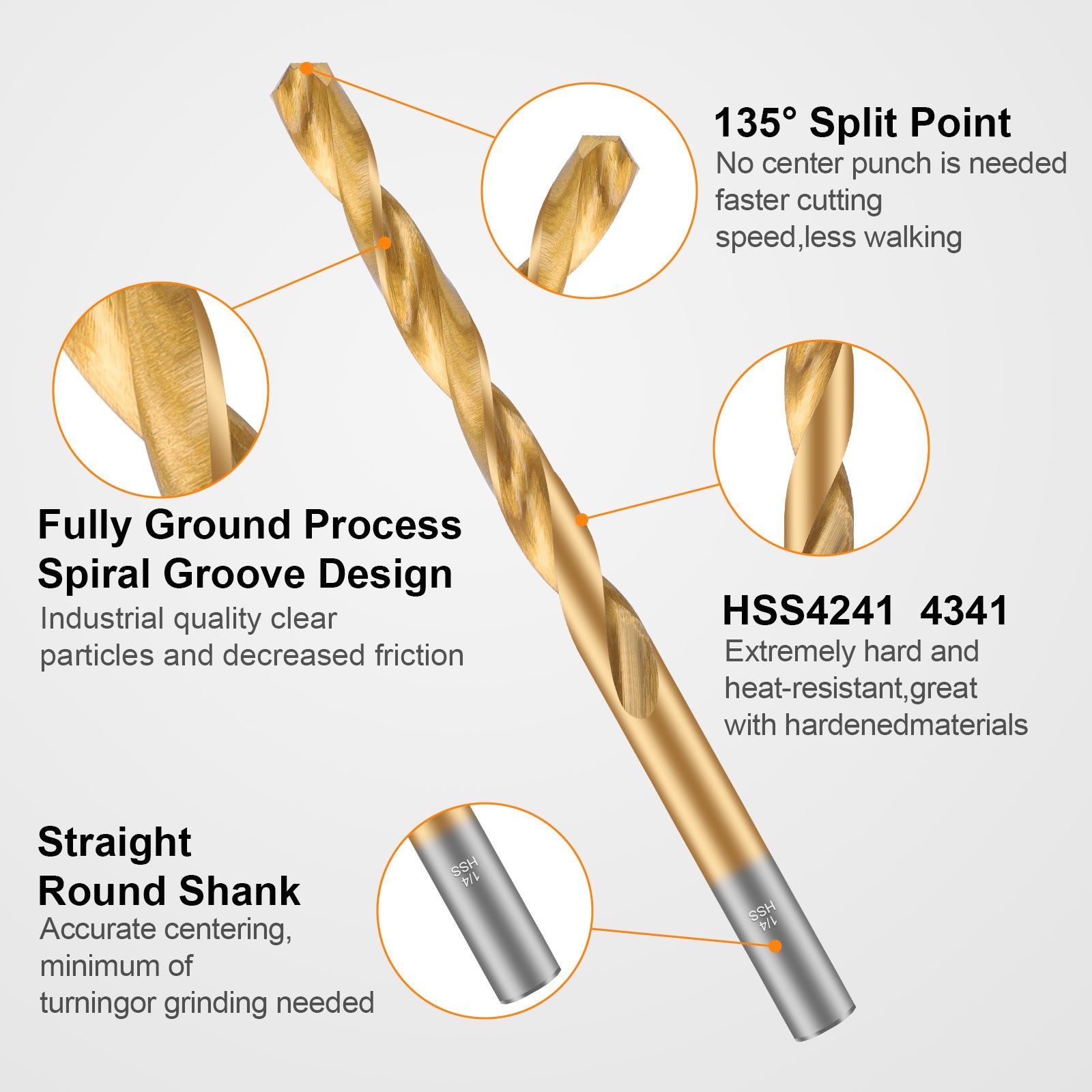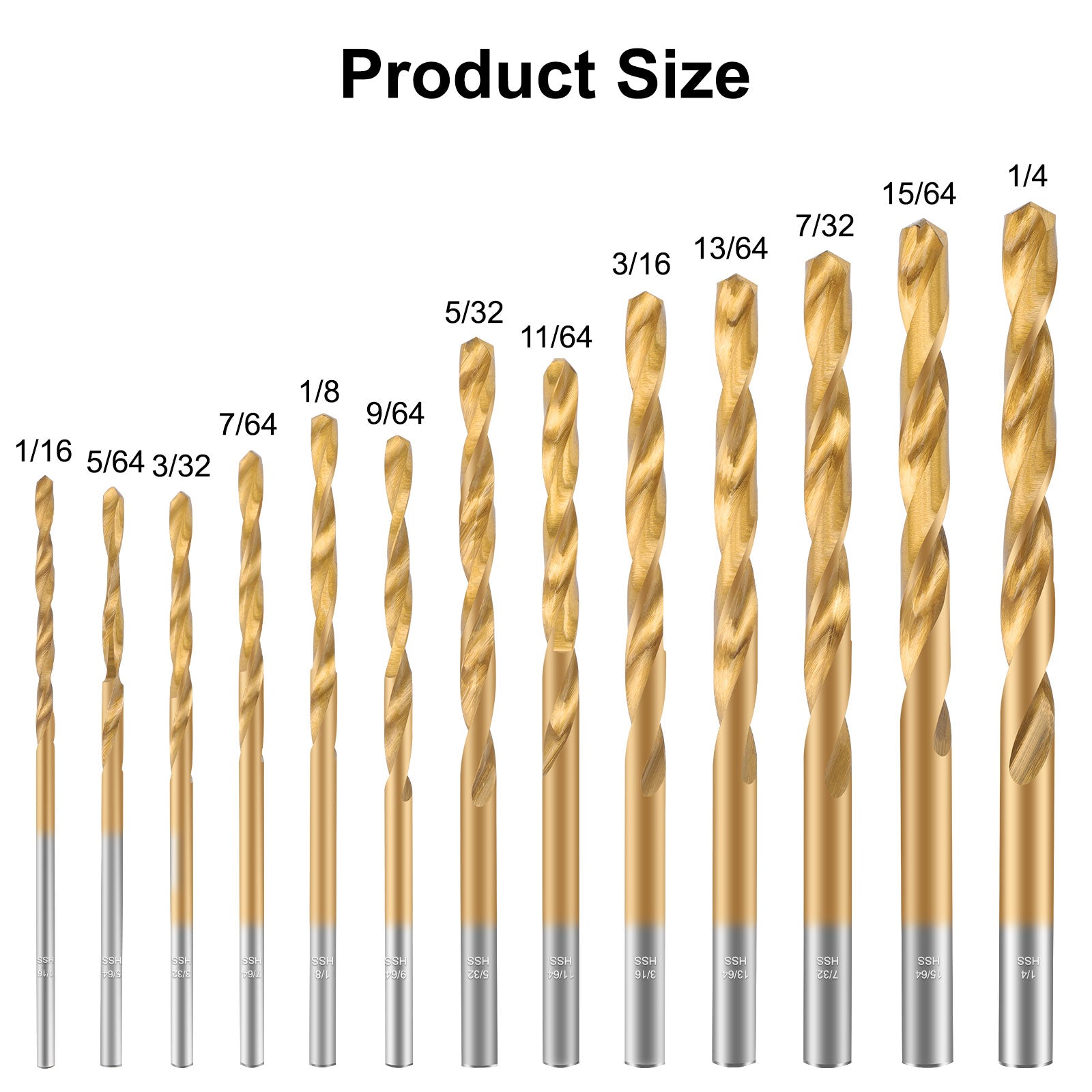 Upgrade your toolkit with our High-Speed Steel Titanium Twist Drill Bit Set. Each steel drill bit features an angled tip and twist style to quickly clear chips and particles, preventing walking. Constructed from high-speed steel with a titanium nitride coating, these drill bits offer high surface hardness to penetrate tough materials effectively. Available in 13 different sizes, this left-hand drill-bit set comes neatly arranged in a durable, high-impact metal index storage case for easy identification and organization.