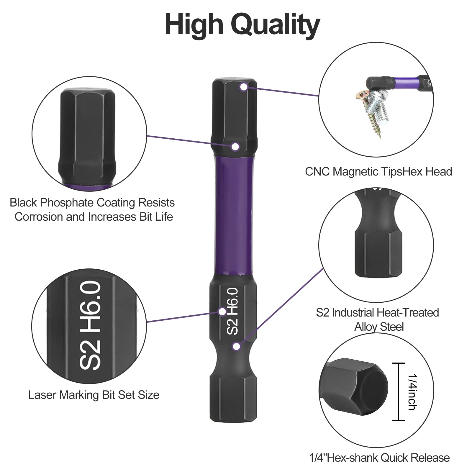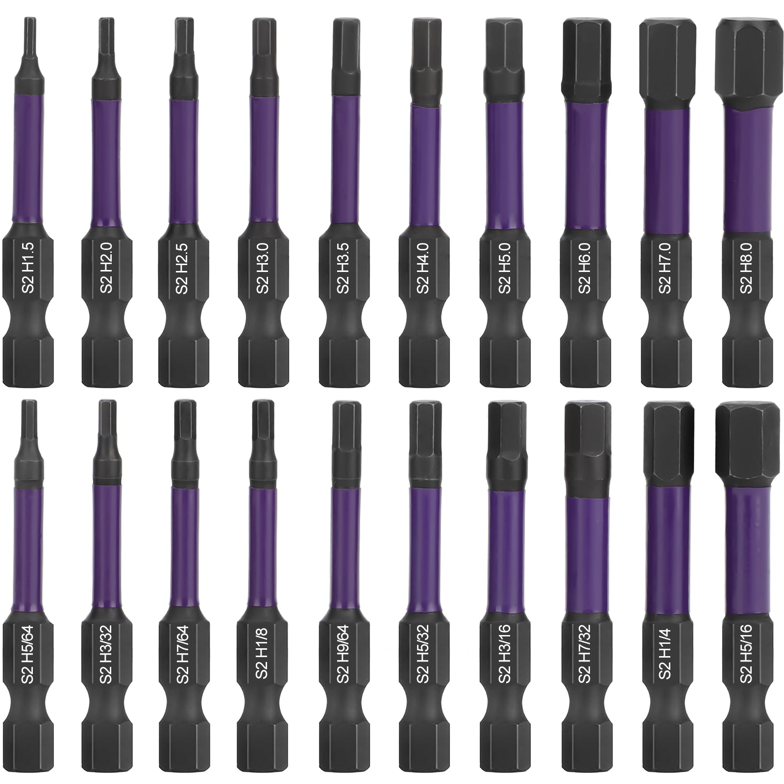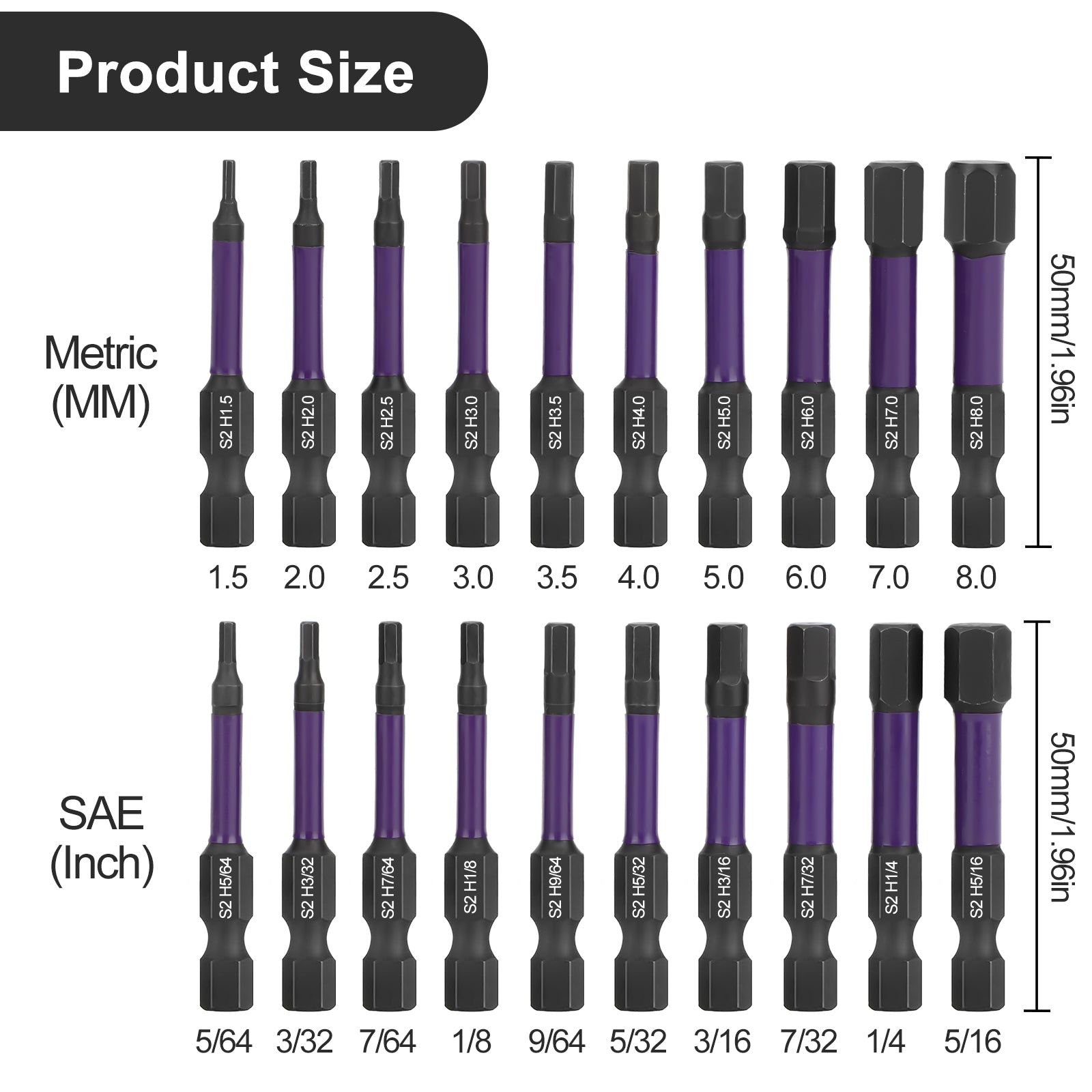 Perfect for DIY enthusiasts and professionals alike, our 20Pcs Impact Hex Head Drill Bit Set is a comprehensive collection that meets a wide range of fastening and drilling needs. This set includes 10 metric sizes ranging from 1.5mm to 8mm and 10 SAE sizes from 5/64” to 5/16”, with a uniform 50mm length for convenient use across various tasks.