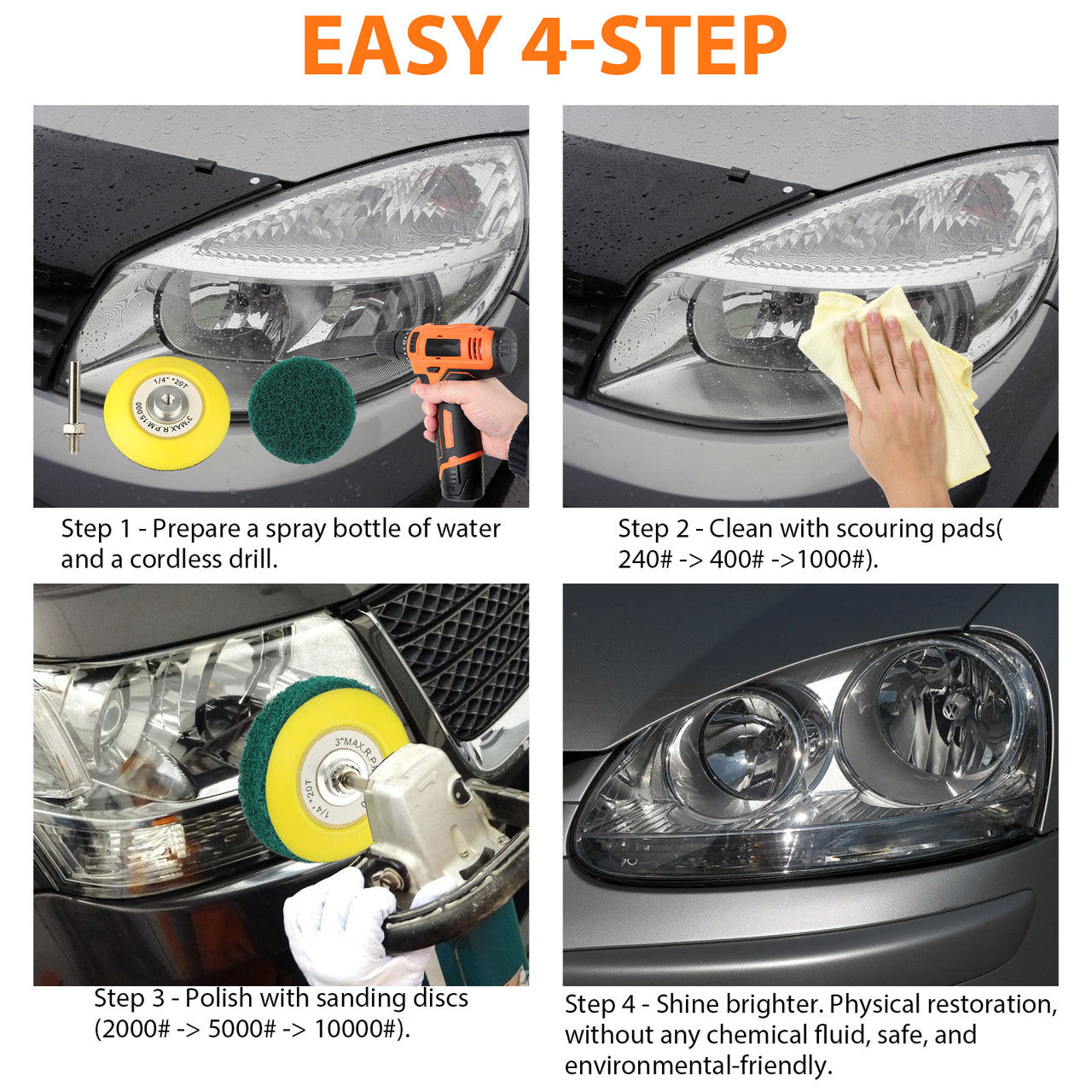 EASY 4-STEP: Step 1 - Prepare a spray bottle of water and a cordless drill. Step 2 - Clean with scouring pads( 240# -> 400# ->1000#). Step 3 - Polish with sanding discs (2000# -> 5000# -> 10000#). Step 4 - Shine brighter. Physical restoration, without any chemical fluid, safe, and environmental-friendly.