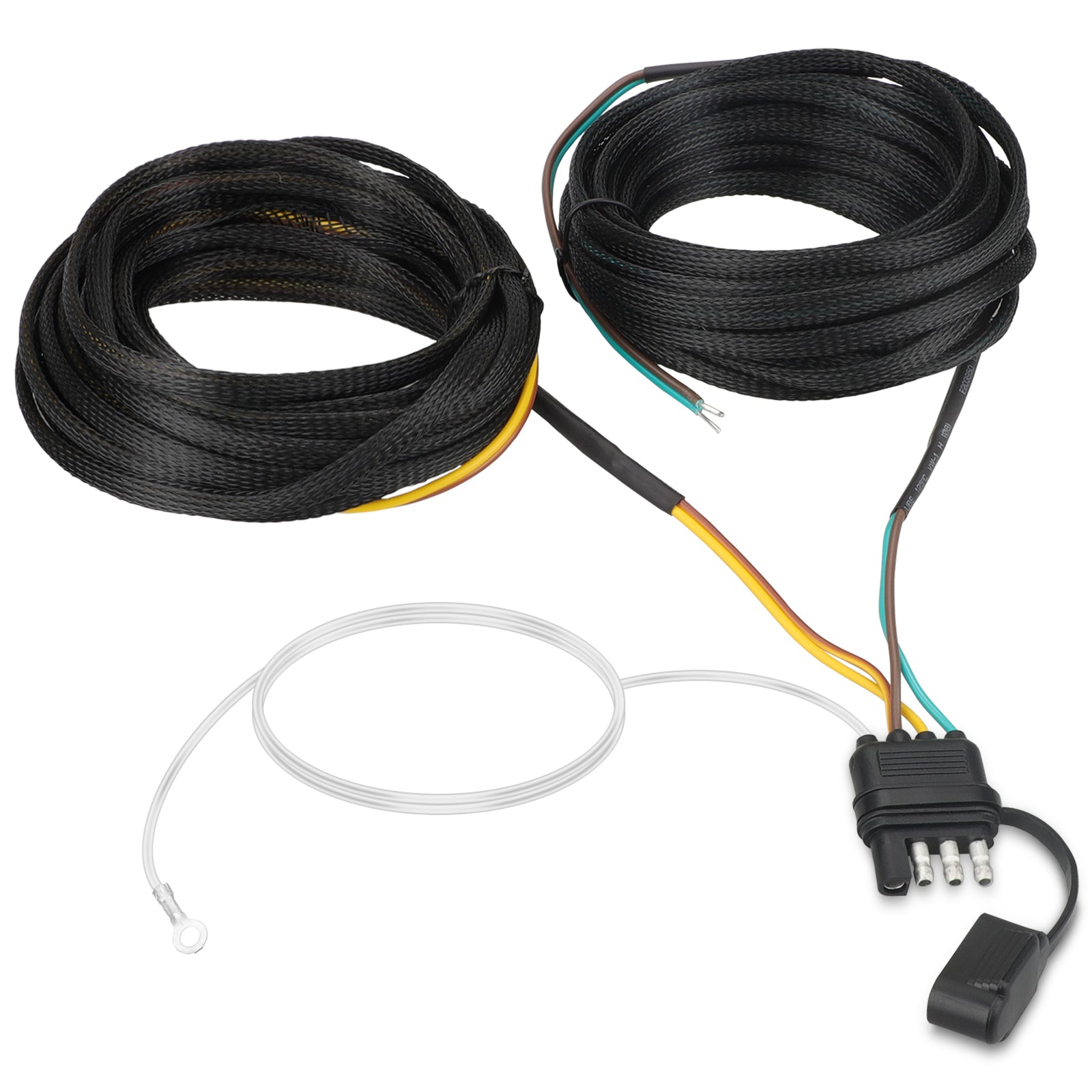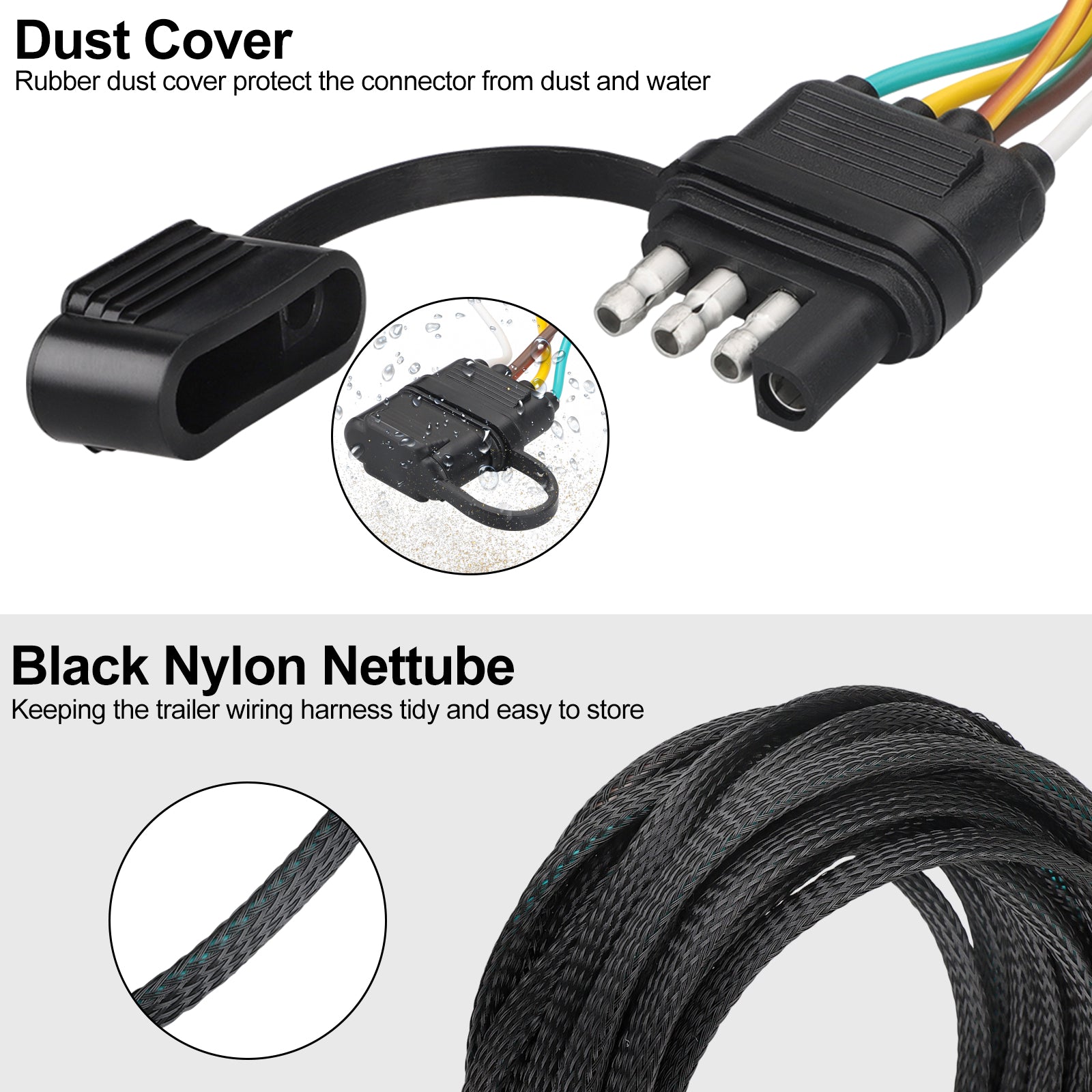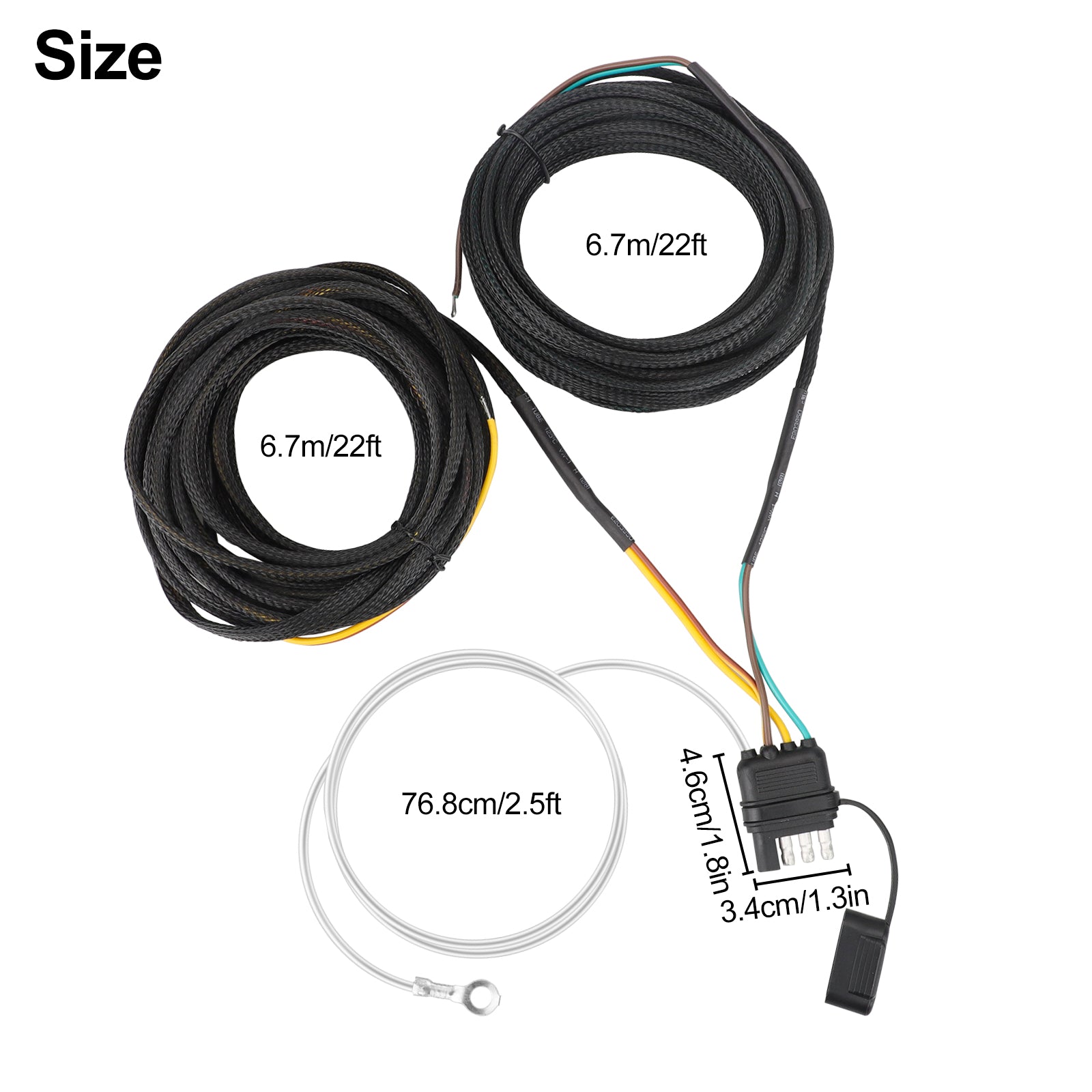 Upgrade your trailer's wiring with our Premium 4 Pin 5 Wire Trailer Wiring Harness. Made from thickened PVC wire coating and high-quality copper, this harness features a reinforced black nylon net tube for enhanced durability against adverse weather conditions. The 22ft length provides ample flexibility for installation. Easy to install with color-coded wiring, it connects taillights, brake lights, and turn signals. Ideal for various trailers, including marine boat trailers, ATV trailers, and cargo utility trailer hitches.