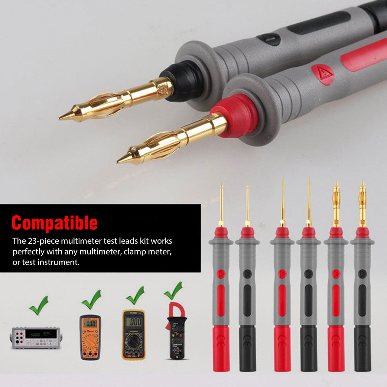 Compatible: The 23-piece multimeter test leads kit works perfectly with any multimeter, clamp meter, or test instrument.