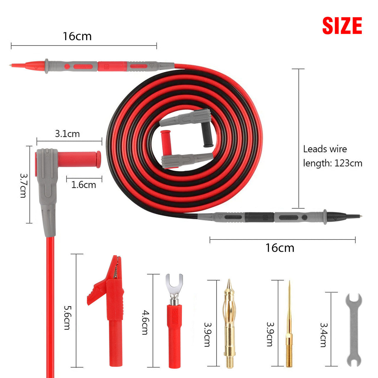 What You Get: 2x 43" test leads, 2x handles, 4x 1.0mm gold-plated probes, 2x 2.0mm gold-plated probes, 2x 3.8mm gold-plated banana plug probes, 2x 0.7mm back probe pins, 2x alligator clips, 2x tip shrouds, 1x wrench, 2x test hooks.
