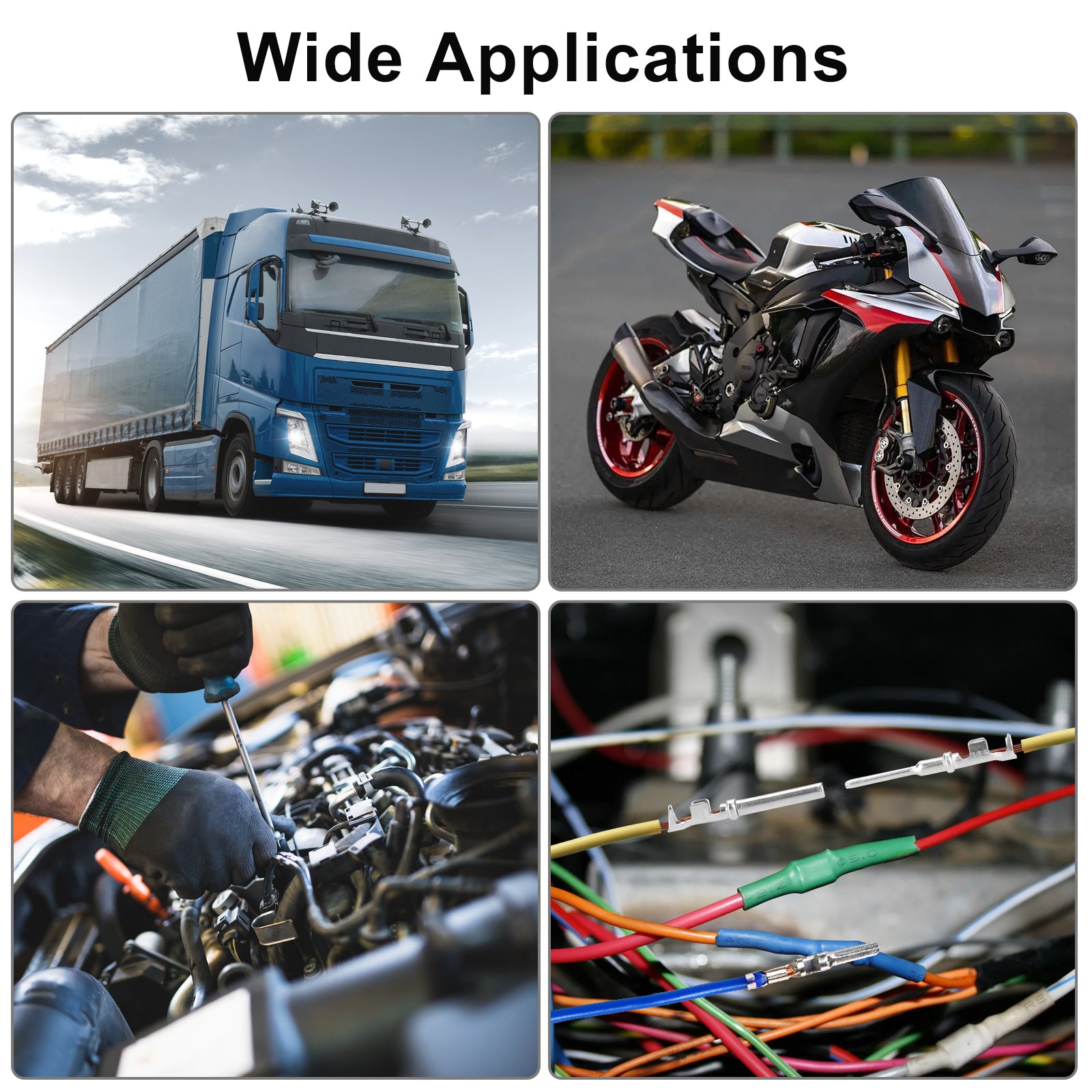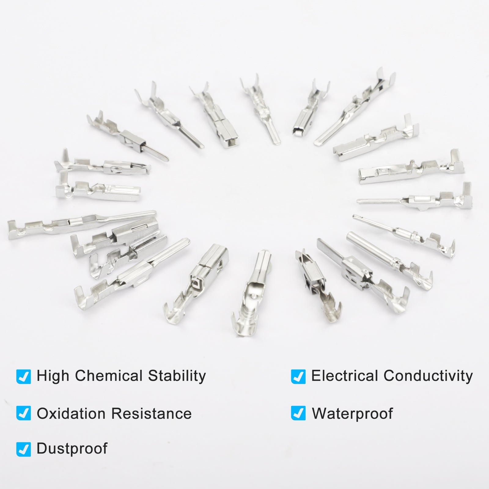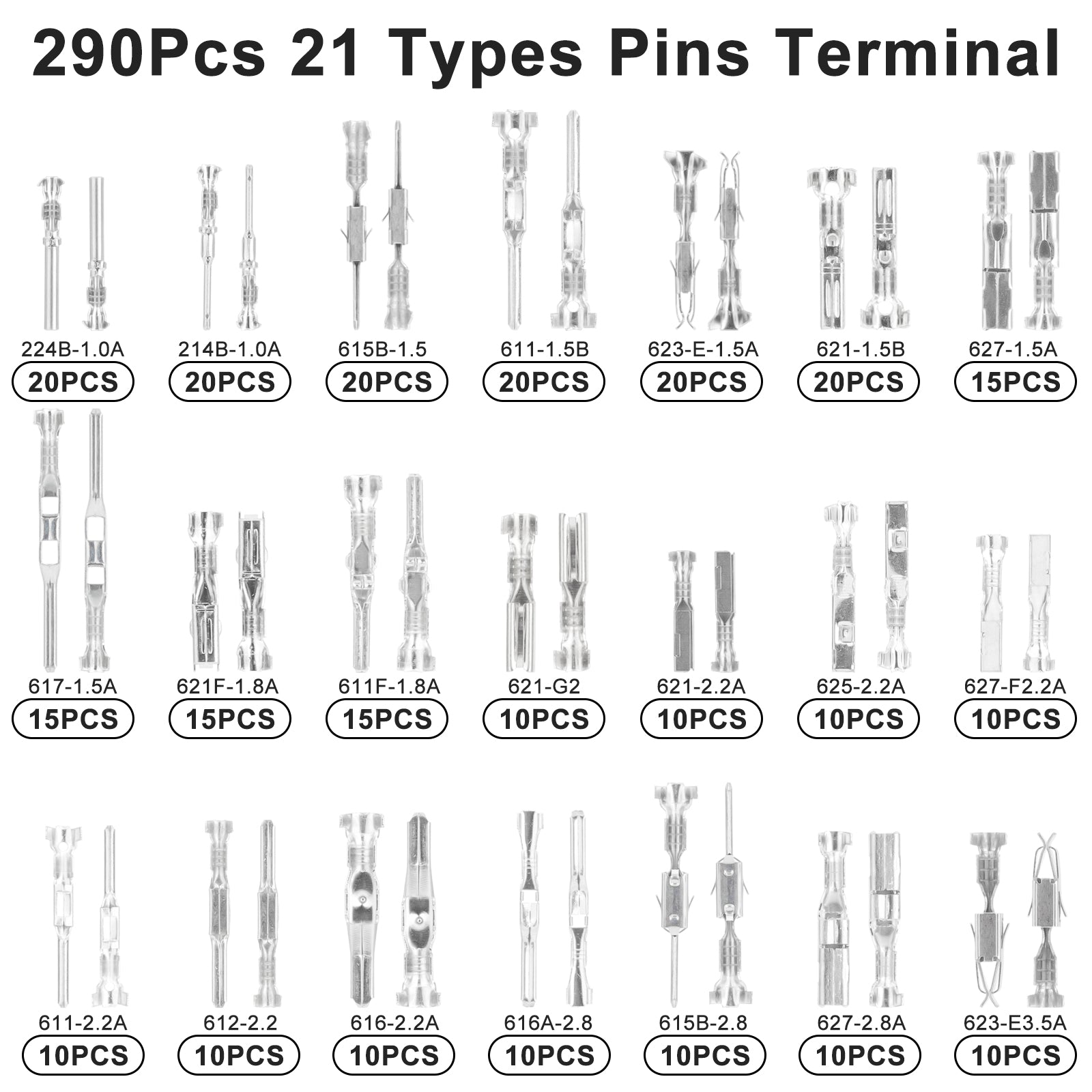 Versatile Kit: Includes 21 different sizes (1/1.5/1.8/2.2/2.8/3.5mm) to meet various needs, totaling 290 pieces. Made from 100% high-quality tin-plated copper for maximum conductivity and corrosion protection. High chemical stability, electrical conductivity, and oxidation resistance offer a reliable and long-lasting connection. Waterproof and dustproof terminals with secure buckles ensure precise and complete insertion, while allowing easy disconnection. Suitable for all kinds of 12V connectors, making it ideal for motorcycles, trucks, ships, jet skis, scooters, cars, and more.
