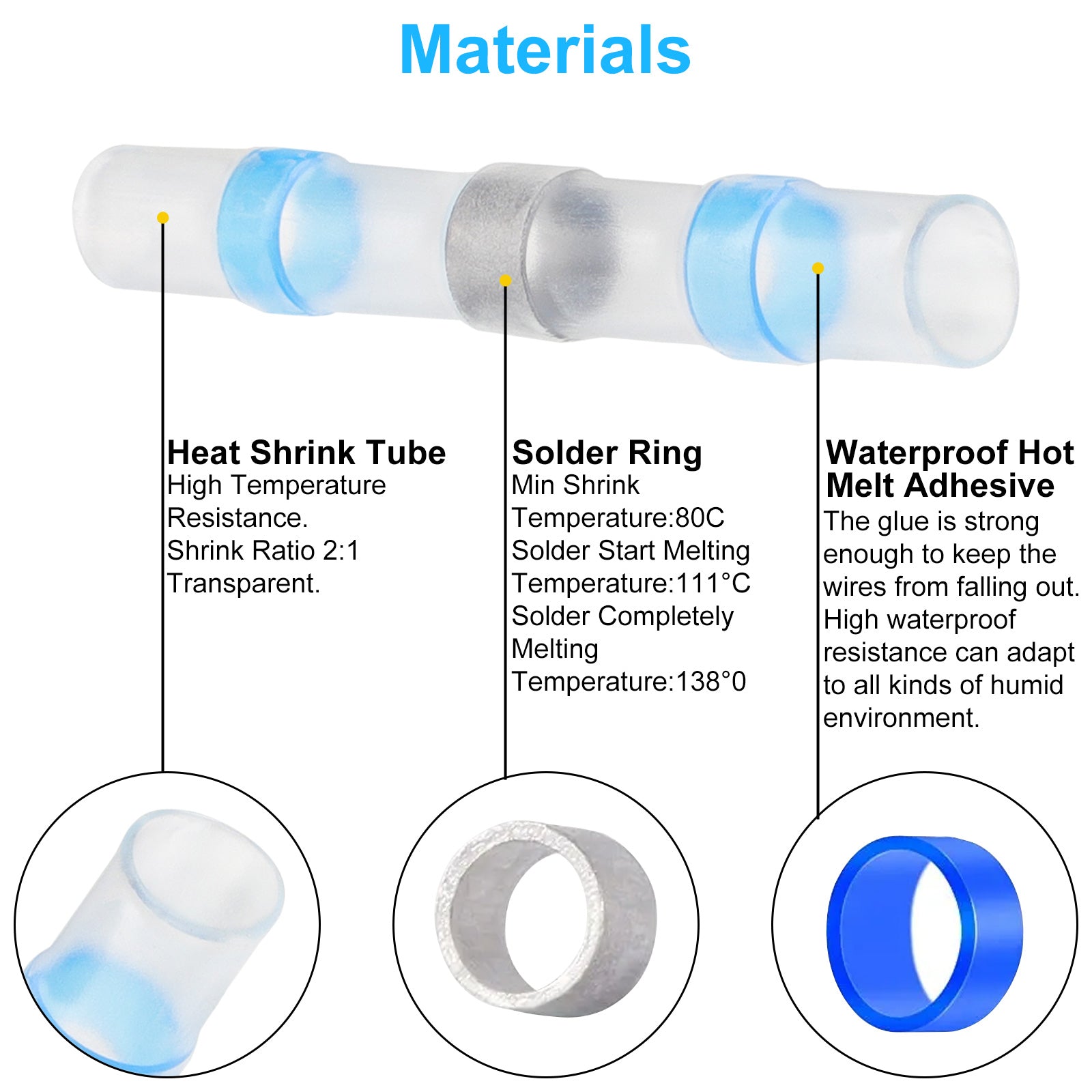 A: The tubing starts to shrink at 80℃, the solder ring starts to melt at 111℃, and melts completely at 138℃.