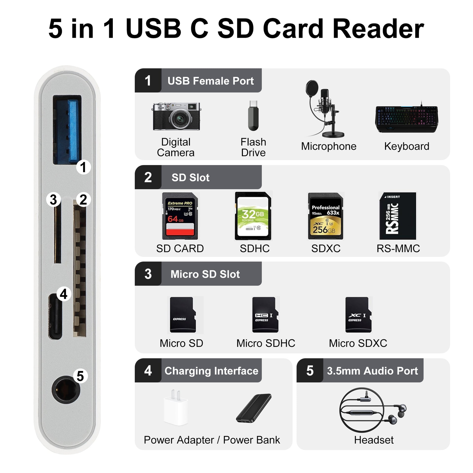 Maximize productivity with our versatile 5-in-1 USB-C Card Reader, designed to cater to all your data transfer needs. With a dedicated USB-C charging port and swift transfer speeds, this portable adapter ensures you can easily manage your files while keeping your device charged. Its plug-and-play functionality makes it the perfect travel companion for photographers, videographers, and mobile professionals alike.