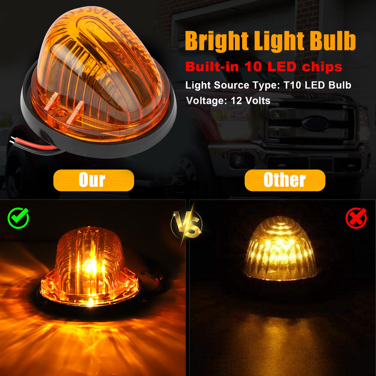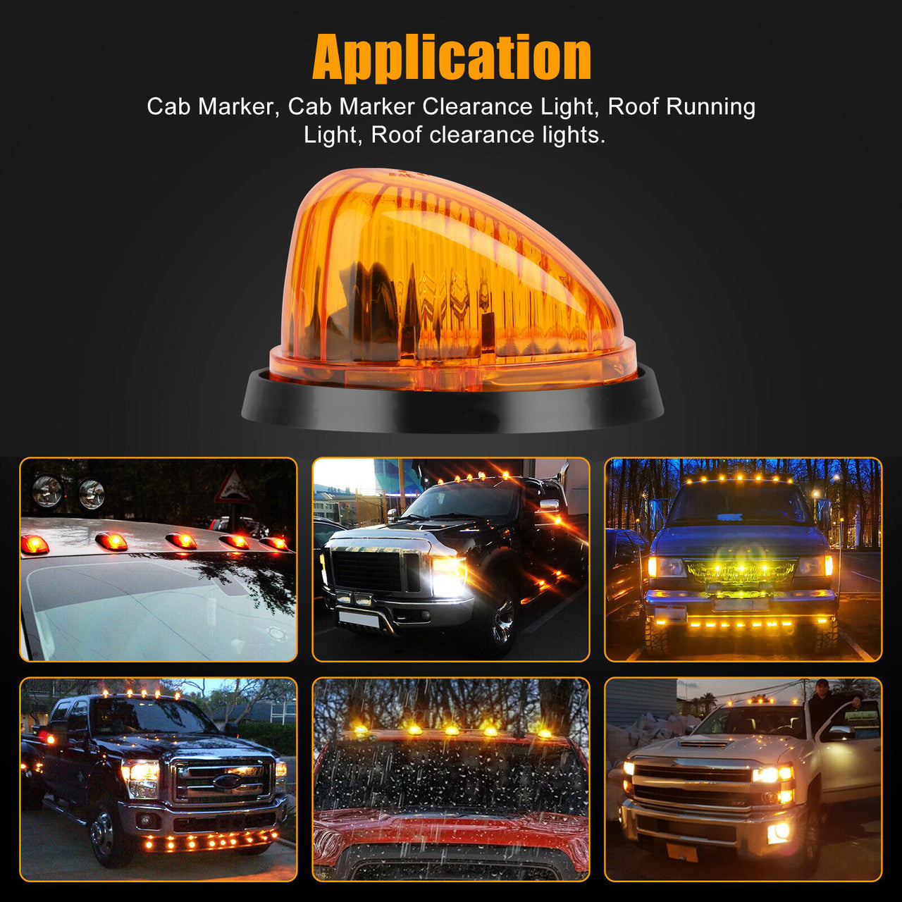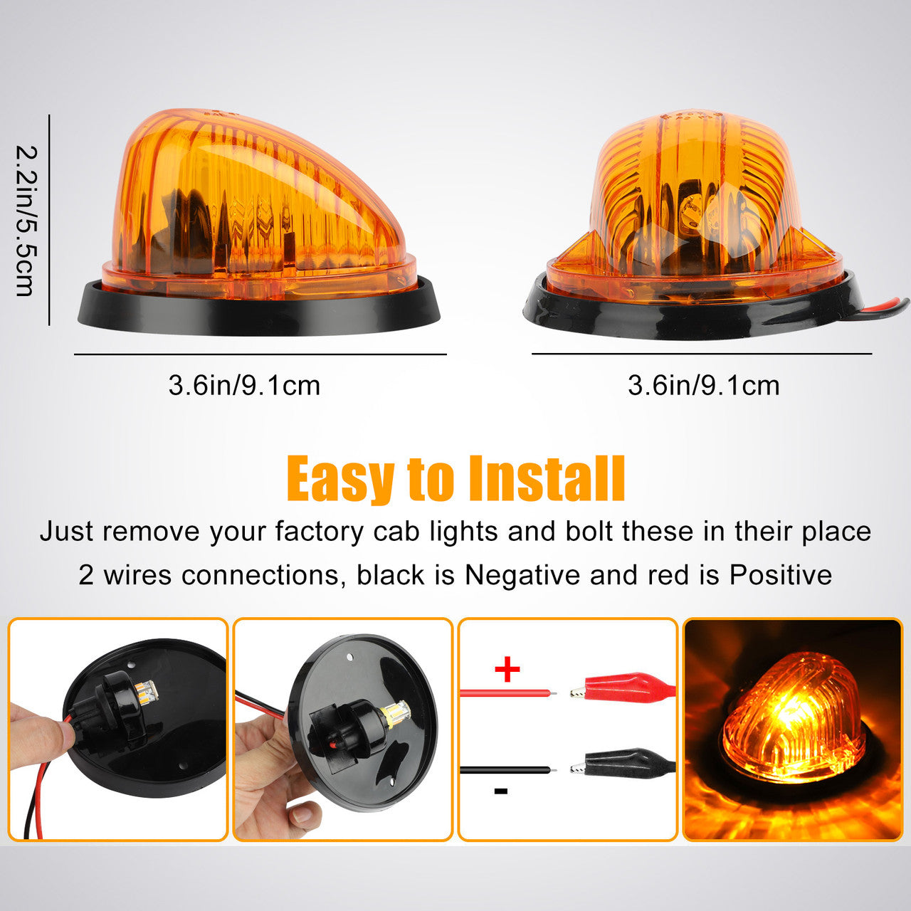 Product Features:● Made of high quality ABS plastic, won't fade from exposure; Come with T10 plug socket, convenient for modifying & rewiring. ● Comes with high quality Clear lens and Amber LED lamps, Provide better visibility of your vehicle on the road. ● Direct replacement for factory stock cab marker light covers. Perfect fit & No leakage. Neither any cutting, modifying nor wiring is needed. ● Application: Cab Marker, Cab Marker Clearance Light, Roof Running Light, Roof clearance lights.