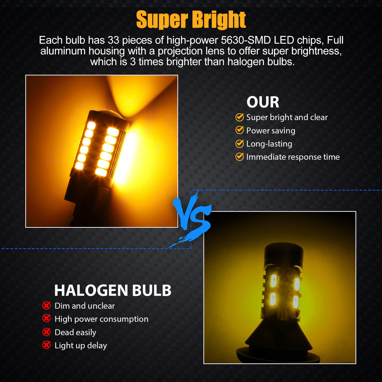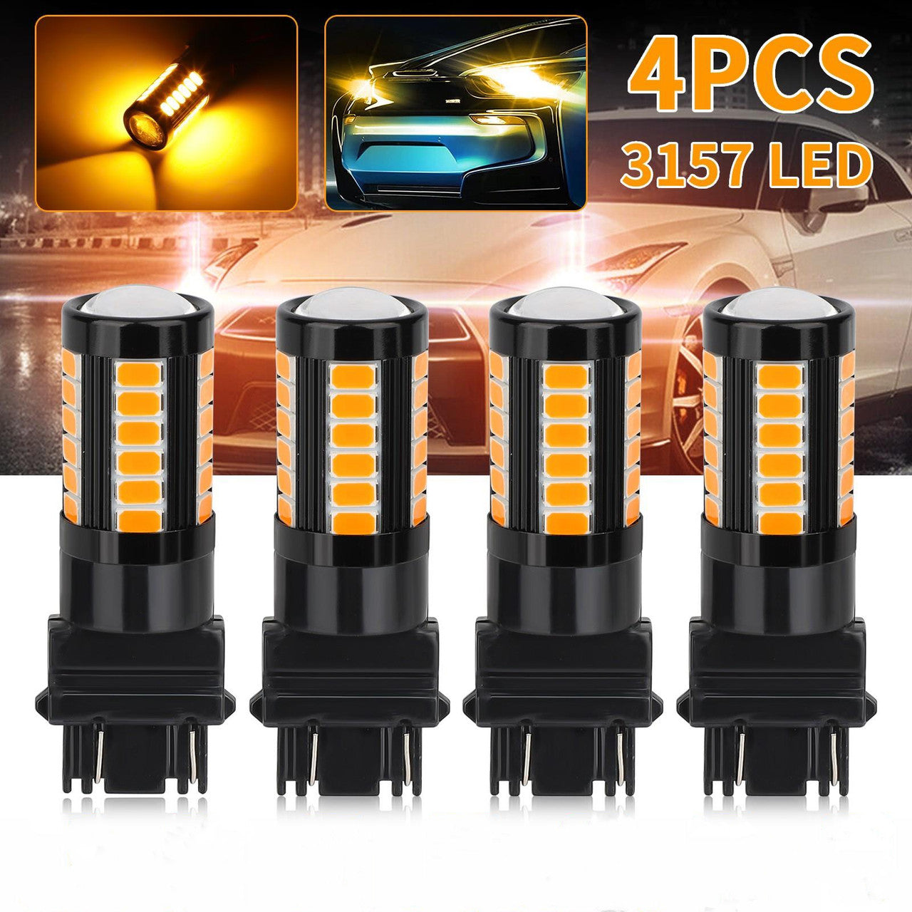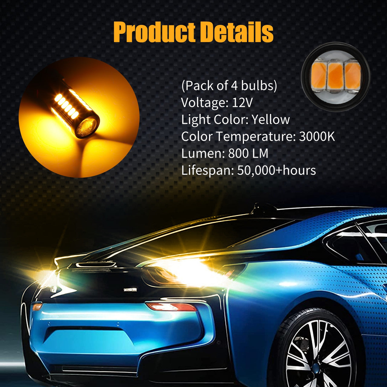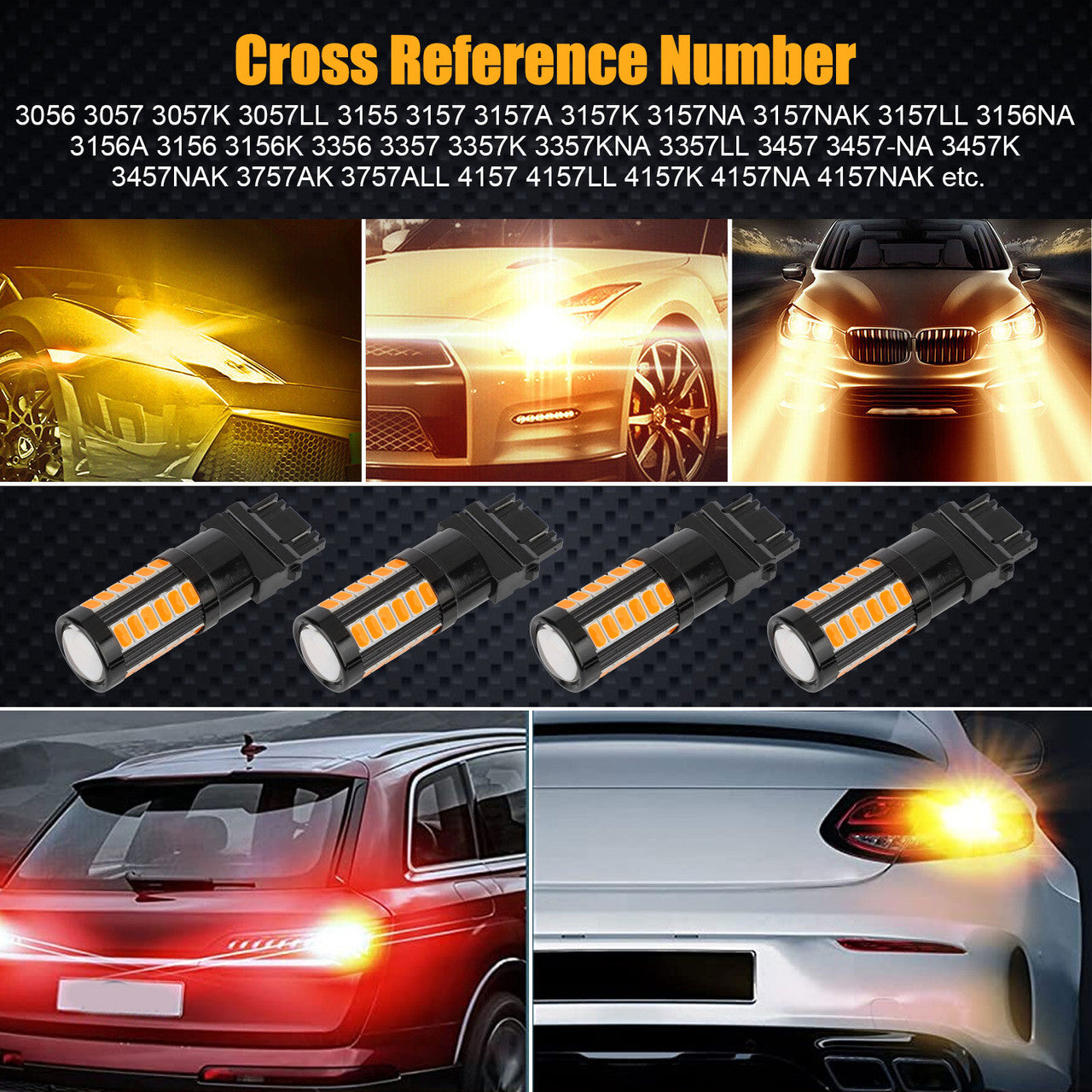 Product Features:● Product Details: (Pack of 4 bulbs) Voltage: 12V, Color: Yellow, Color Temperature: 3000K, Lumen: 800 LM, Lifespan: 50,000+hours. ● Super Bright: Each bulb has 33 pieces of high-power 5630-SMD LED chips, Full aluminum housing with a projection lens to offer super brightness, which is 3 times brighter than halogen bulbs. ● Good Performance: Designed with a high-quality aluminum substrate for better heat dissipation. Low power consumption for energy saving. Built-in intelligent IC driver to protect the original vehicle power supply line. ● Cross Reference Number:3056 3057 3057K 3057LL 3155 3157 3157A 3157K 3157NA 3157NAK 3157LL 3156NA 3156A 3156 3156K 3356 3357 3357K 3357KNA 3357LL 3457 3457-NA 3457K 3457NAK 3757AK 3757ALL 4157 4157LL 4157K 4157NA 4157NAK etc. ● Wide Application: Backup light, DRL Backup Reserve Light, Tail light, Corner light, Stop light, Parking light, Side marker light, Car RV Trailer Camper Interior Light.