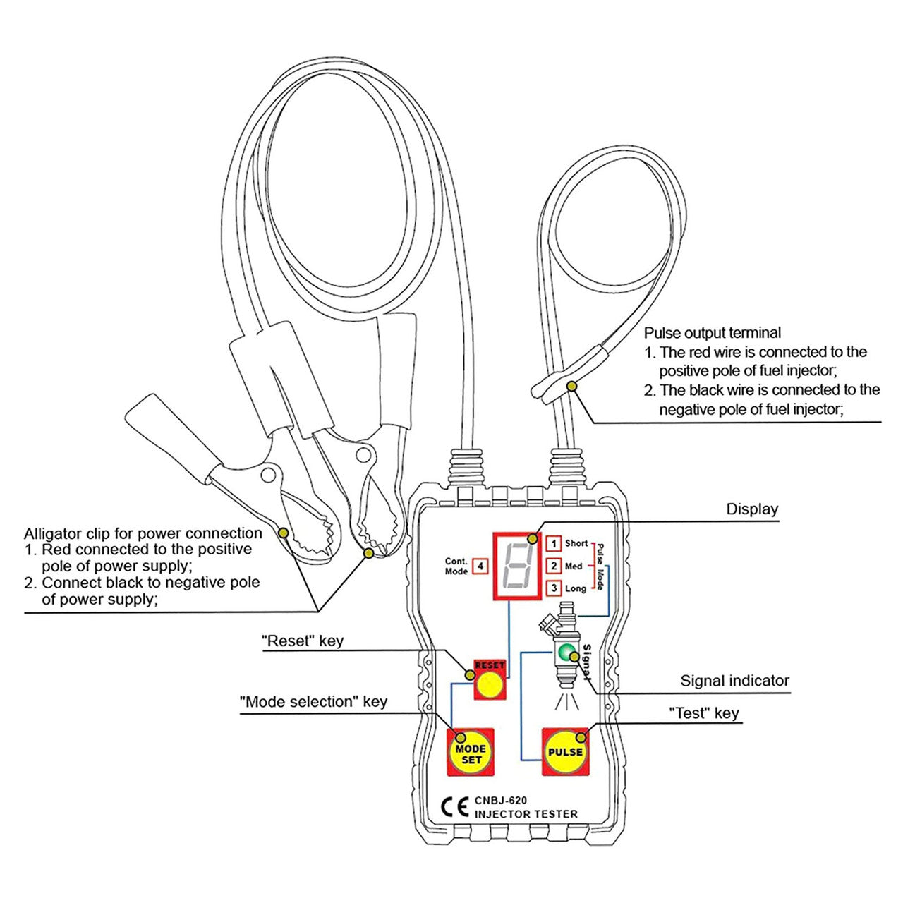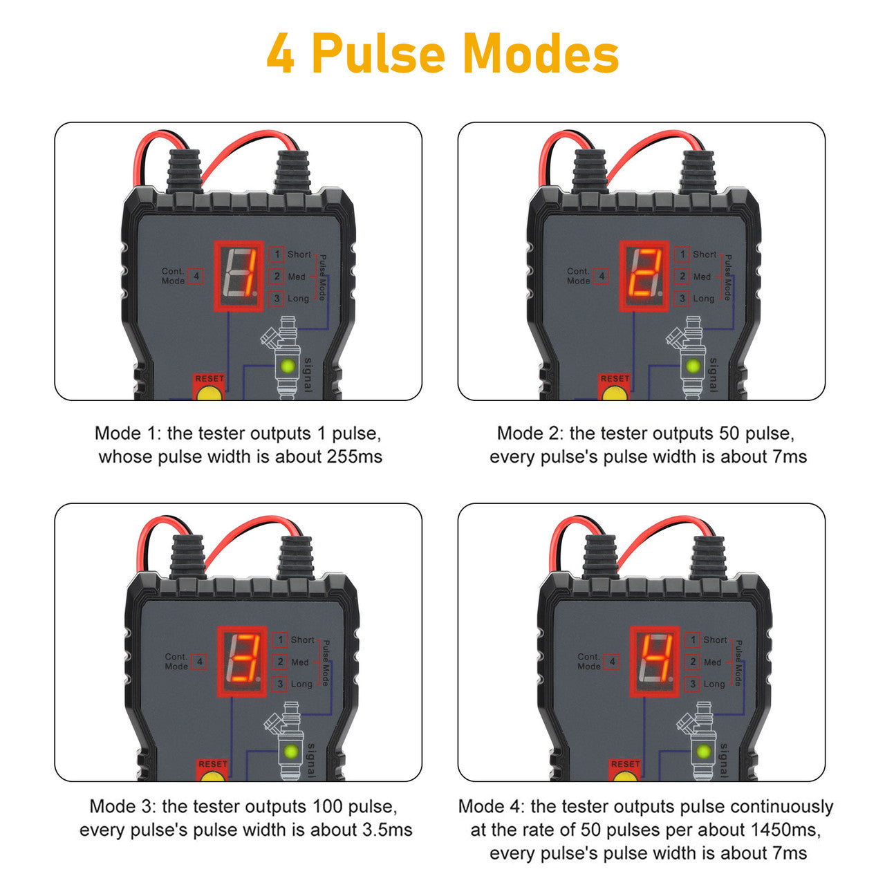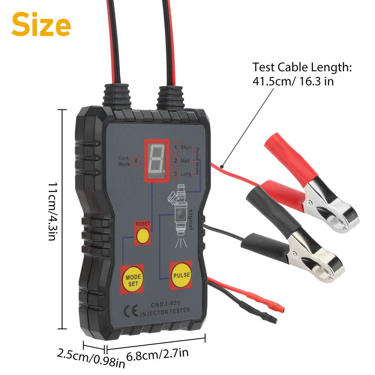Product Features:● This injector tester is 41.5cm / 16.3 inches and can test lead. It can work with any fuel pressure tester. NOTE: Gasoline cars only, NOT for diesel engines. ● The injector Tester comes with an LED display and 4 pulse modes - Single / Short / Long/ Continuous modes. It can help you identify whether the injector is good or not when you switch off the engine. ● You can use it to test each injector individually to help identify stuck, leaking or burnt-out conditions. It works with the engine off and a pulse timer may be used with a fuel pressure gauge. ● The mode lock feature ensures test condition uniformity. ● Use a 12V vehicle battery as a power supply.