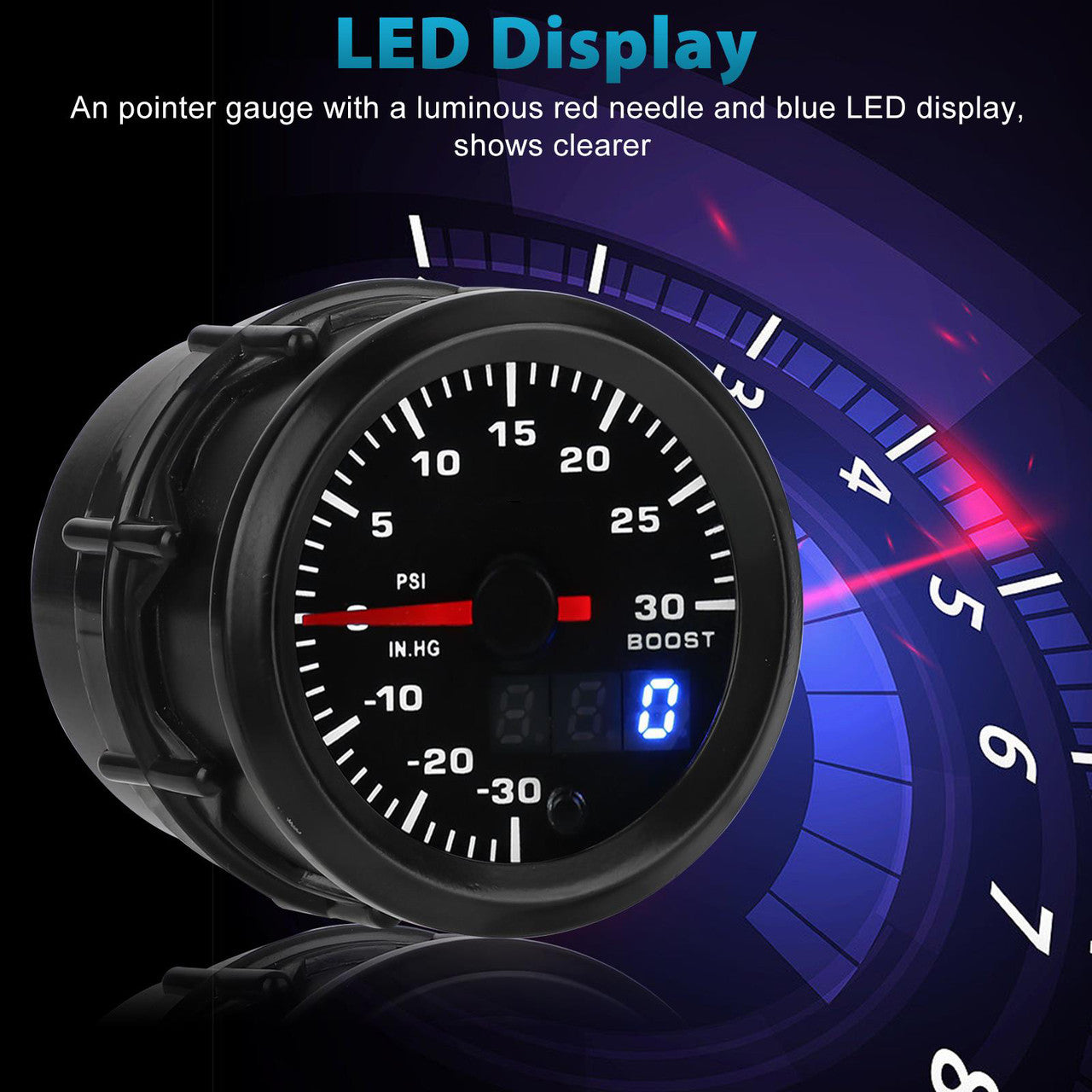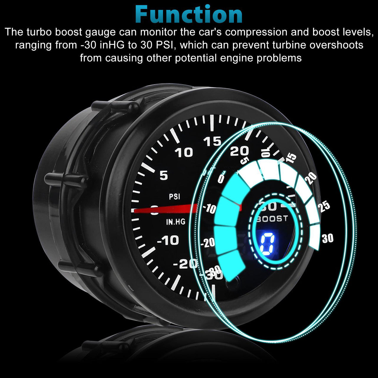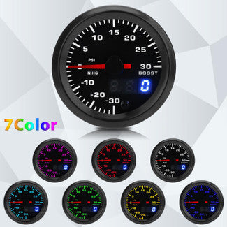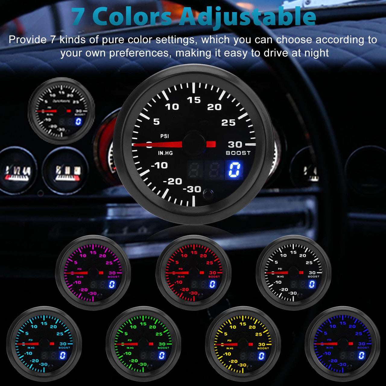 Product Features:● Function: The turbo boost gauge can monitor the car's compression and boost levels, ranging from -30 inHG to 30 PSI, which can prevent turbine overshoots from causing other potential engine problems. ● LED Display: An pointer gauge with a luminous red needle and blue LED display, shows clearer. ● 7 Colors Adjustable: Provide 7 kinds of pure color settings, which you can choose according to your own preferences, making it easy to drive at night. ● Simple Installation: Come with a boost sensor, a 1.94-foot power harness, and installation instructions, all of which make the installation process quick and easy. ● Wide Application: With a diameter of 52mm/2in, it is widely used and suitable for all 12V cars