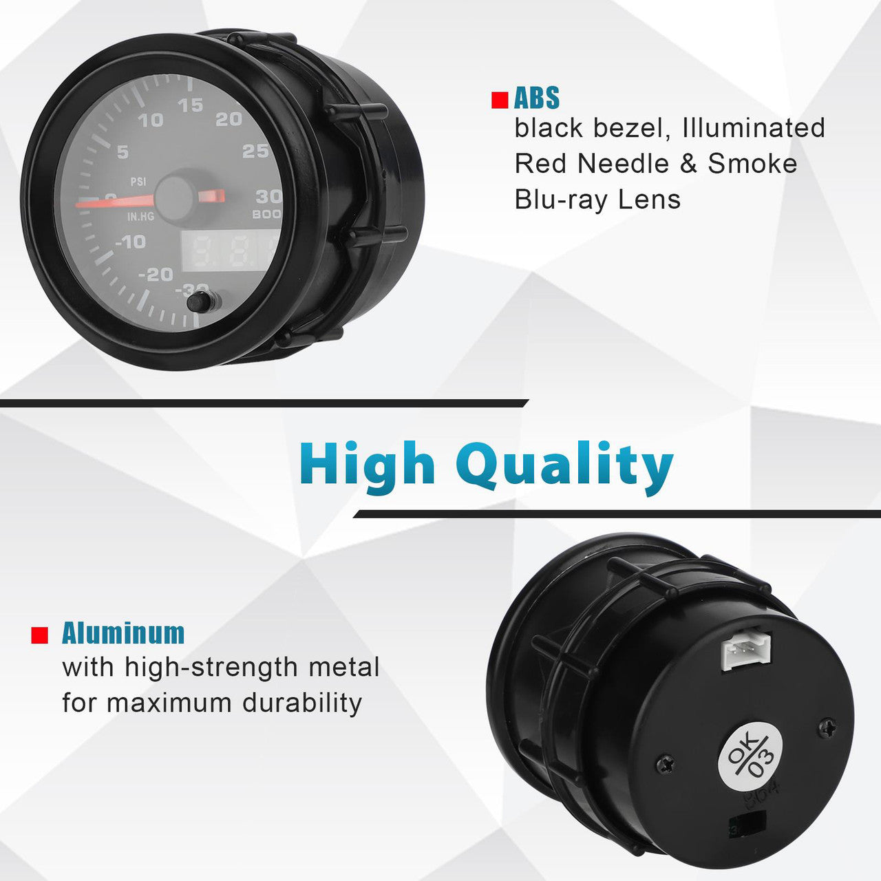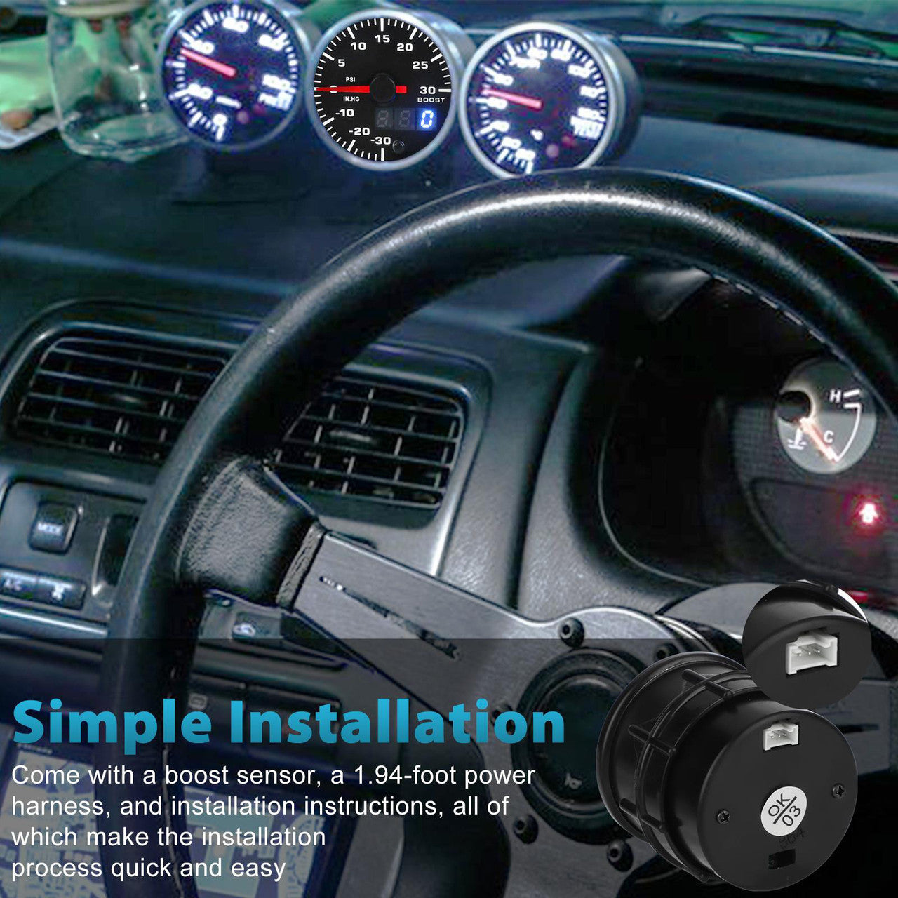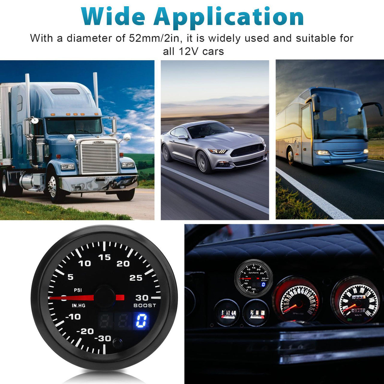 Product Features:● Function: The turbo boost gauge can monitor the car's compression and boost levels, ranging from -30 inHG to 30 PSI, which can prevent turbine overshoots from causing other potential engine problems. ● LED Display: An pointer gauge with a luminous red needle and blue LED display, shows clearer. ● 7 Colors Adjustable: Provide 7 kinds of pure color settings, which you can choose according to your own preferences, making it easy to drive at night. ● Simple Installation: Come with a boost sensor, a 1.94-foot power harness, and installation instructions, all of which make the installation process quick and easy. ● Wide Application: With a diameter of 52mm/2in, it is widely used and suitable for all 12V cars