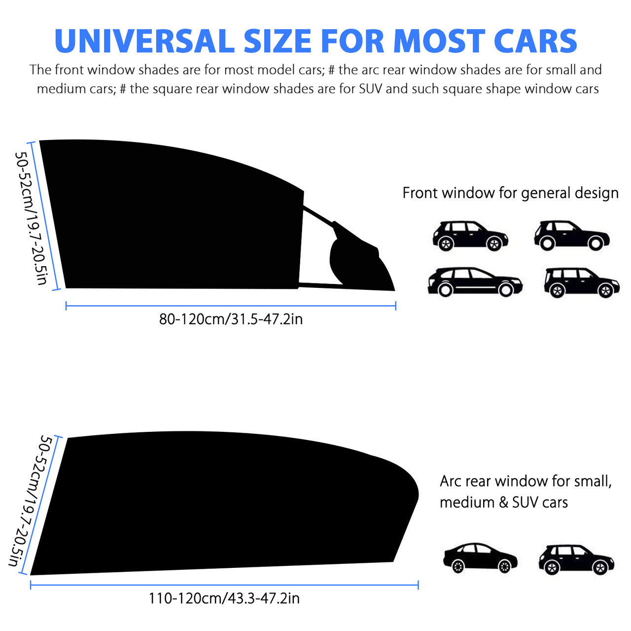 ✅Universal Size for Most Cars: The front window shades are for most model cars; # the arc rear window shades are for small & medium cars; # the square rear window shades are for SUV and such square shape window cars.