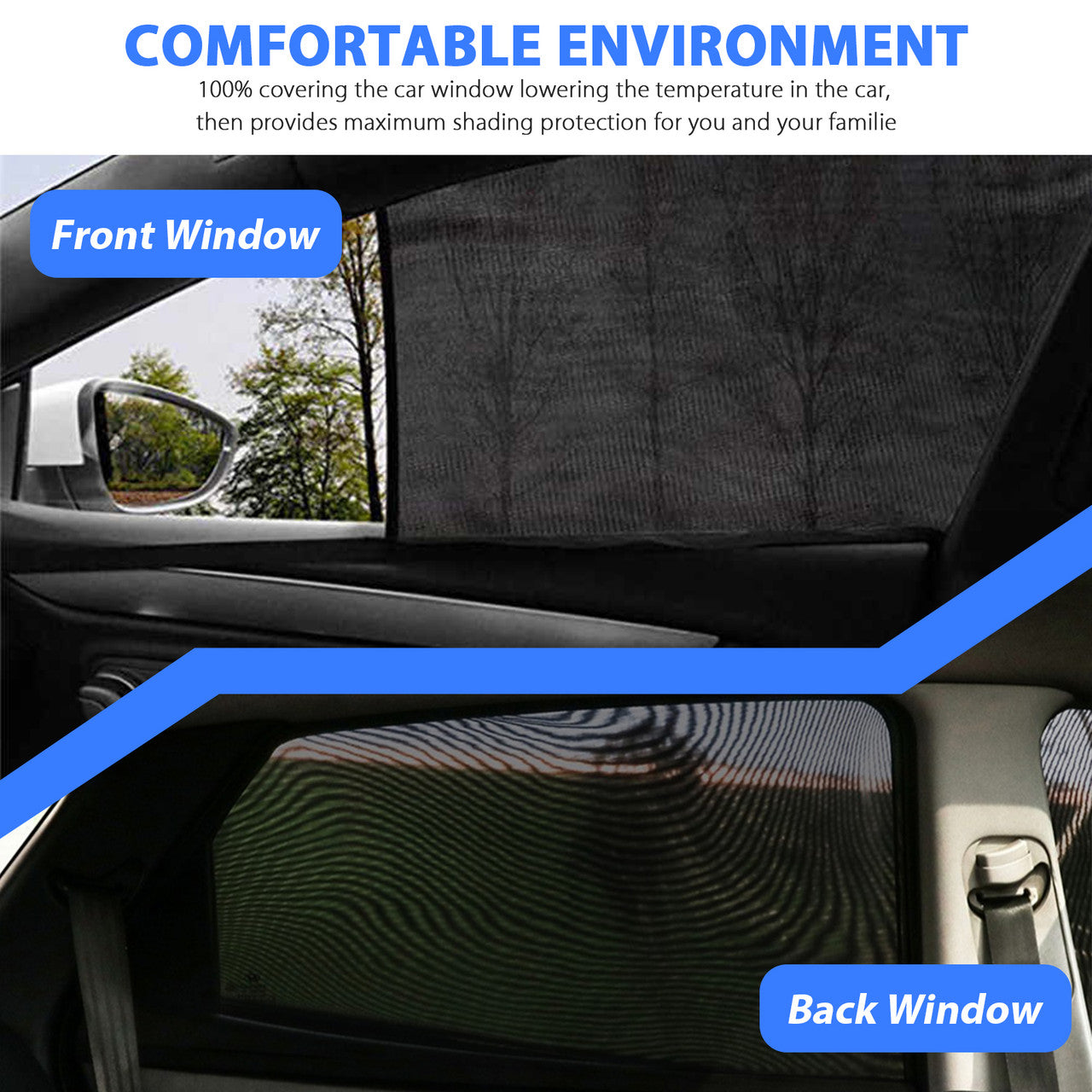 cover the car window, lowering the temperature in the car, then provides maximum shading protection for you and your families. Whenever you go out or on a trip, you and your families can better enjoy the music, movies, video games and rest.