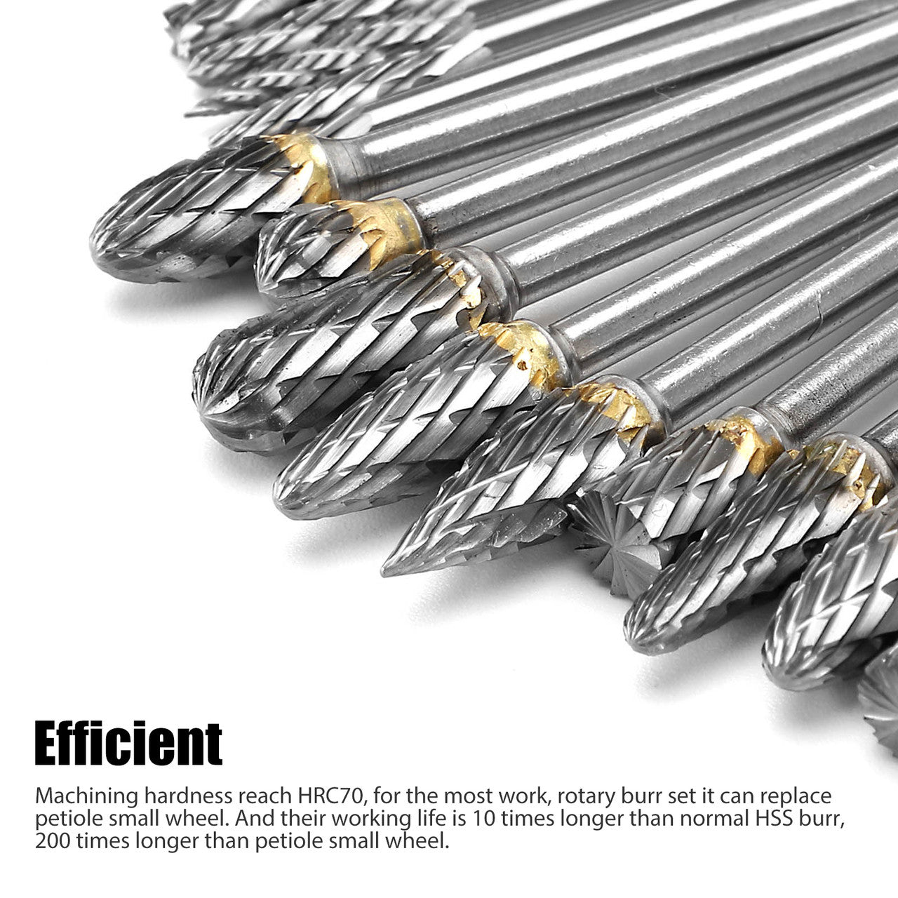 ✅Efficient: Machining hardness reach HRC70, for the most work, rotary burr set it can replace petiole small wheel. And their working life is 10 times longer than normal HSS burr, 200 times longer than petiole small wheel.