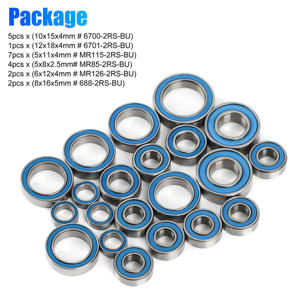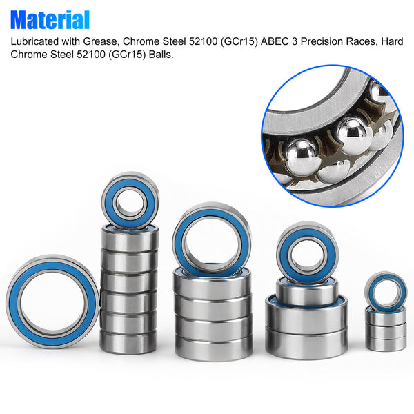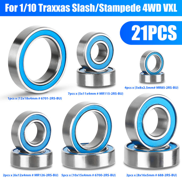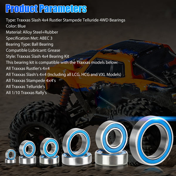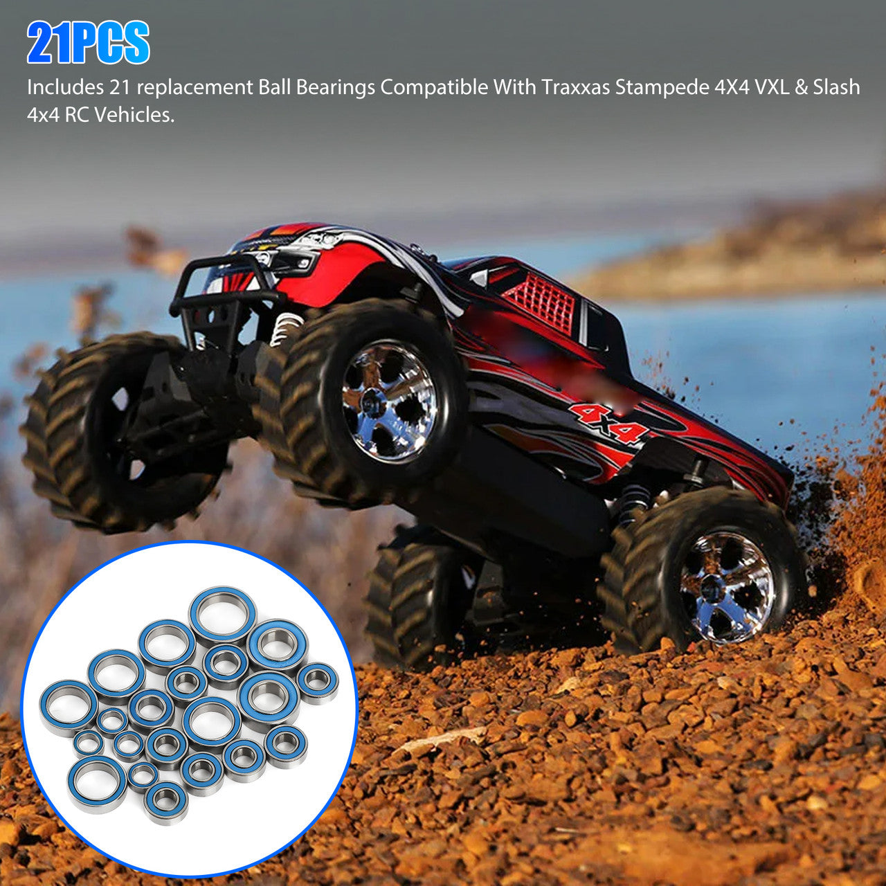 Product Features:● This is a bearing kit Compatible With all versions of the Traxxas Stampede 4X4 (VXL and Standard) and Traxxas Slash 4x4 and models based on the same frame (e.g. Rally, Telluride). ● Includes 21 replacement Ball Bearings Compatible With Traxxas Stampede 4X4 VXL & Slash 4x4 RC Vehicles ● Lubricated with Grease, Chrome Steel 52100 (GCr15) ABEC 3 Precision Races, Hard Chrome Steel 52100 (GCr15) Balls ● Rubber Sealed Ball Bearings have maximum protection and are ideal for off-road racing. They protect well against exposure to dust, dirt, and moisture, which can destroy bearings ● Fits All 1/10 Versions Traxxas Slash 4WD VXL & Traxxas Stampede 4WD VXL