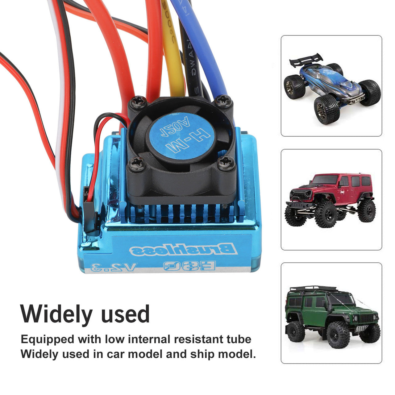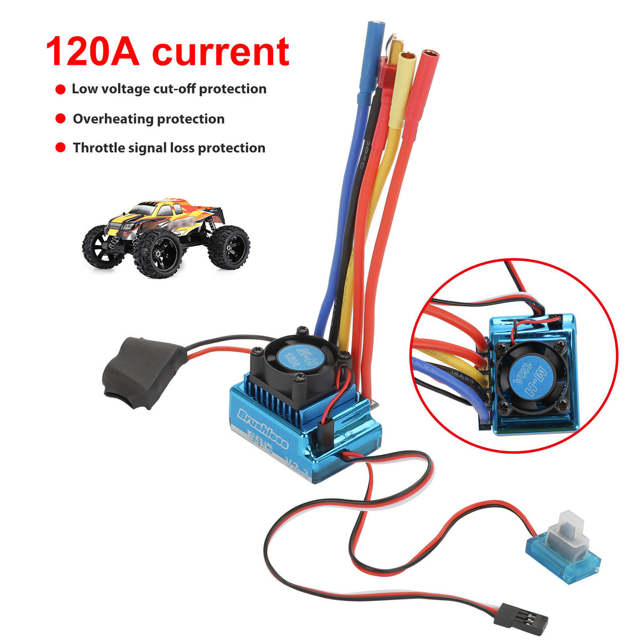 120A continuous current, transient current 760A, support the 2-3 lithium battery or 4-9 Ni MH battery. BEC output: 5V/3A, switch mode.