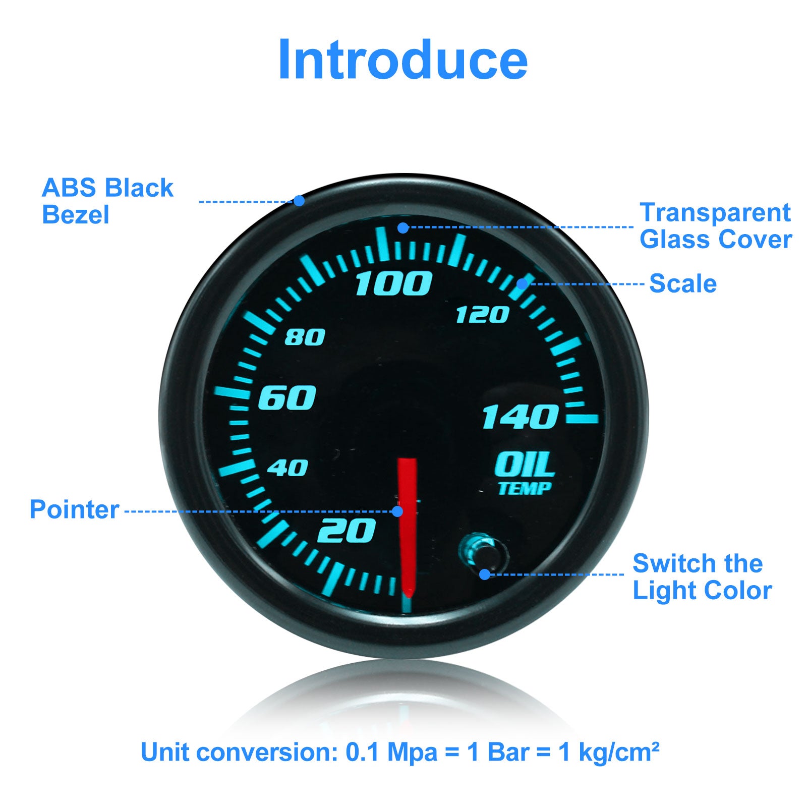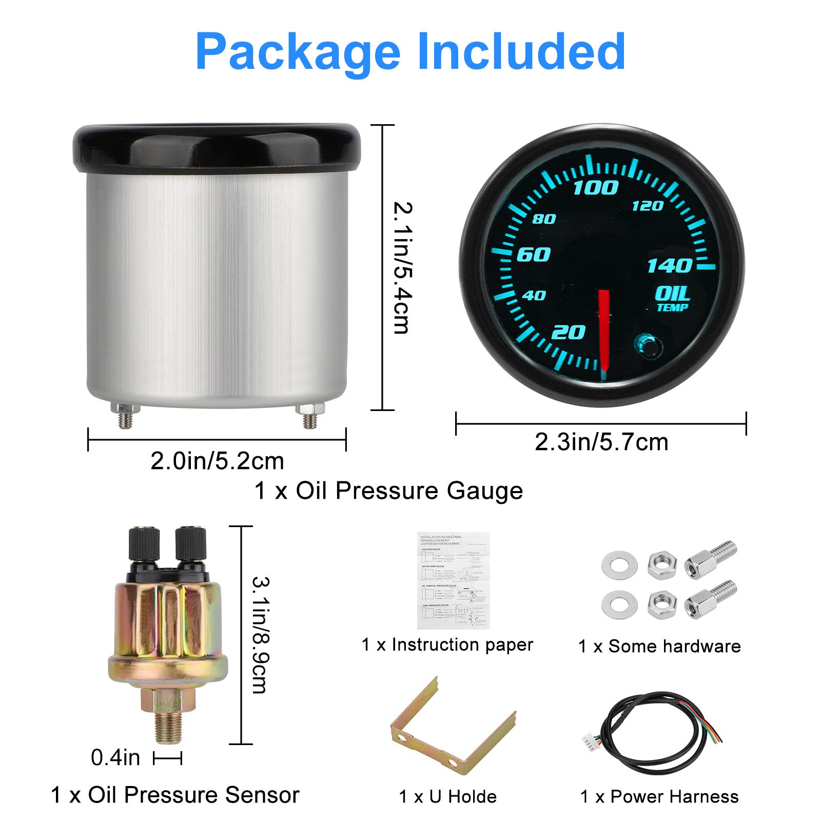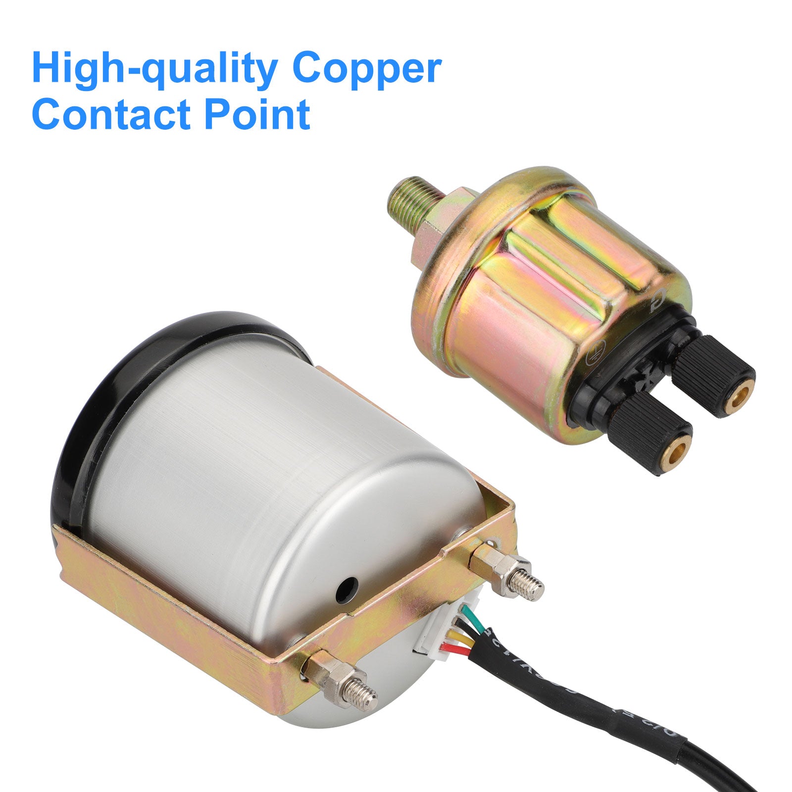 Upgrade your vehicle with this 2” / 52mm black face Oil Pressure Gauge featuring a high-quality copper contact point for enhanced conductivity and durability. This gauge efficiently monitors and displays oil pressure from 0 to 140 PSI. Customize your dashboard with seven LED colors, ensuring improved nighttime visibility and a personalized interior. Designed for easy installation in 12V vehicles, this gauge includes all necessary components for a hassle-free setup.