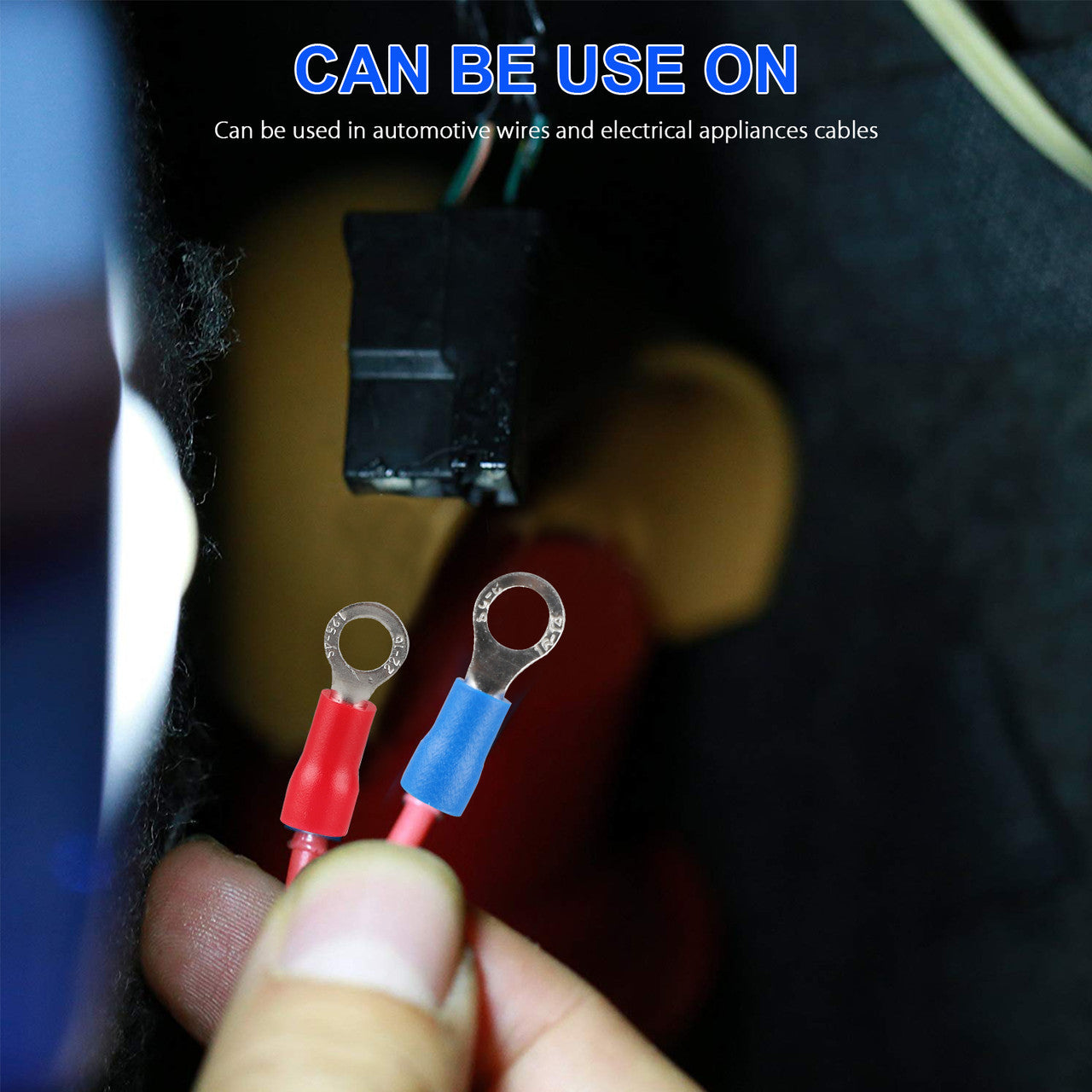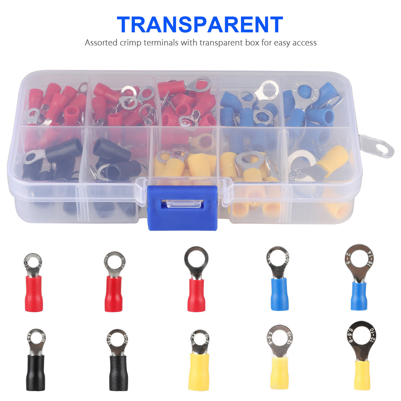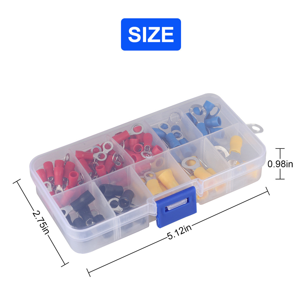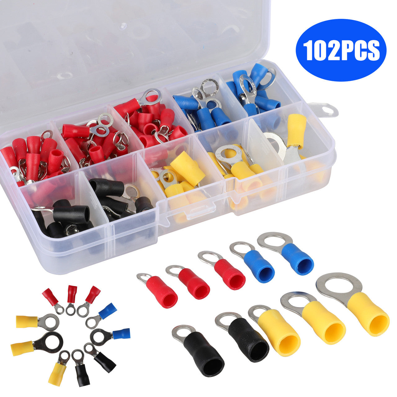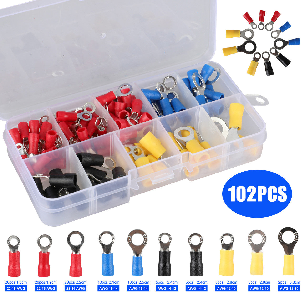 102pcs assorted crimp terminals including: * RV1.25-3 #4 3.2mm (20PCS RED) * RV1.25-4 #8 4.3mm(20PCS RED) * RV1.25-5 #10 5.3mm (20PCS RED) * RV2-5 #10 5.3mm (10PCS BLUE) * RV2-6 1/4 6.5mm (10PCS BLUE) * RV3.5-4 #8 4.3mm (5PCS BLACK) * RV3.5-5 #10 5.3mm (5PCS BLACK) * RV5.5-4 #8 4.3mm (5PCS YELLOW) * RV5.5-6 1/4 6.5mm (5PCS YELLOW) * RV5.5-8 5/16 8.4mm (2PCS YELLOW)
