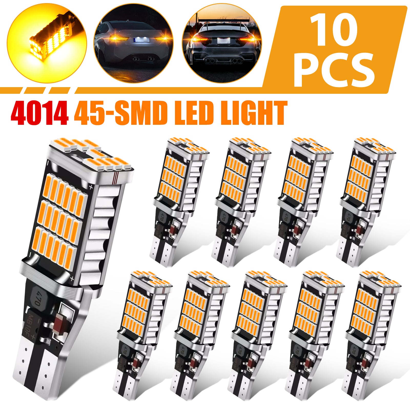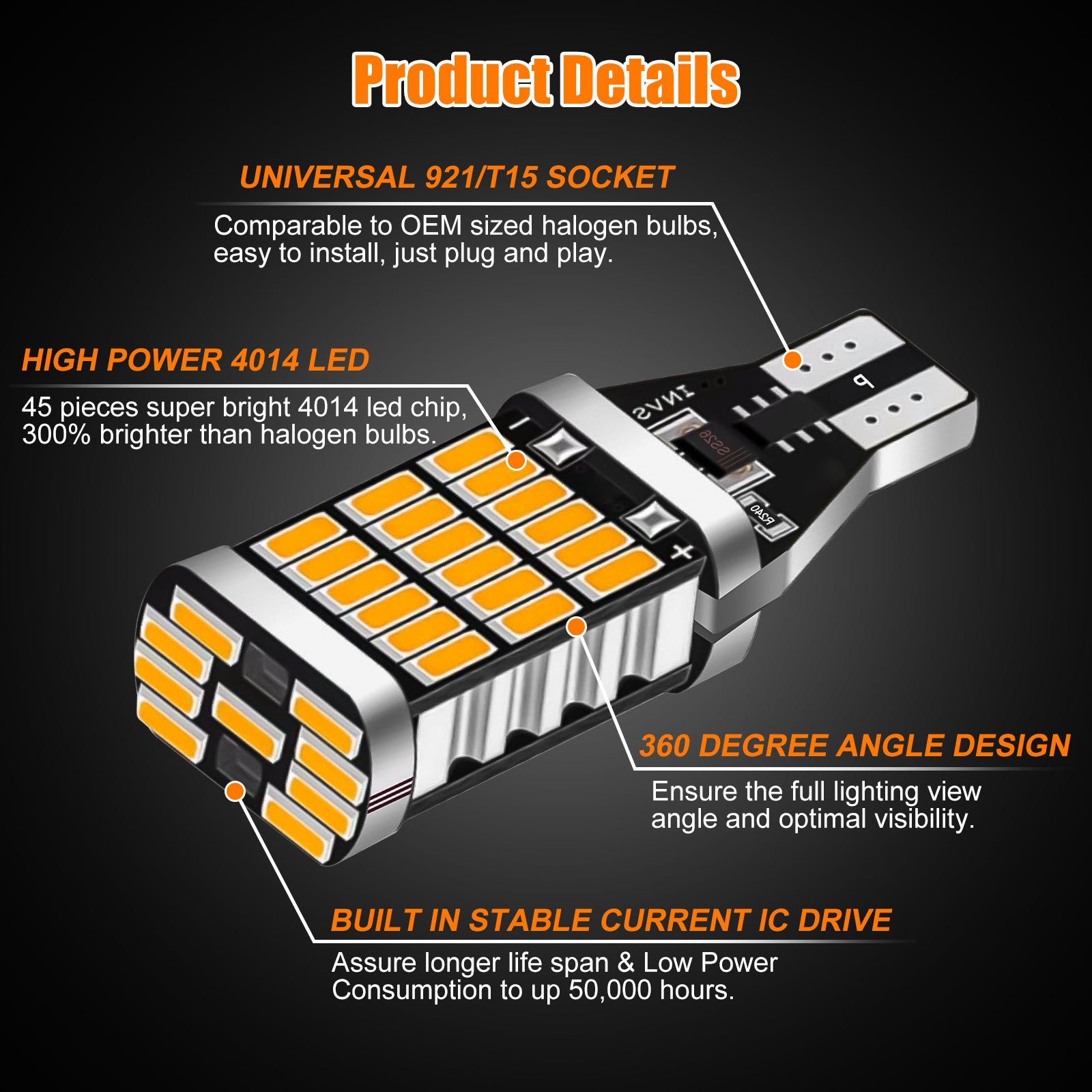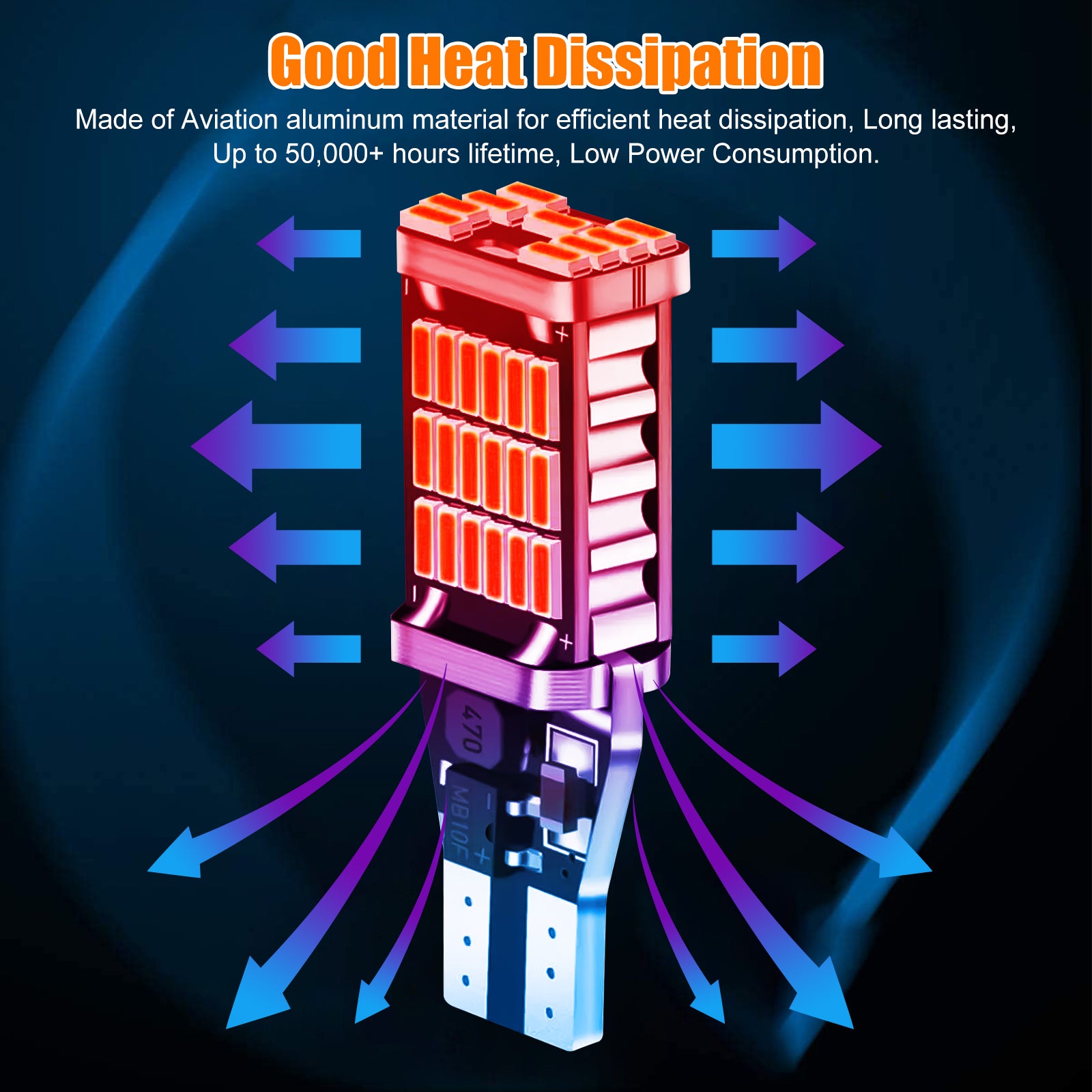 Illuminate your vehicle with 10 high-brightness T15 LED bulbs, featuring 45pcs 4014 bulb chips for 1200 lumens of light. The aviation aluminum build ensures efficient heat dissipation and longevity, with a lifespan of over 50,000 hours. Easy plug-and-play installation, non-polarity design, and wide application as backup reverse lights. Enhance visibility for safer driving, especially during backup and reversing maneuvers.