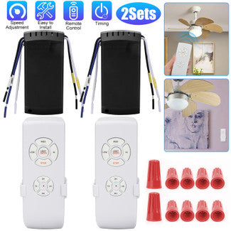 Enhance your ceiling fan experience with the Universal Ceiling Fan Remote Control Kit. Designed for compatibility with most standard ceiling fan lights (including Harbor Breeze, Hunter, Hampton Bay, Lichler, and other brands), this kit enables you to effortlessly transform your regular fan into a convenient remote-controlled unit. Enjoy the convenience of 3-speed options (High/Medium/Low) and 4 timing settings (1H/2H/4H/8H), all without the need for removing the light kit or blades. The ON/OFF button effectively controls the light (no dimming). The beep sound feature can be adjusted by holding the "STOP" button. Installation is hassle-free through a straightforward 5-wire hookup that powers the remote and fan control. The package includes 2 wireless receivers, controllers, wall holders, connectors, and user manuals.