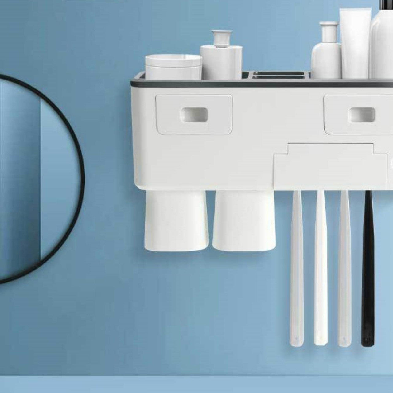 Multifunctional Wall Mounted Toothbrush Holder, with Magnetic Cups and Cosmetic Drawers Organizers