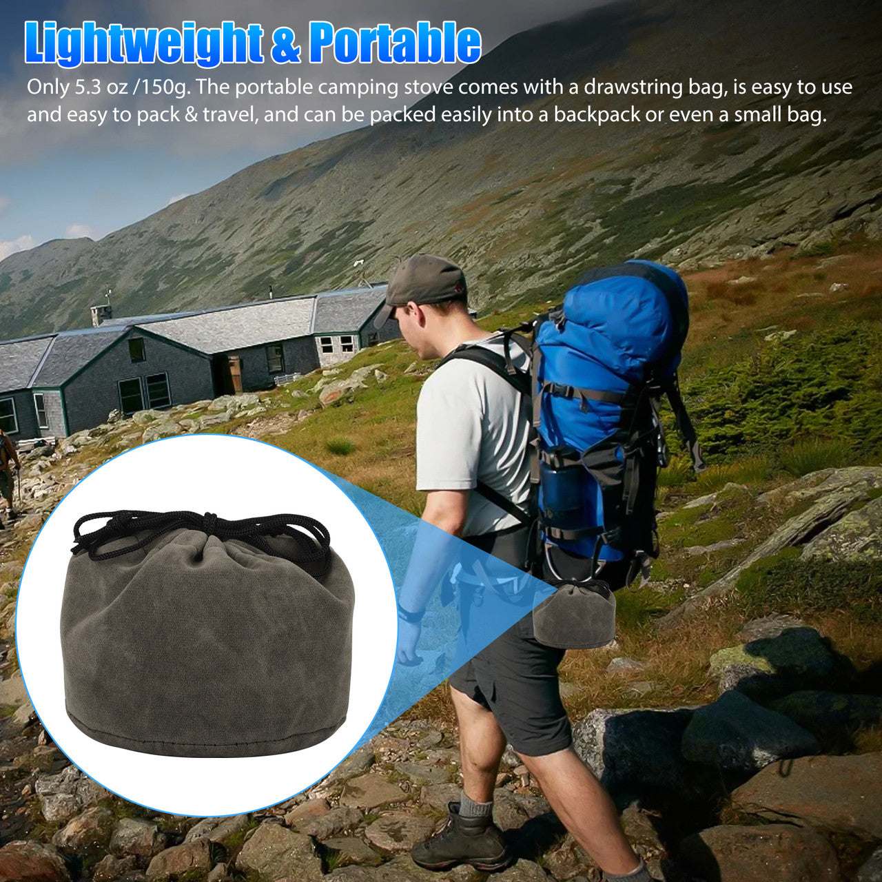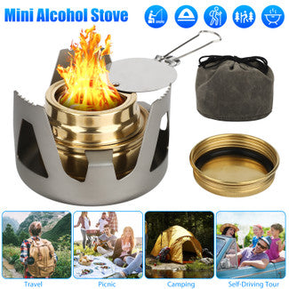 Product Features:● Material: The alcohol camping stoves are made of aluminum alloy stove stand and brass alcohol burner, the base with wind screen which can keep the stove stable and support pots and pans. ● Lightweight & Portable: Only 5.3 oz /150g. The portable camping stove comes with a drawstring bag, is easy to use and easy to pack & travel, and can be packed easily into a backpack or even a small bag. ● Variable Temperature Control: Mini alcohol stove with a foldable handle on the flame regulator to control and extinguish the flame, directly used with outdoor cookware. And also the rubber seal which prevents alcohol leaks and evaporation. ● Efficient: Combustion holes around the burner increase the air ventilation, and high combustion efficiency. Quiet and clean, enjoy your cooking time! camping stove just large enough for a small pan, cooking pot, heatable coffee mug or cup. ● Size: 3.7"L x 3.7"W x 2.6"H. Burns symmetrically. Seals up reliably with fuel stored inside. The backpacking stoves are is a great backup fuel source and perfect for camping and emergencies do not use any type of alcohol.