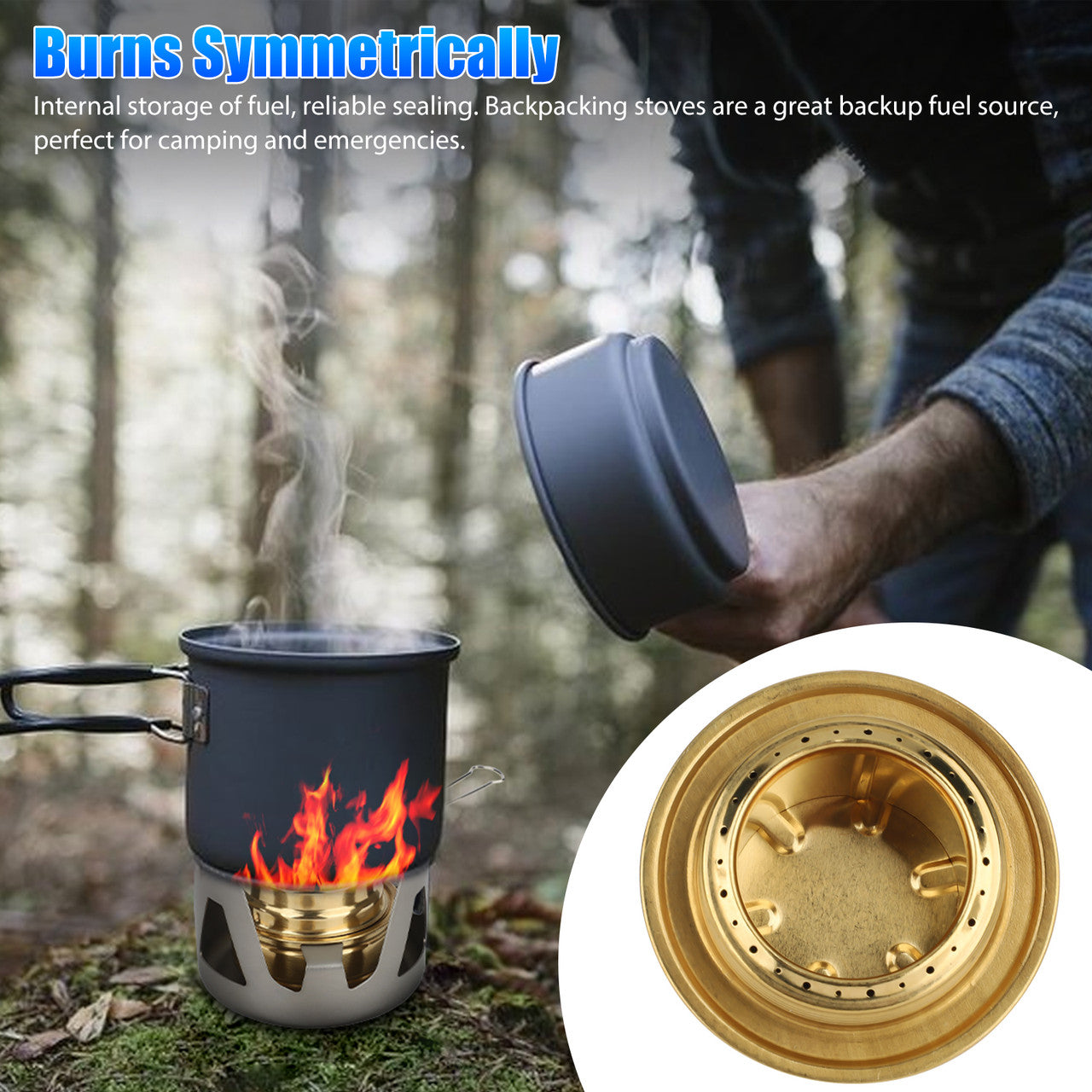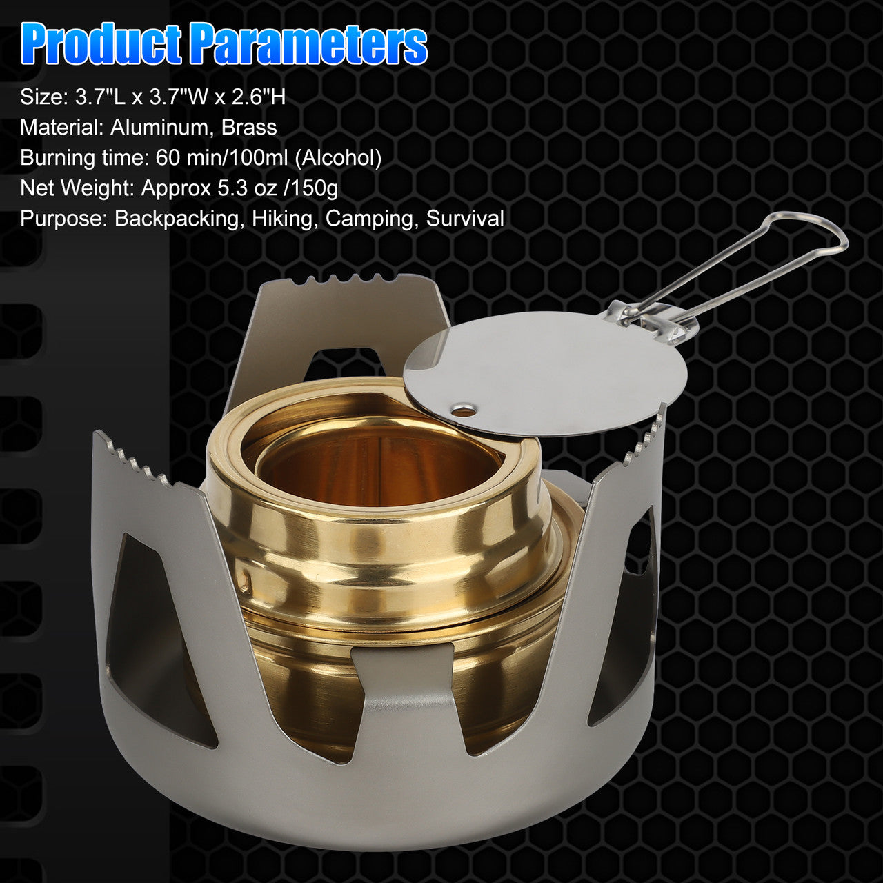 Product Specifications:✅Material:Aluminum, Brass✅Size:3.7"L x 3.7"W x 2.6"H✅Burning time:60 min/100ml (Alcohol)✅Net Weight:Approx 5.3 oz /150g✅Purpose:Backpacking, Hiking, Camping, Survival