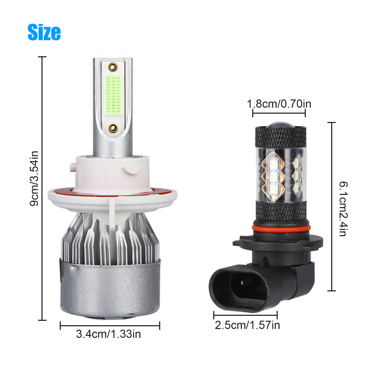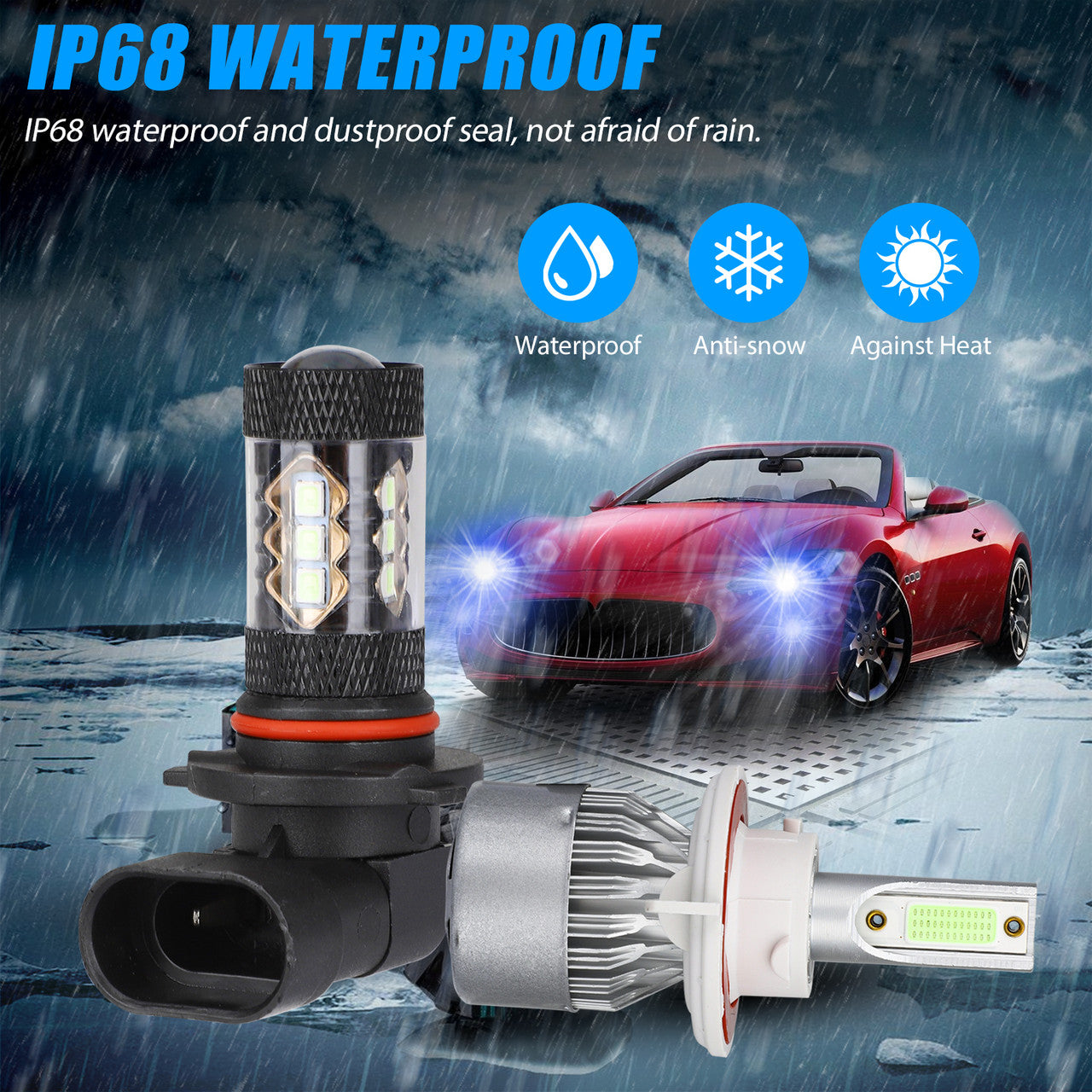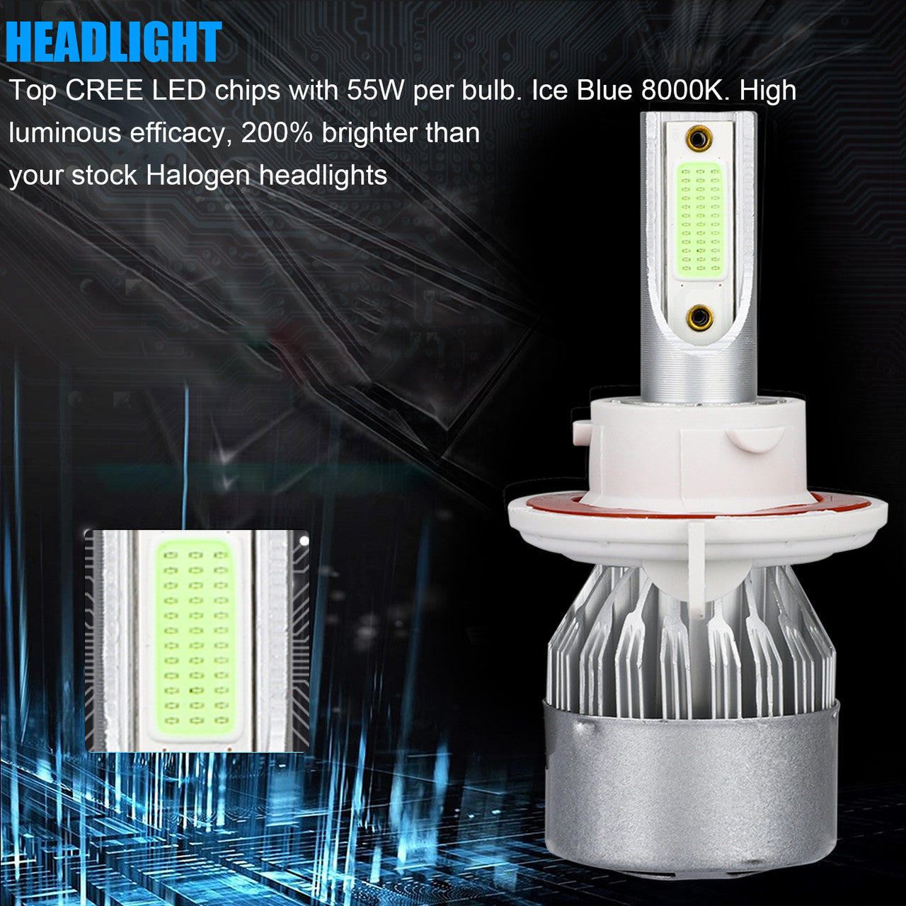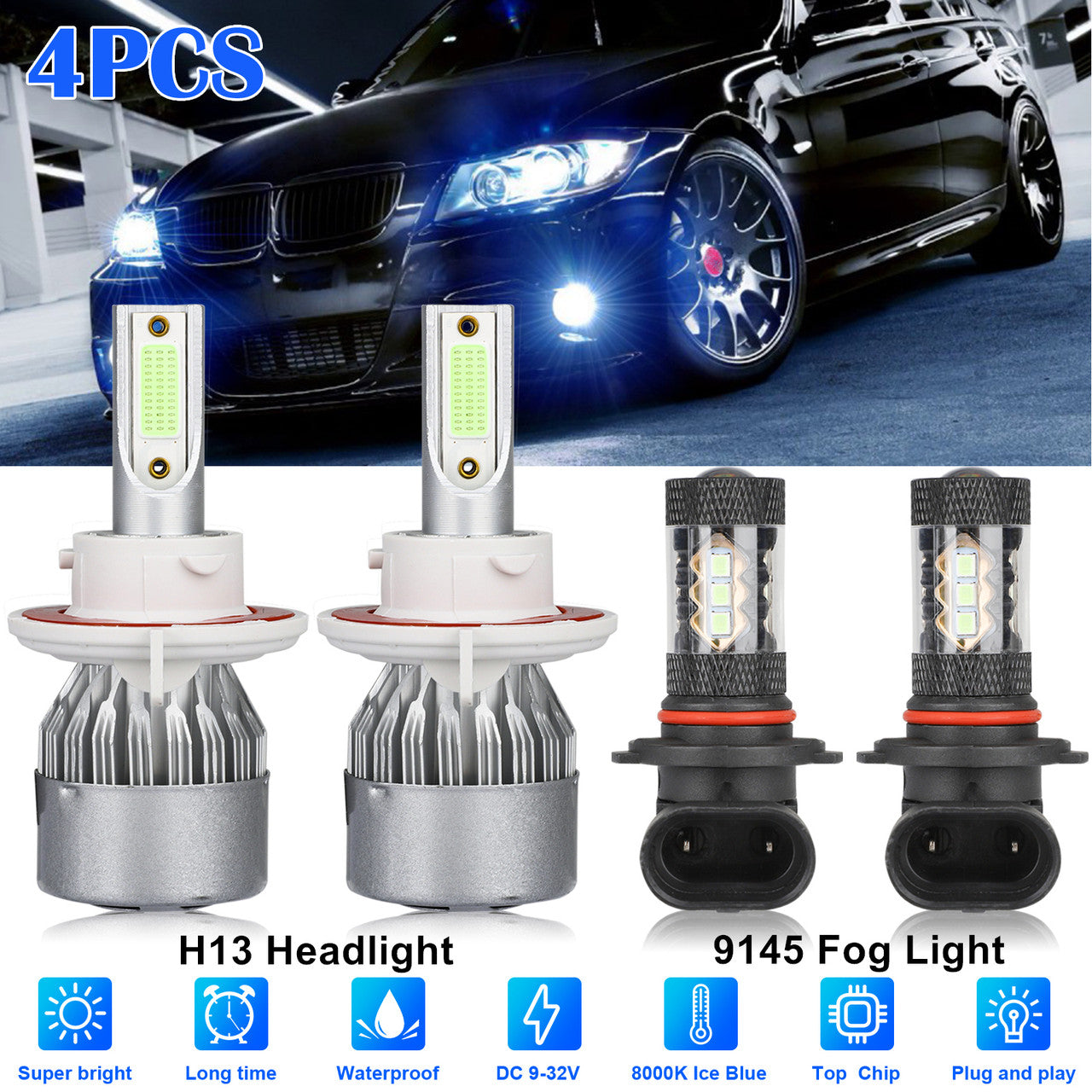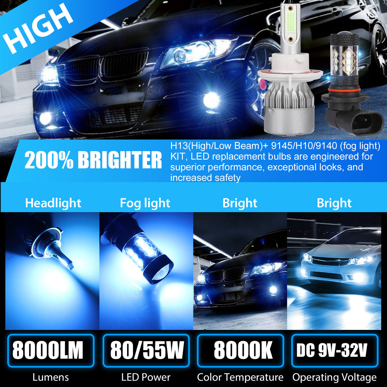 Product Features:● H13(High/Low Beam)+ 9145/H10/9140 (fog light) KIT, LED replacement bulbs are engineered for superior performance, exceptional looks, and increased safety. ● Especially designed for upgrading the Headlight, Fog light, and Daytime Running Light. ● Headlight: Top CREE LED chips with 55W per bulb. Ice Blue 8000K. High luminous efficacy, 200% brighter than your stock Halogen headlights.