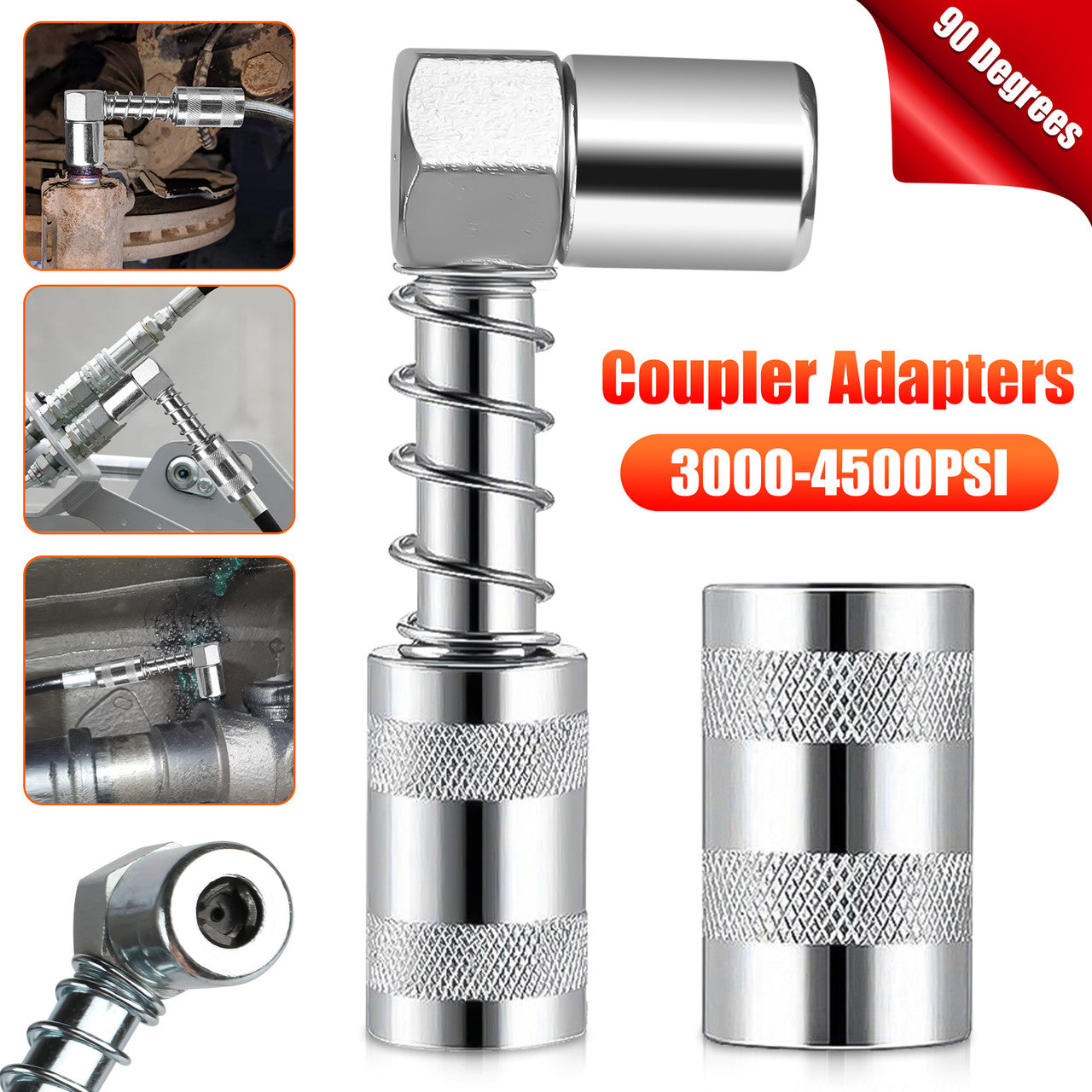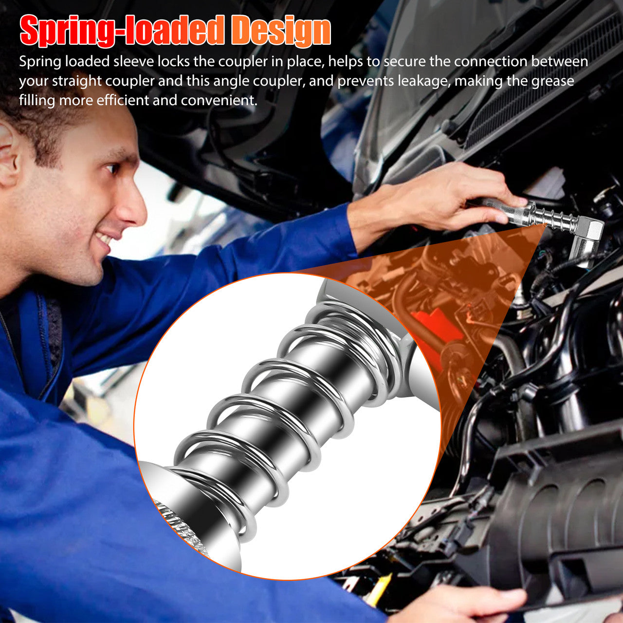Product Features:● Reliable material: Made of quality carbon steel material, the surface is galvanized, which can prevent corrosion to the largest extent and has a longer service life, is durable and sturdy, not easy to break, and can be applied for the long term. ● Spring-loaded design: Spring loaded sleeve locks the coupler in place, helps to secure the connection between your straight coupler and this angle coupler, and prevents leakage, making the grease filling more efficient and convenient. ● Easy to operate: This grease coupler is designed at 90 degrees, can grease hard-to-reach fittings in tight spaces, is convenient for you to connect some difficult fittings, and the 3 Jaw coupler design snaps on and off grease fittings easier. ● Multiple functions: The 90-degree crease coupler can be applied for auto, farm, truck, or industrial use, good for hard-to-reach grease fittings on cars, trucks, farm equipment, and more, it can be also suitable for most hand-operated grease tools, with working pressure range for 3000-4500PSI.