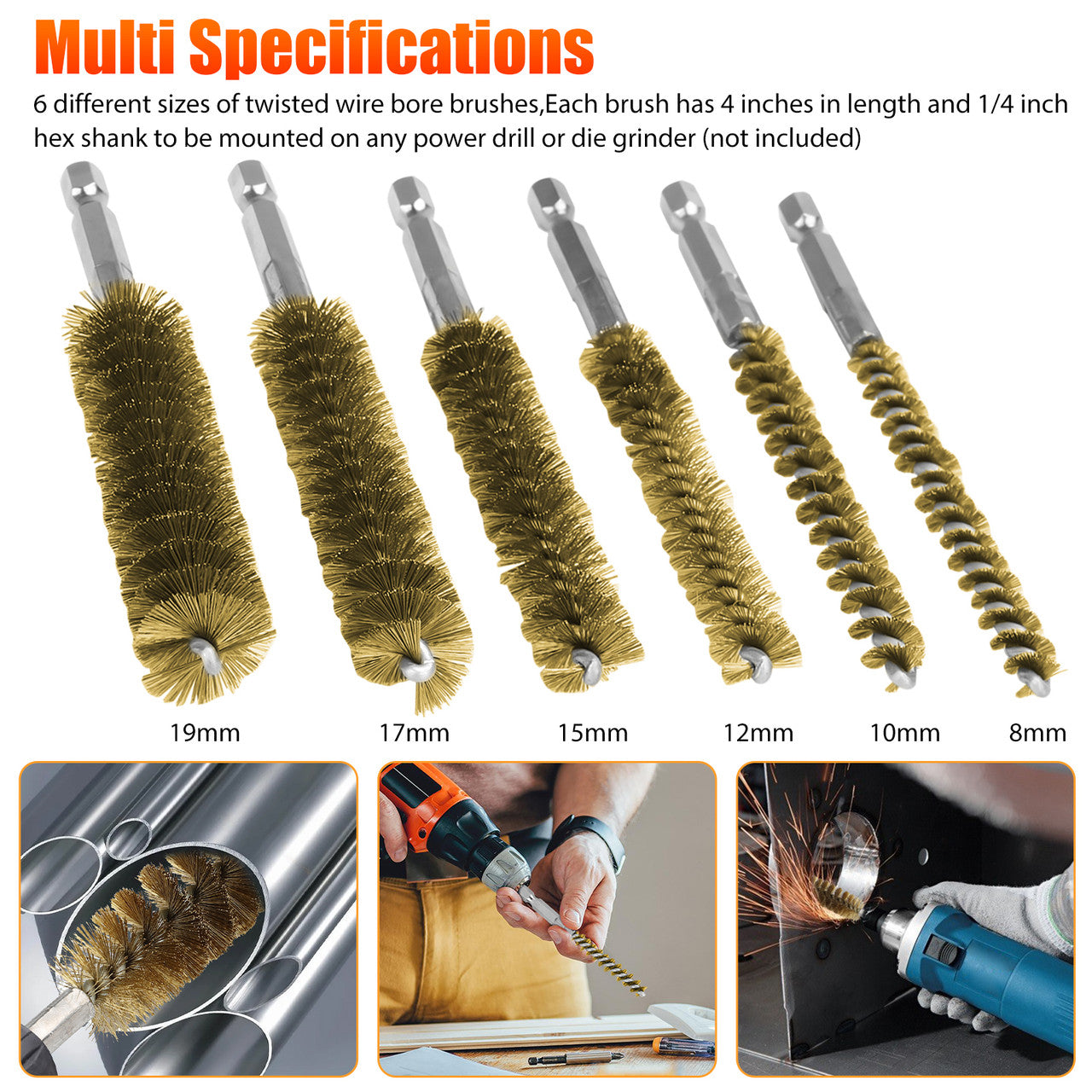 Effortlessly clean, polish, and remove rust with our durable brass bore brushes. Designed for narrow spaces, these 4-inch brushes in 6 sizes offer versatile applications in automotive, machining, and more. Package includes 6 brushes with handles.