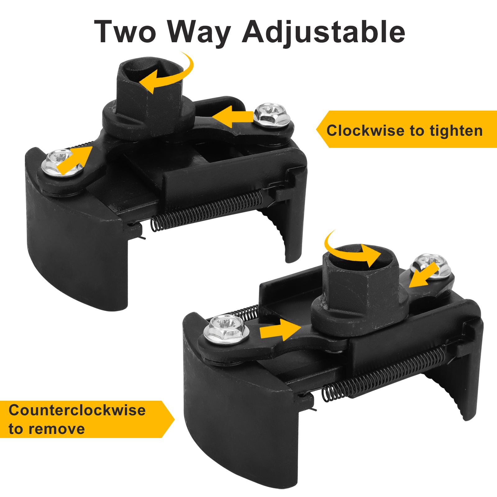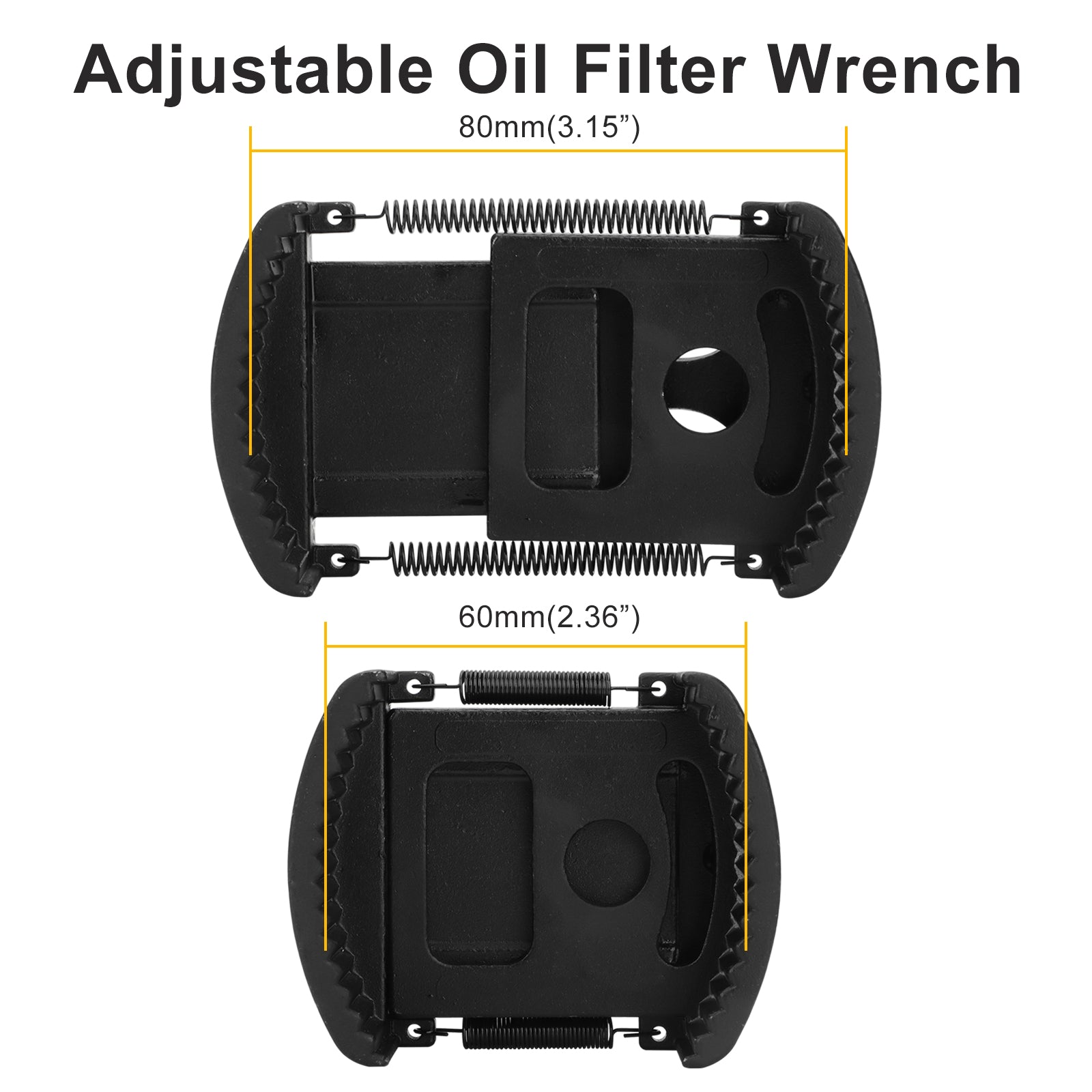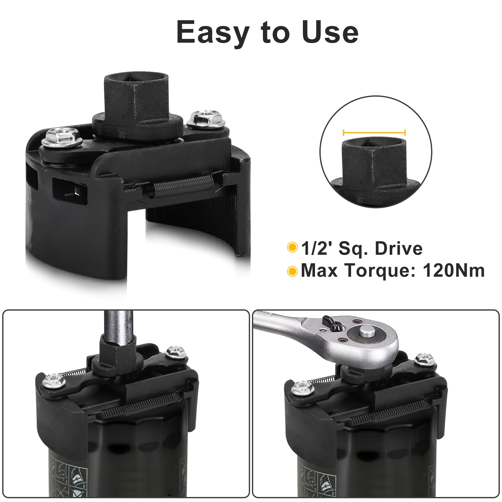 Introducing our heavy-duty Adjustable Oil Filter Wrench, the perfect tool for mechanics and DIY car enthusiasts alike. This wrench is designed to efficiently remove and install oil filters with diameters ranging from 2.36 to 3.15 inches. Its 1/2 inch drive compatibility allows you to use it with various ratchets or torque wrenches, supporting up to 120 Nm of torque for robust performance.