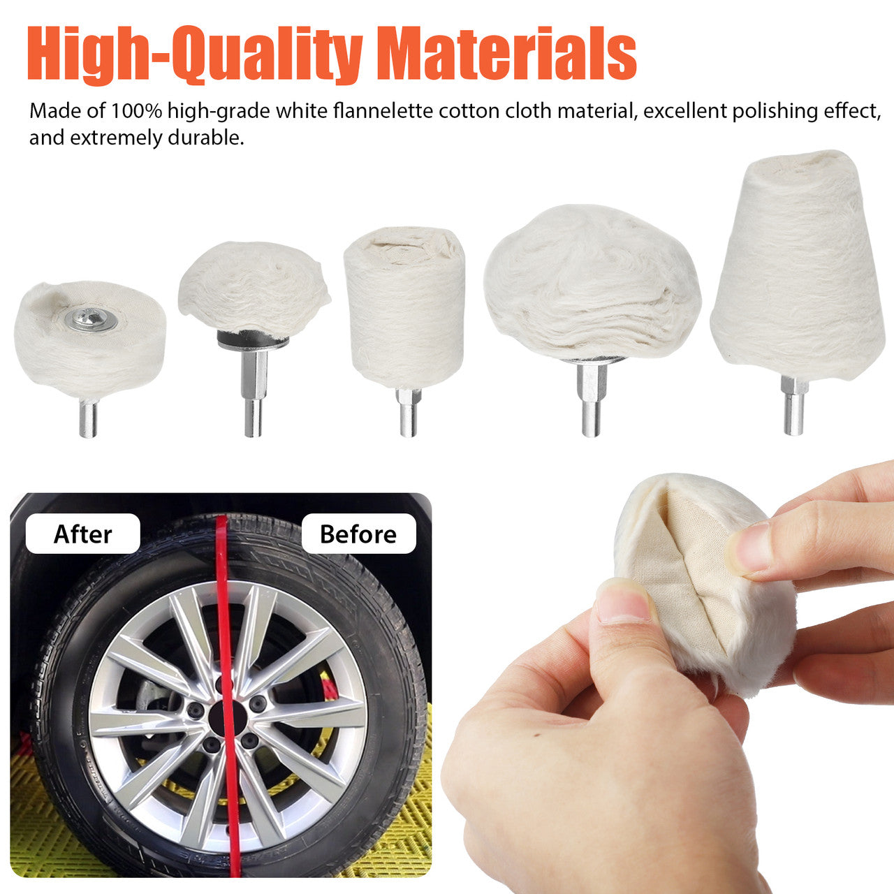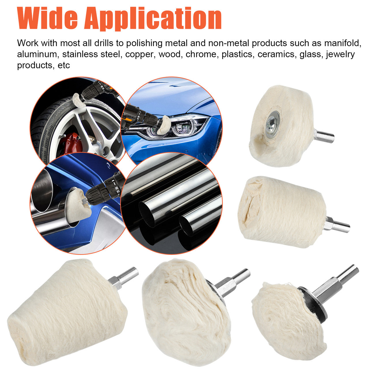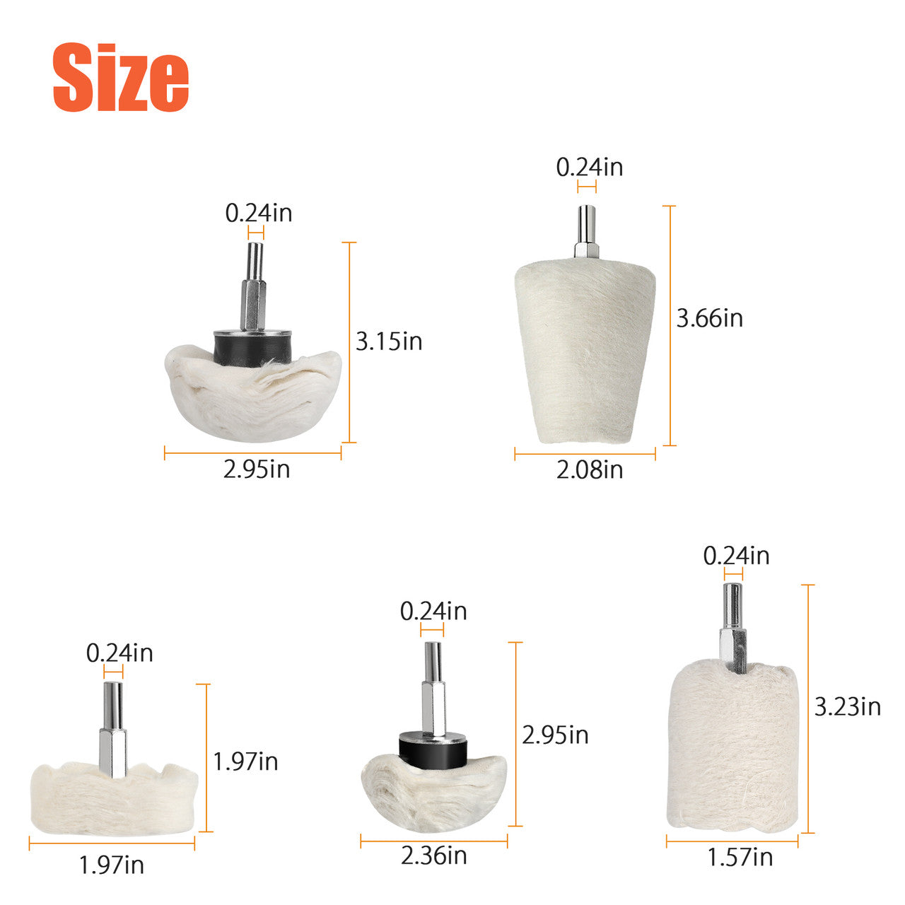 Include: 2Pcs mushroom buffing wheel, 2Pcs cylindrical buffing wheel, 1Pcs conical buffing wheel. (Total 5Pcs)