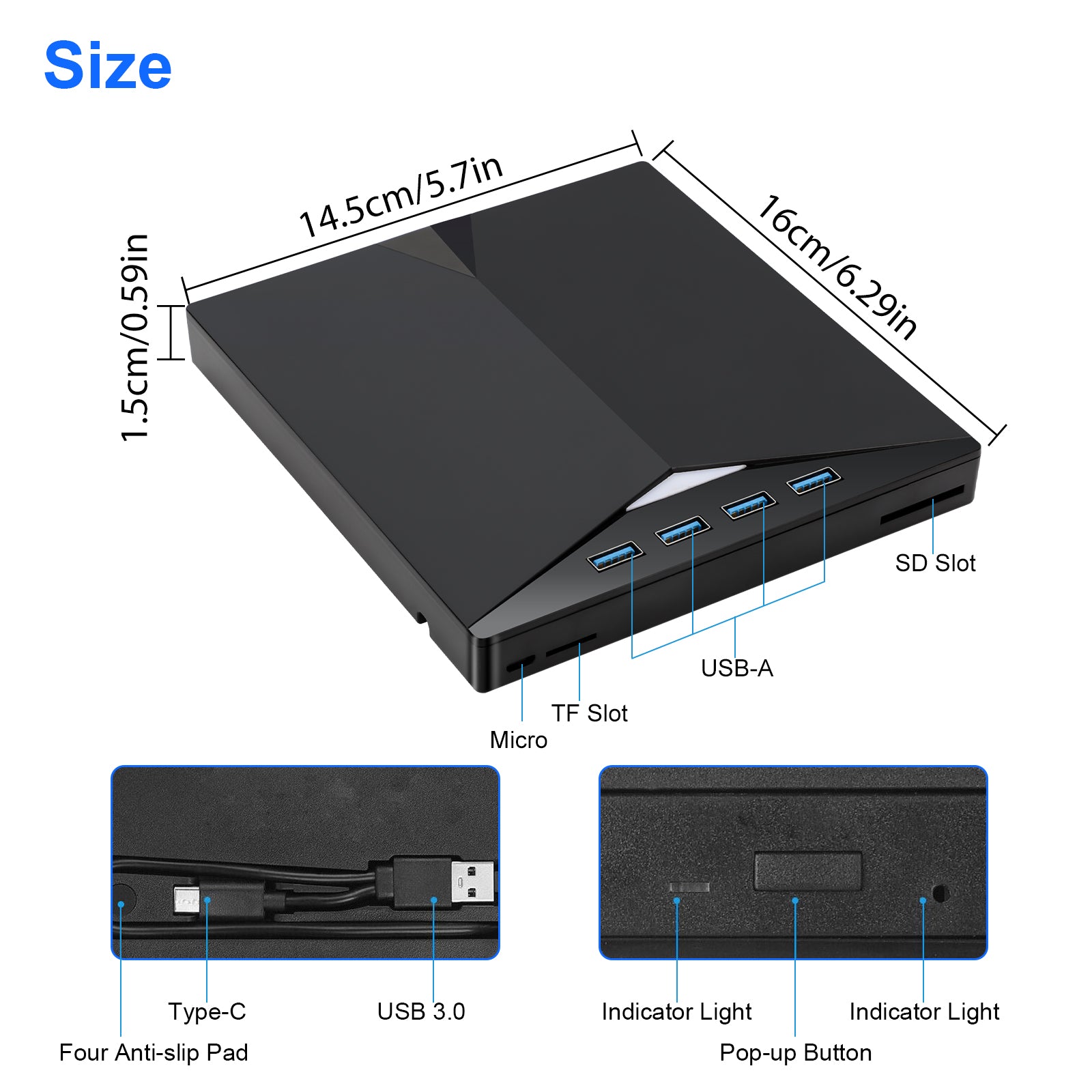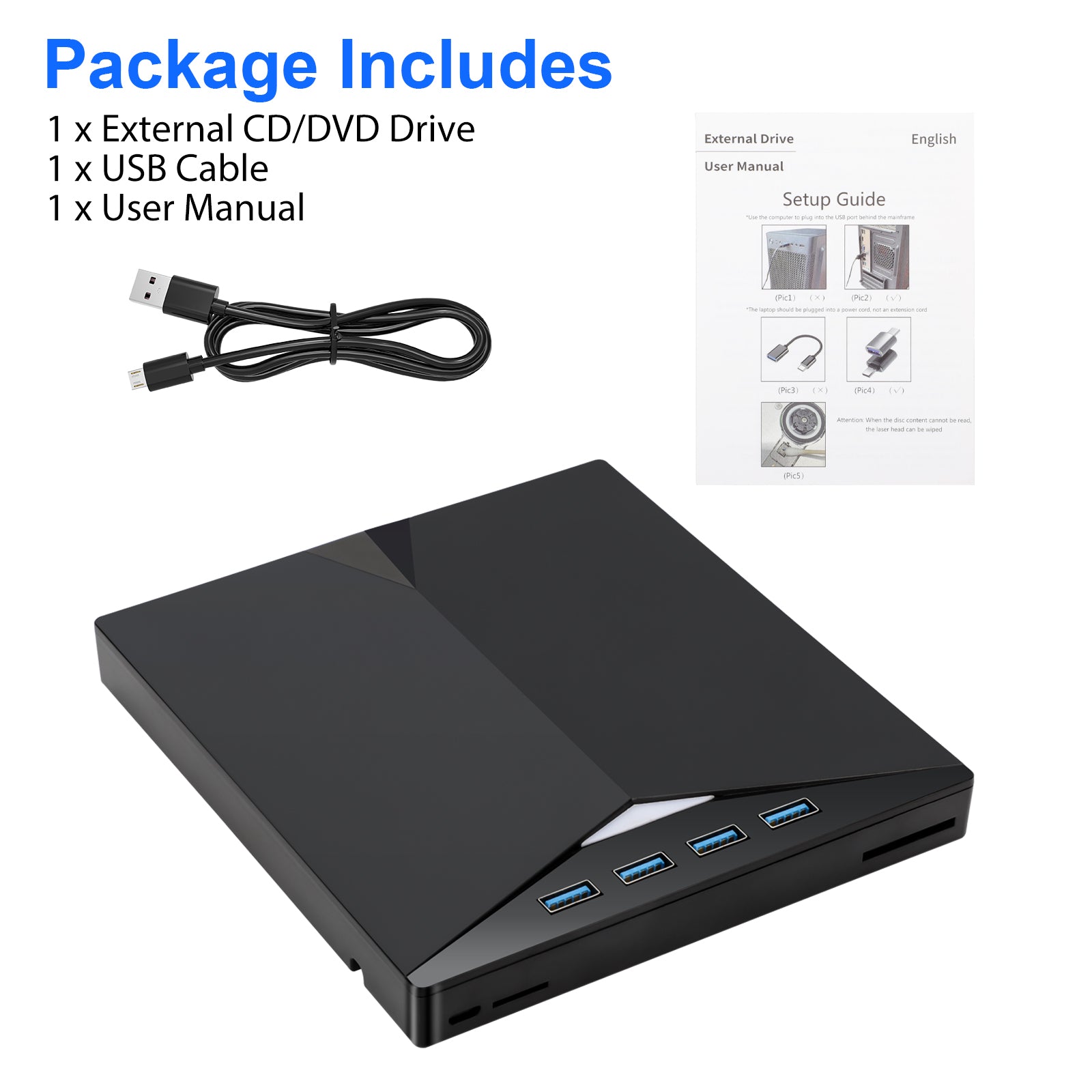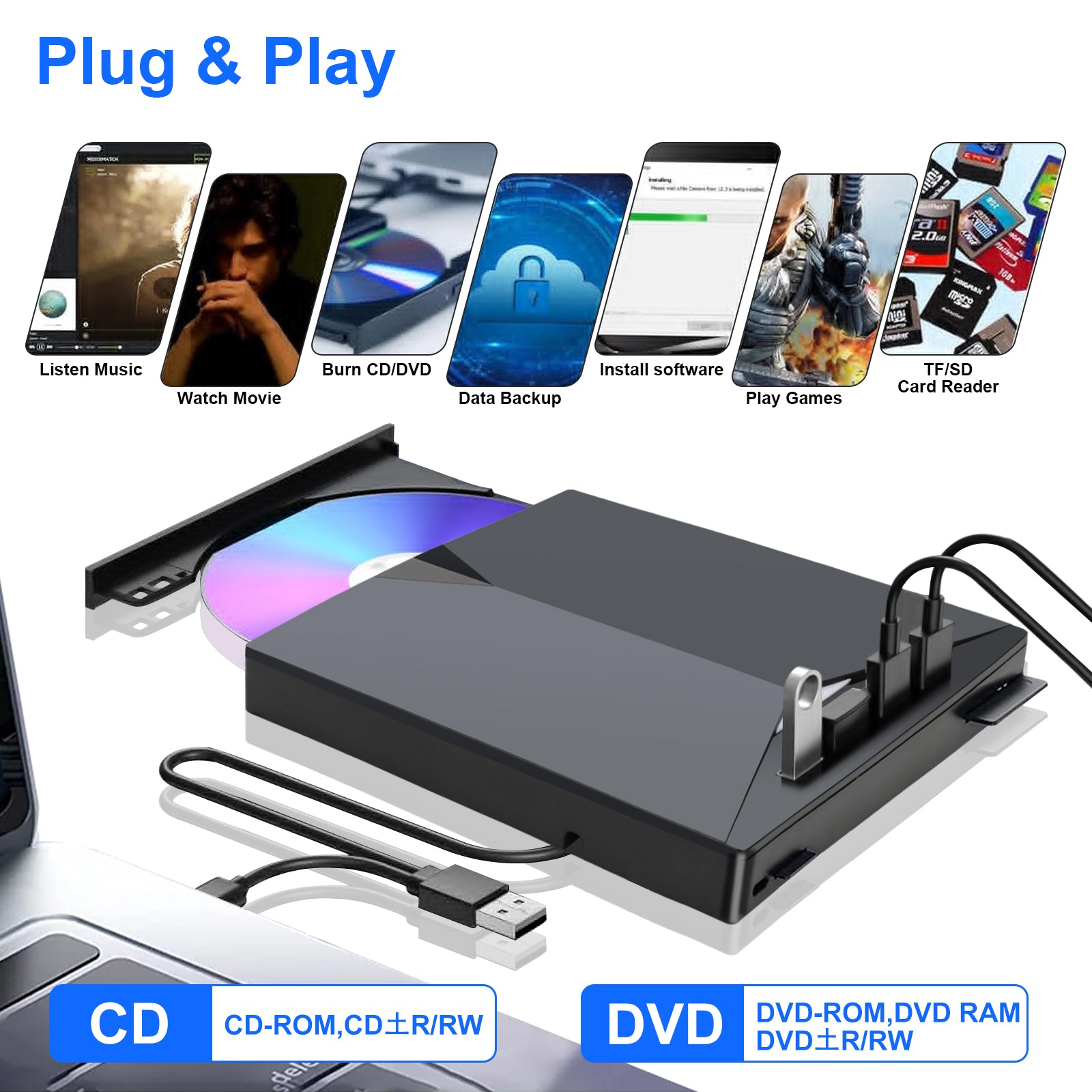 Elevate your digital experience with our versatile 7 IN 1 External DVD Drive, combining cutting-edge functionality with portability and convenience. This plug-and-play optical drive is a must-have for your laptop or desktop PC, offering a range of features that go beyond traditional CD/DVD reading.