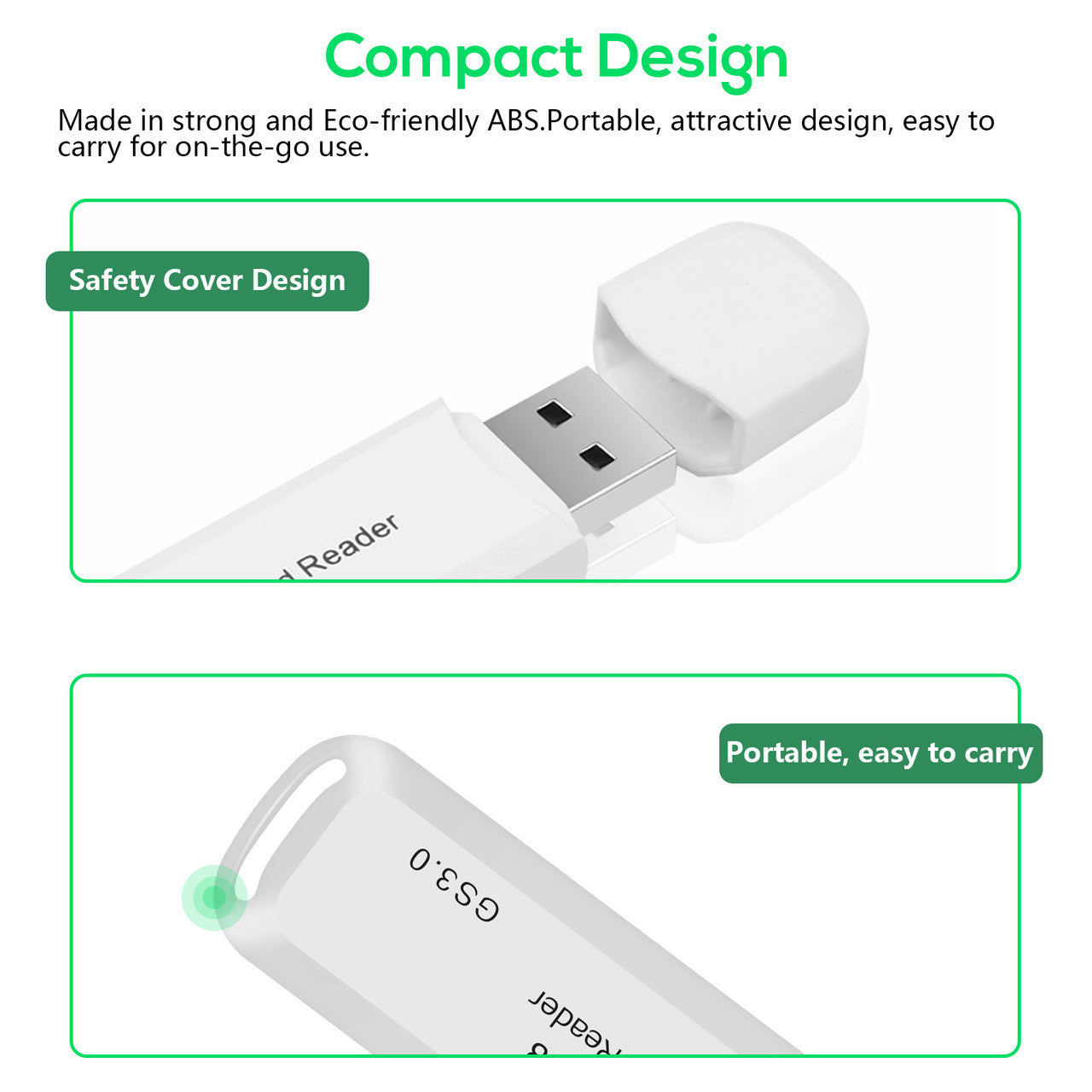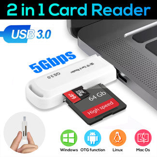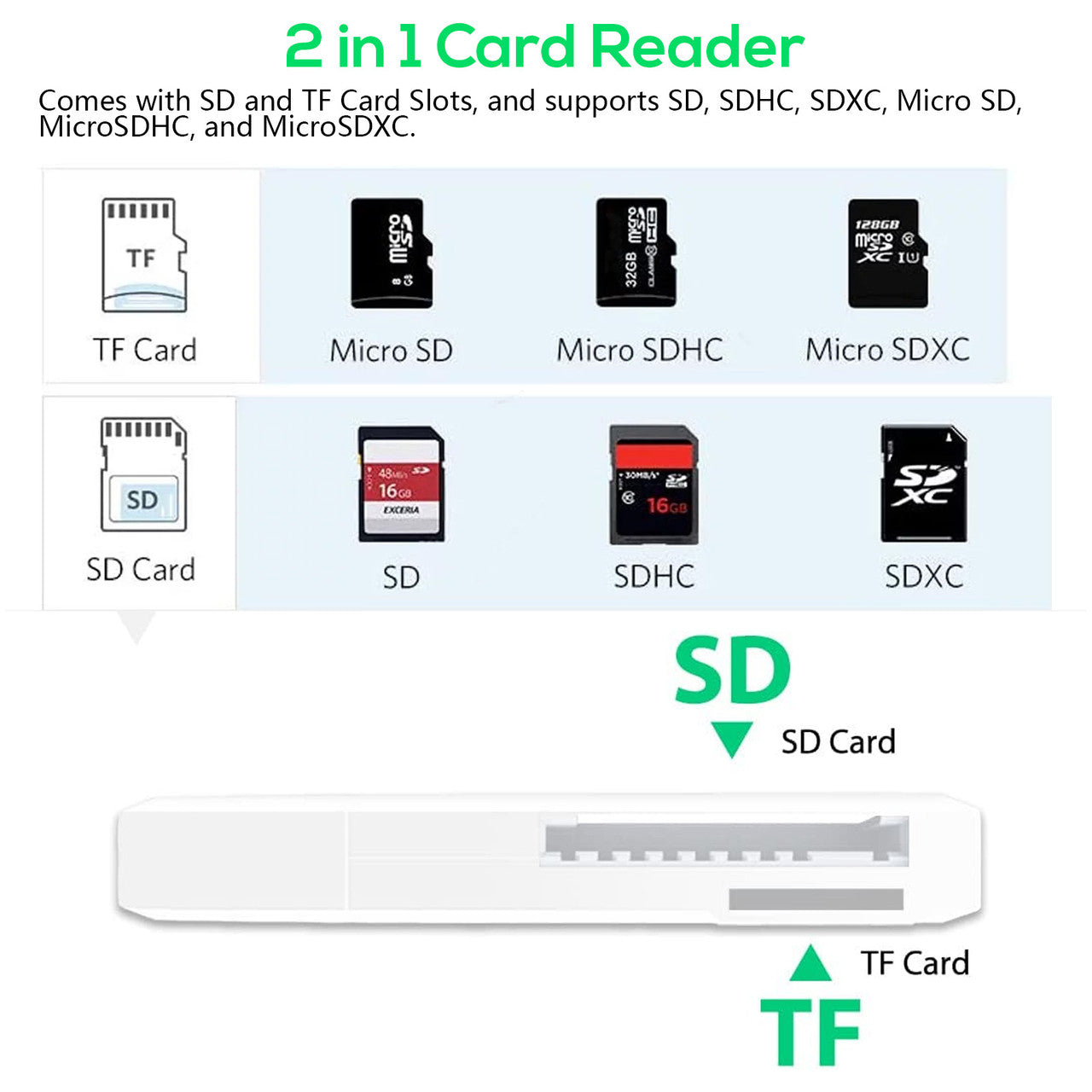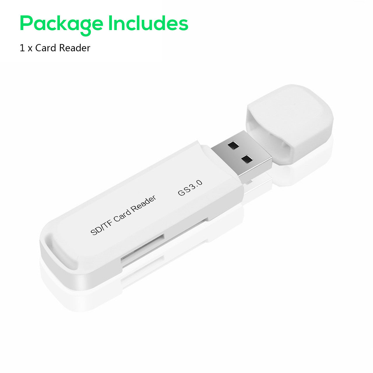 Product Specifications:✅Type: 2-in-1 USB3.0 SD Card Reader✅Material: ABS✅Color: White✅Size: 63*10*19mm✅Ports: SD Card & TF Card✅Support On: All OTG Device