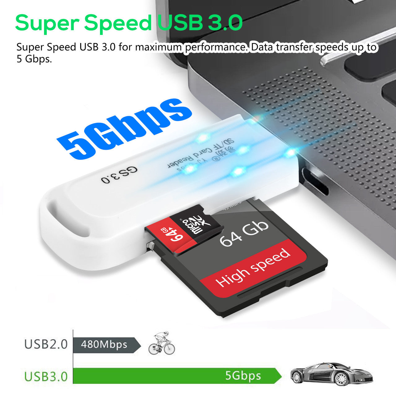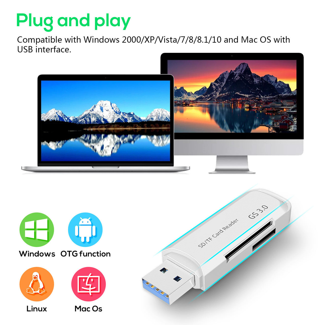 Product Features:● 100% brand new and high quality. Super Speed USB 3.0 for maximum performance. ● Data transfer speeds up to 5 Gbps. Backward compatible with USB 2.0/1.1. Comes with SD and TF Card Slots, and supports SDHC, SDXC, Micro SD, MicroSDHC, and MicroSDXC. ● Plug and play, No additional driver is needed. Compatible with Windows 2000/XP/Vista/7/8/8.1/10 and Mac OS with USB interface. ● Compact design, made in strong and Eco-friendly ABS. Powered by a USB port, no additional power supply is needed. ● Portable, attractive design, easy to carry for on the go use.