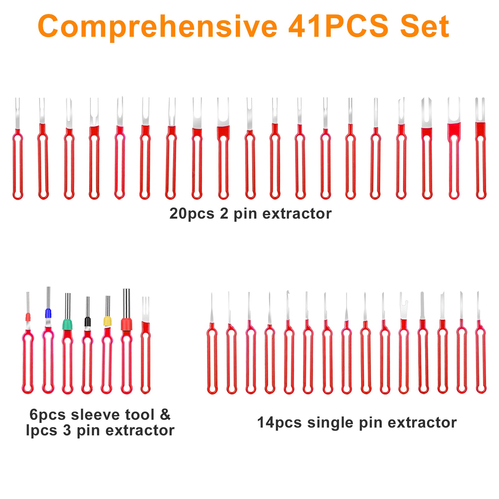 The 41 Pcs Terminal Removal Tool Kit offers unparalleled sturdiness and durability compared to the standard 0.6mm options. Whether you are a professional mechanic or a DIY enthusiast, this comprehensive set is your ally in effortlessly removing pins and terminals without bending, breaking, or causing damage. With an improved long handle for a comfortable grip, this kit ensures precise and damage-free work on wire harness connectors. Accompanied by a waterproof protective bag, your tools stay organized, sharpness-proof, and safe from children's reach.