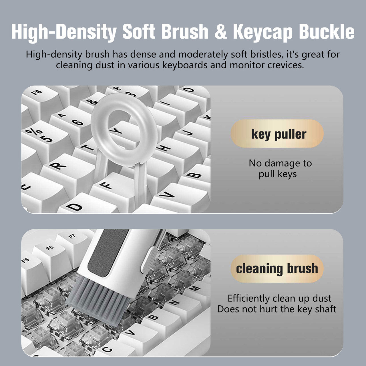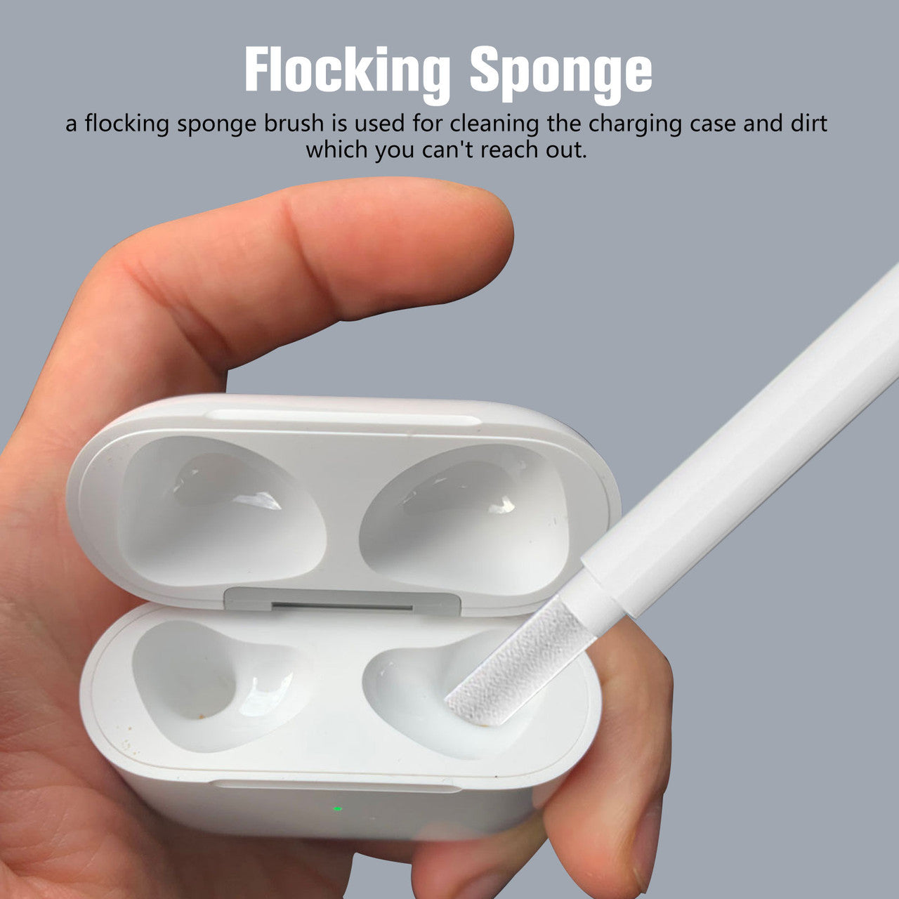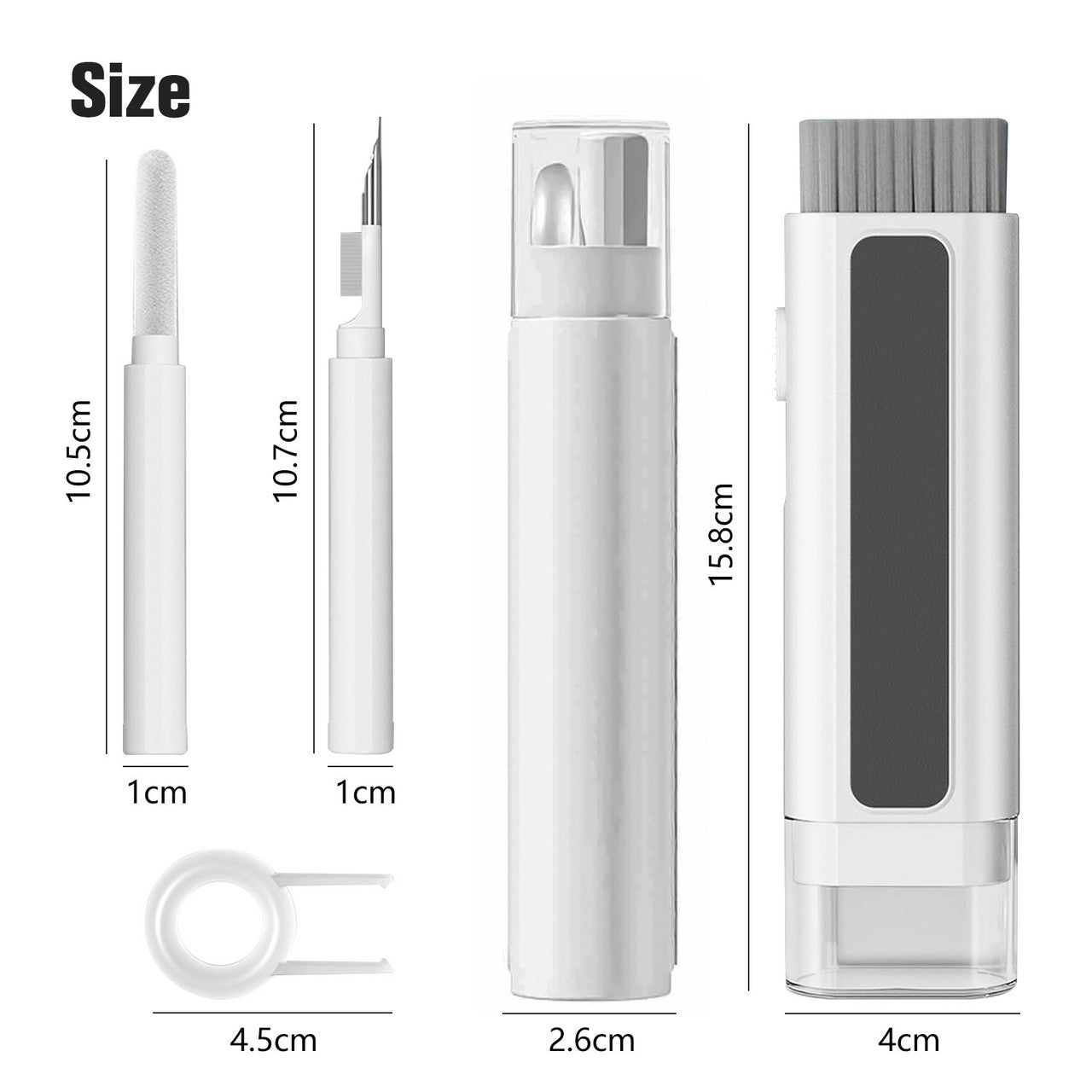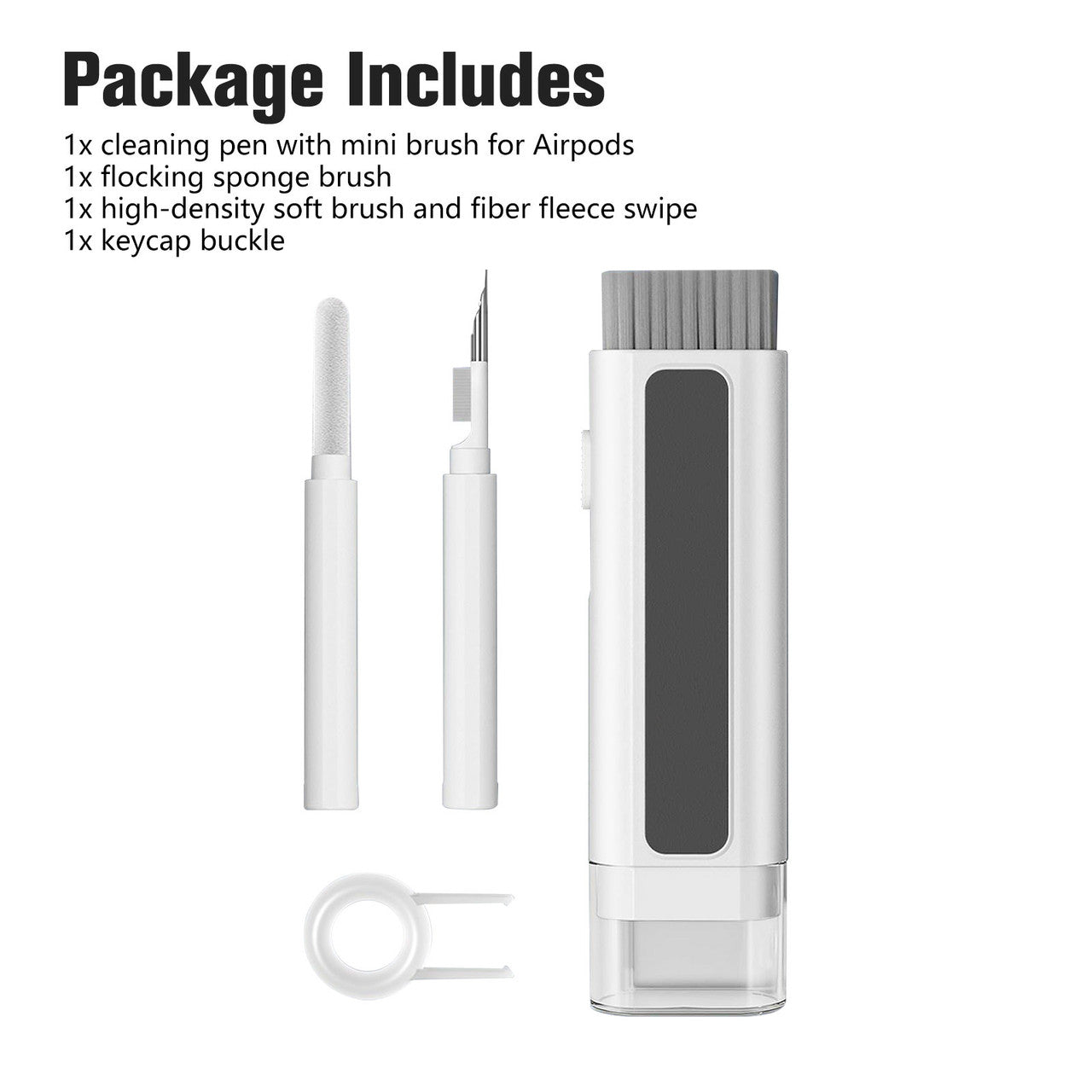 1 X cleaning pen with mini brush for Airpods 1 X flocking sponge brush1 X high-density soft brush and fiber fleece swipe1 X keycap buckle