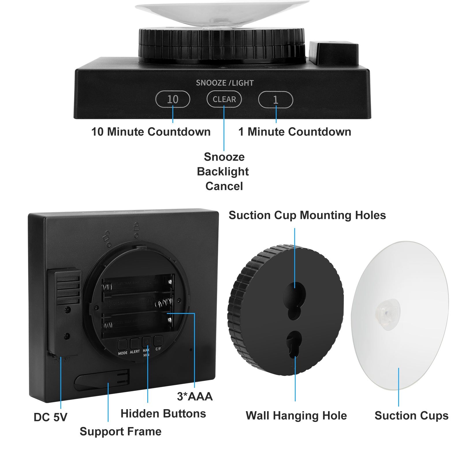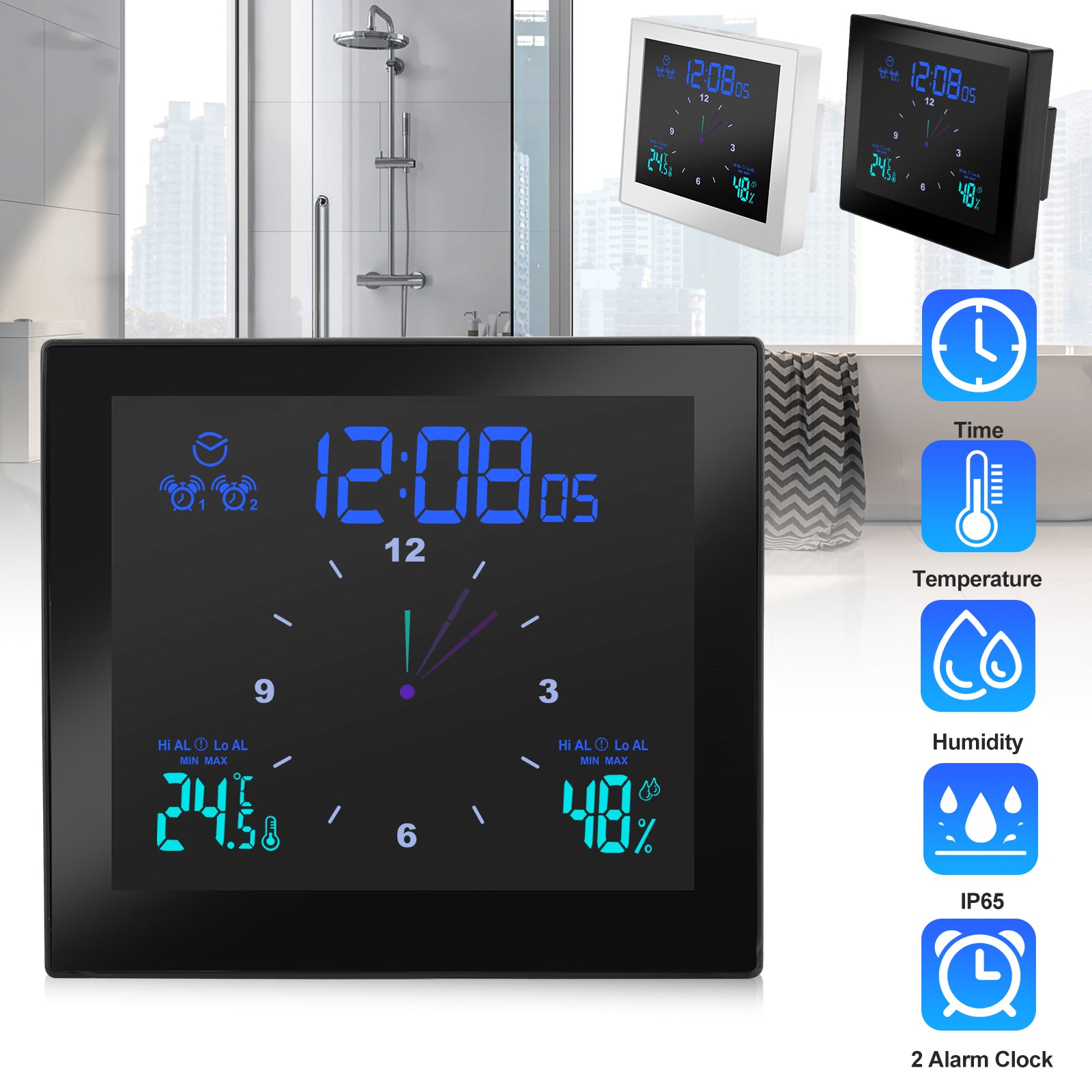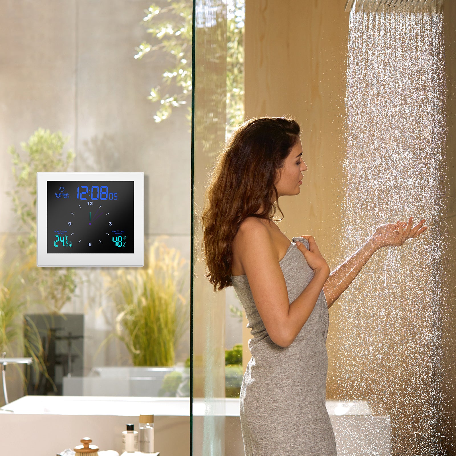 Digital Waterproof Clock - prefer bathroom with Alarm Shower Timer with Dynamic Dashboard,Large Led Screen 3 Backlights Waterproof IP65 Wall Clock with Temperature Humidity Display and Exceed max/min with Suction Cup ( No drilling required ), White