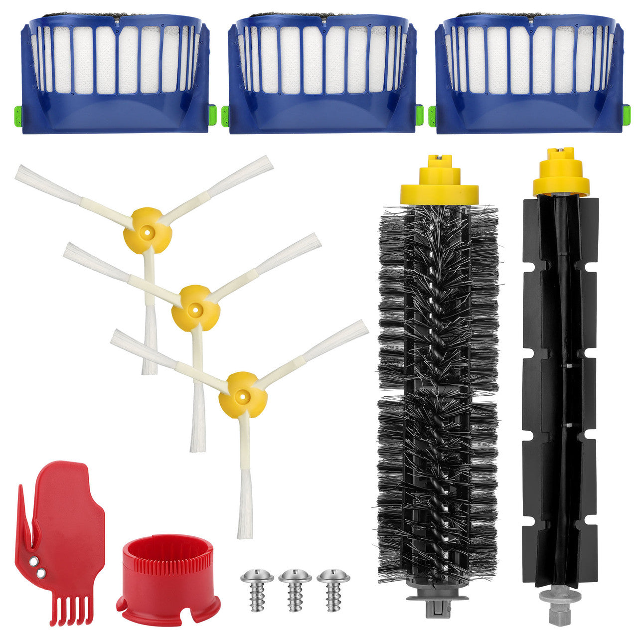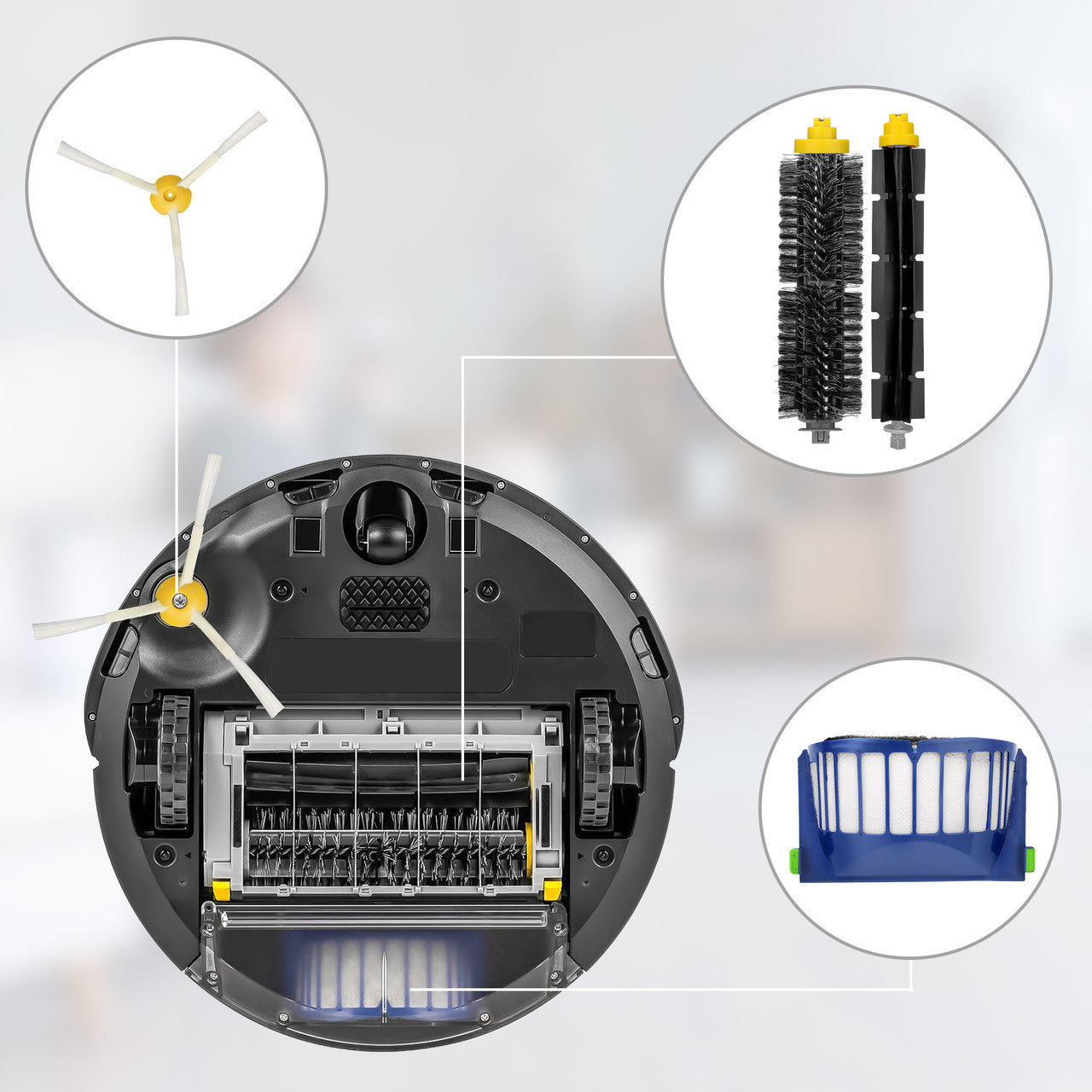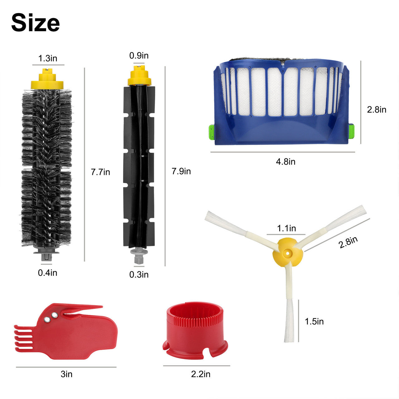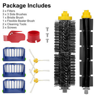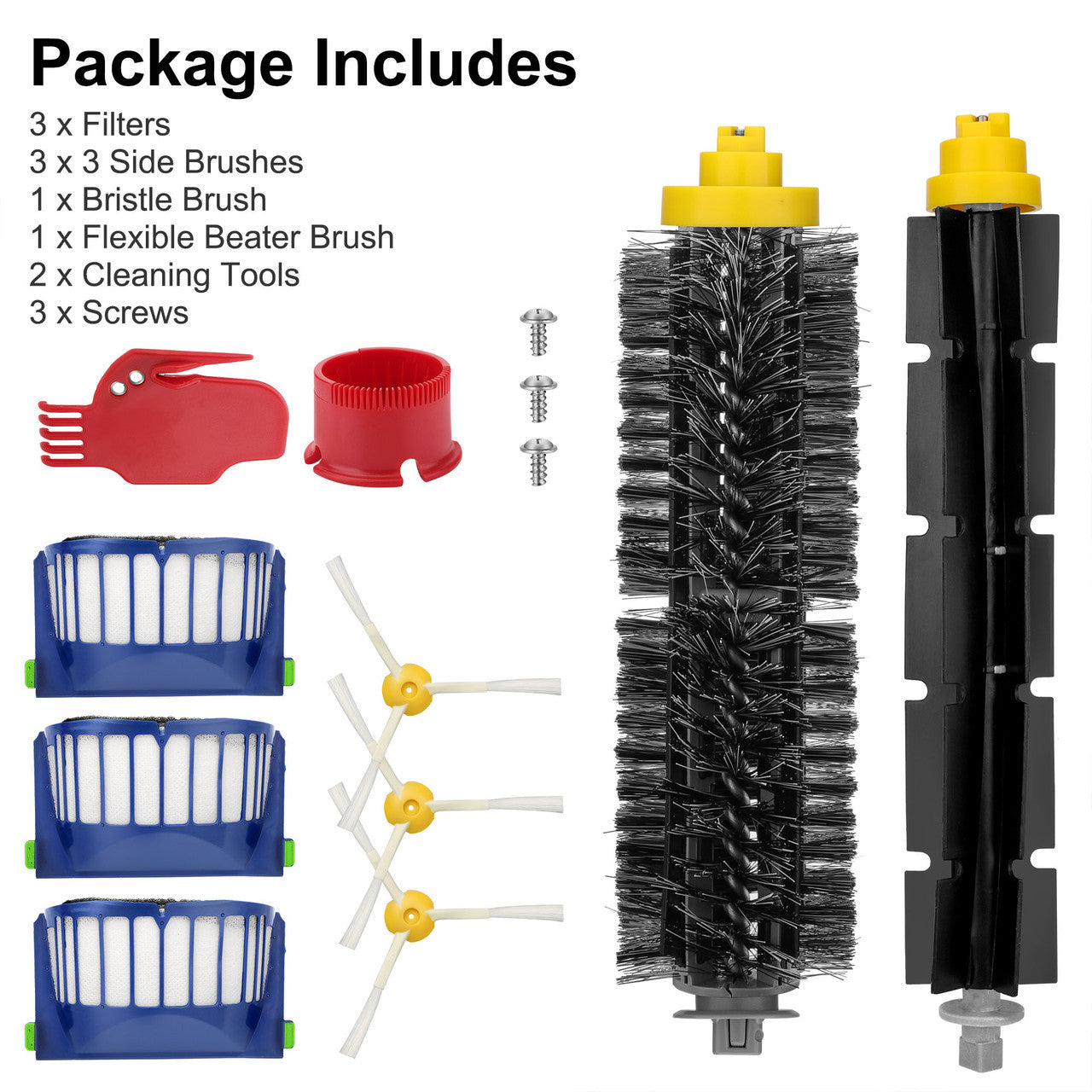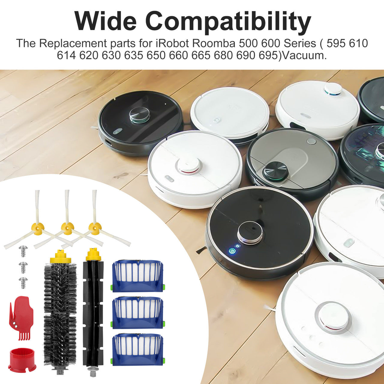Our Vacuum Cleaner Replacement Set is designed specifically for iRobot Roomba 500 and 600 Series models (595, 610, 614, 620, 630, 635, 650, 660, 665, 680, 690, 695). Please note that it is not compatible with the Roomba 645 and 655 models. The set includes 3 filters, 3 side brushes, 1 bristle brush, 1 flexible beater brush, 2 cleaning tools, and 3 screws. Regularly cleaning and replacing these parts will help maintain the high-performance of your vacuum cleaner. We recommend cleaning the filter after each use and replacing the spinning side brush and filter every 2-3 months. Keep your Roomba running smoothly with our Vacuum Cleaner Replacement Set.