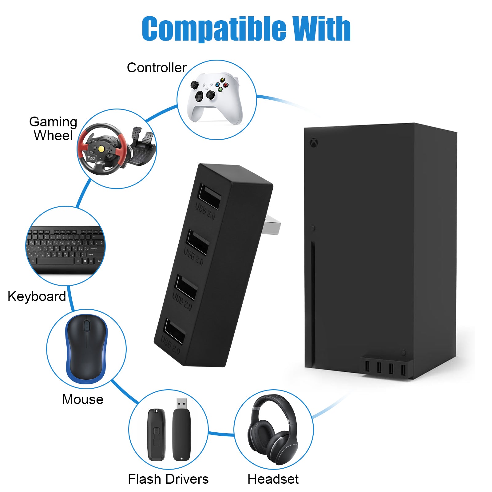 Maximize your Xbox Series X/S experience with our USB Hub Extender. Specially designed for the console, it expands ports seamlessly, connecting controllers, mice, keyboards, Bluetooth adapters, and USB sticks. The compact design ensures portability and storage convenience. Enjoy no latency, anti-interference technology, and stable high-speed data transmission. Plug and play setup requires no additional drivers, providing quick and convenient connectivity.