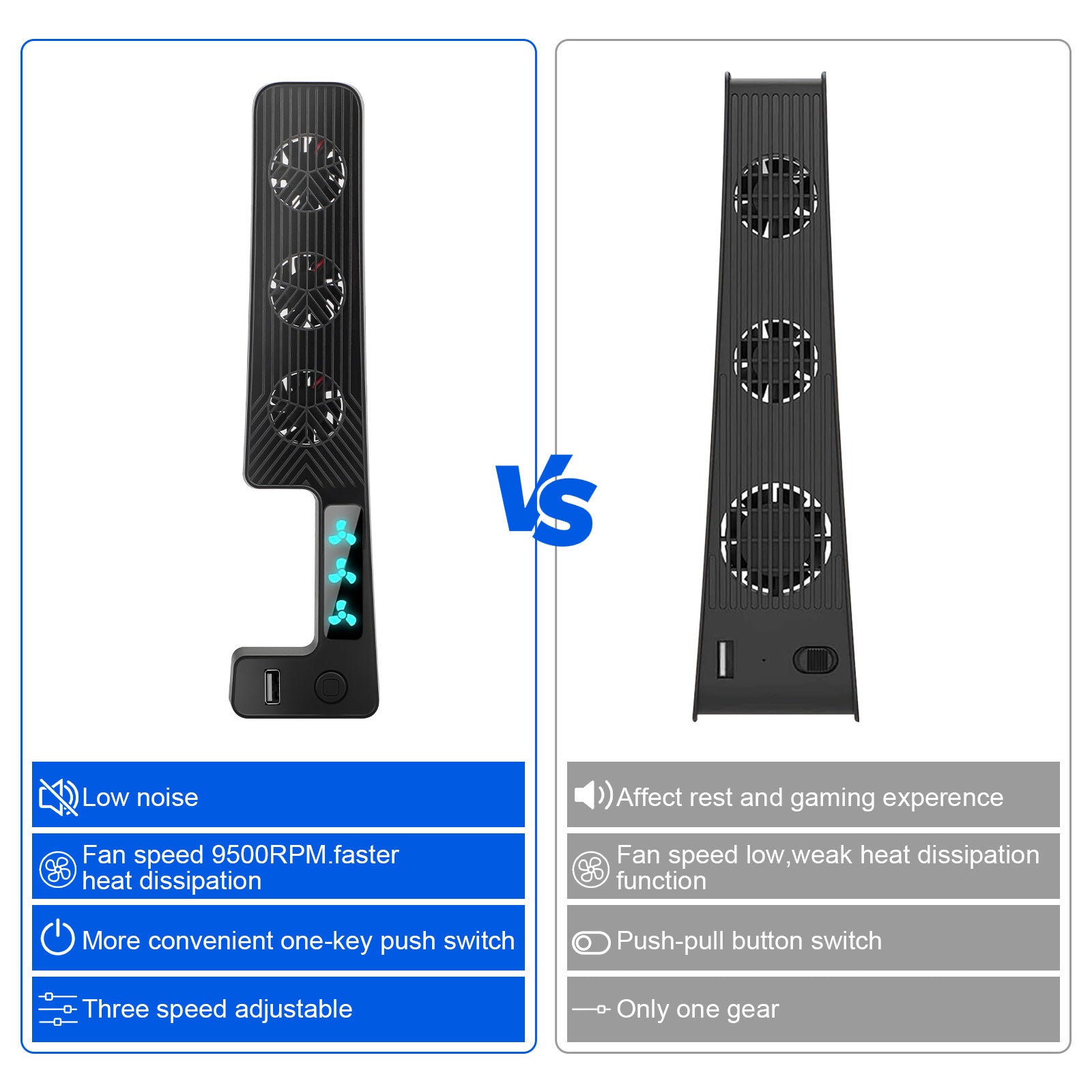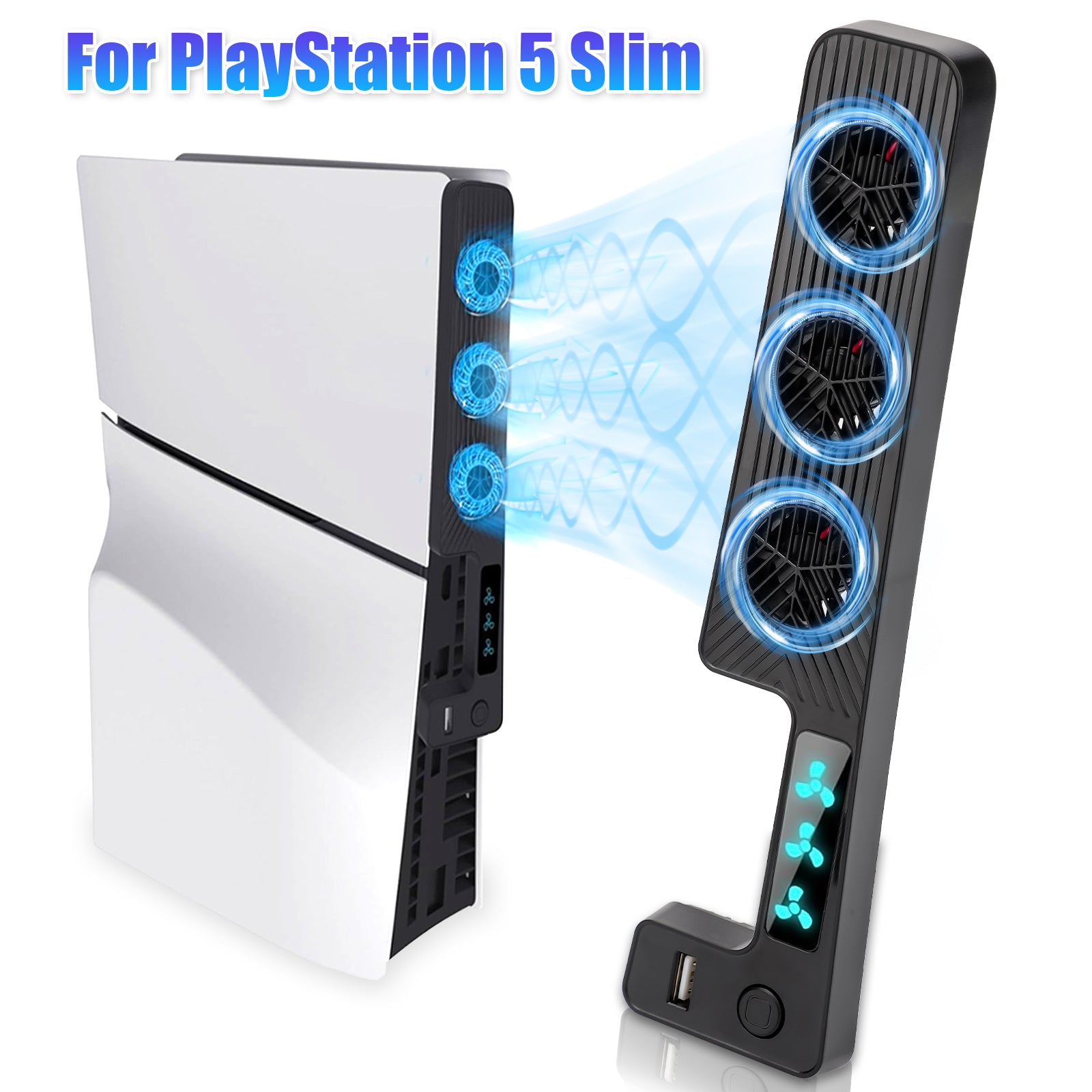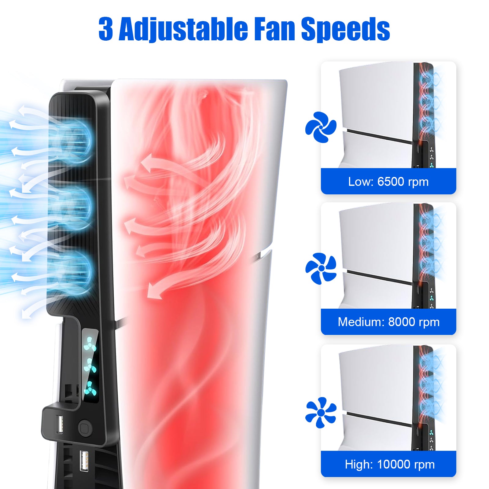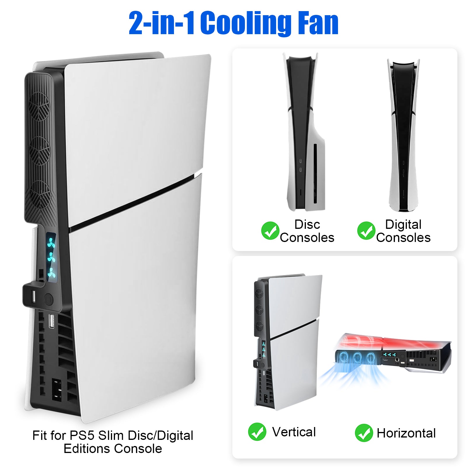 Elevate your PS5 Slim's performance while keeping it cool with our efficient Cooling Fan, expertly tailored for the 2023 Playstation 5 Slim Digital and Disc Edition consoles. Boasting a sleek, lightweight design that integrates seamlessly without obstructing any ports, our fan offers three adjustable speeds to tackle any gaming challenge without overheating. An additional USB 2.0 port ensures effortless data transfer and connectivity, while the whisper-quiet operation keeps you deeply immersed in your gaming worlds.