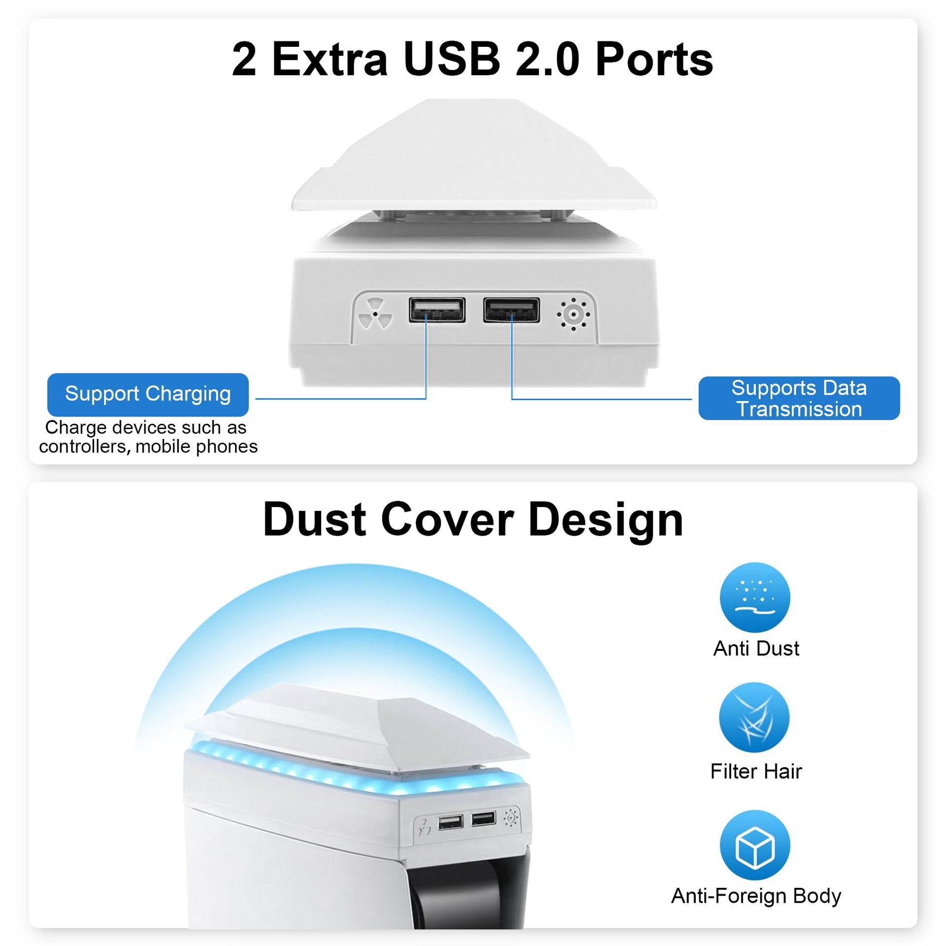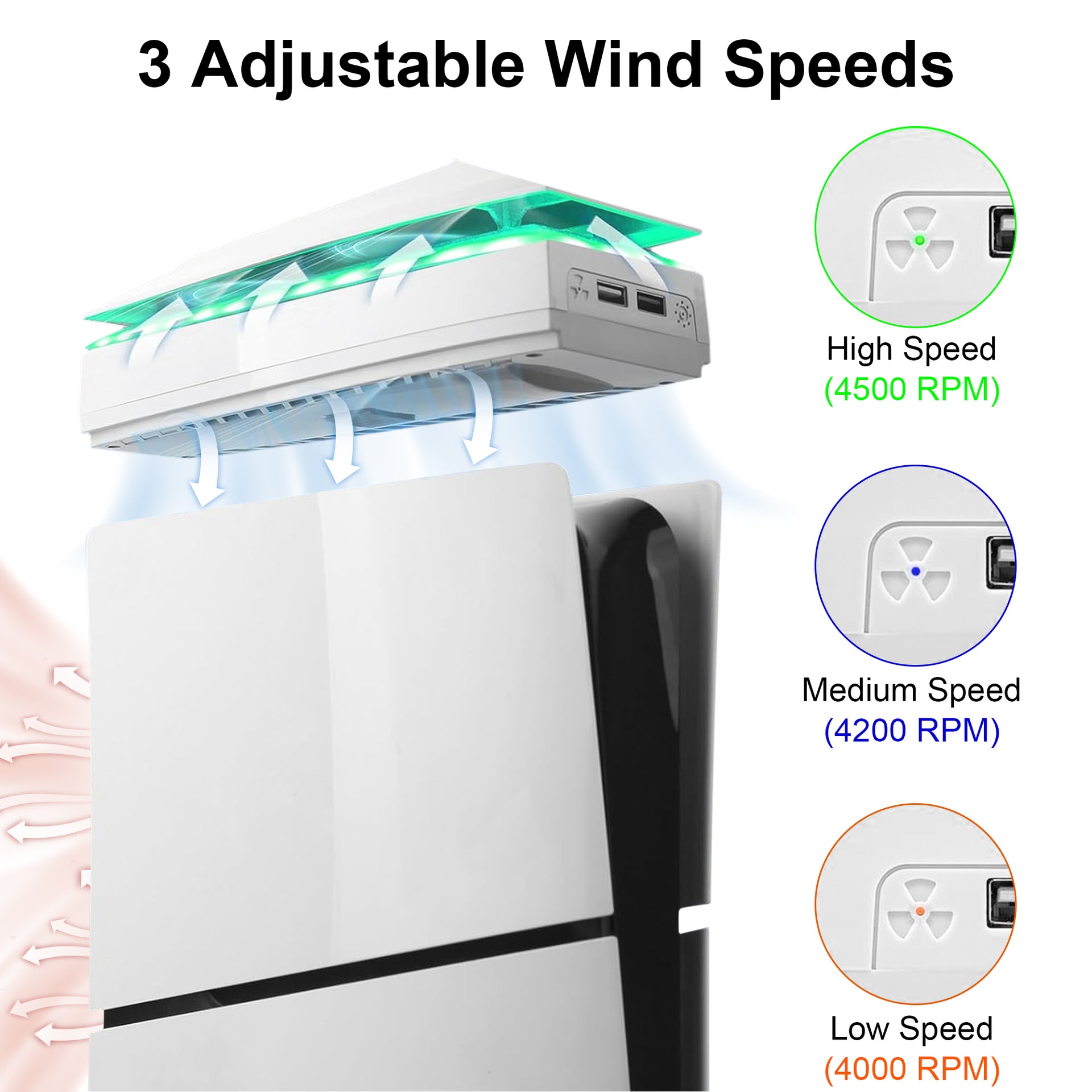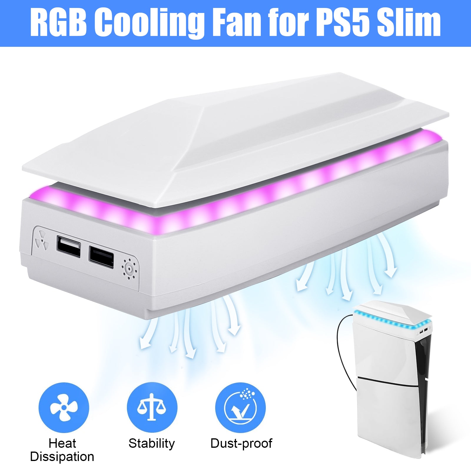 RGB Cooling Fan System with Dust Cover for PS5 Slim - 3 Adjustable Speeds, Dual Fans, 6 Lighting Modes, and 2 USB Ports (White)