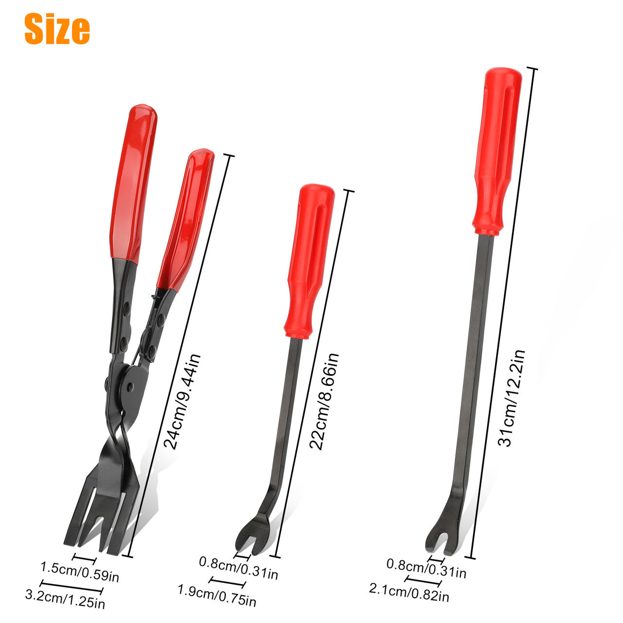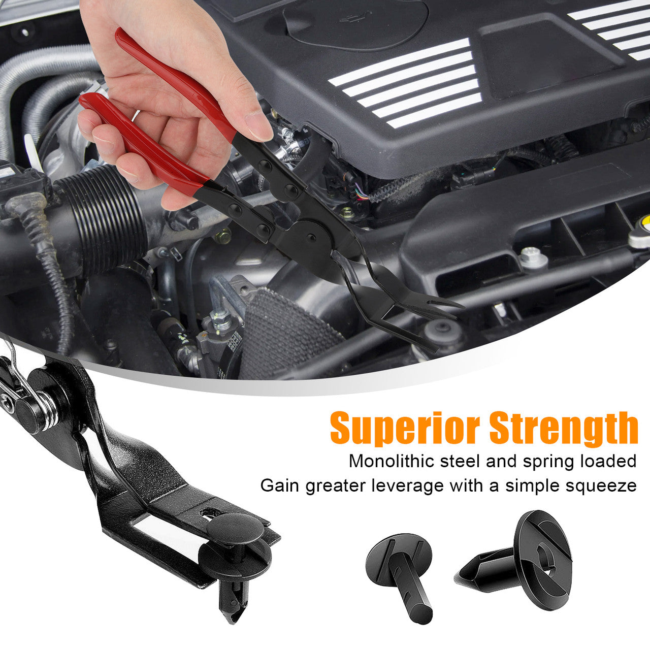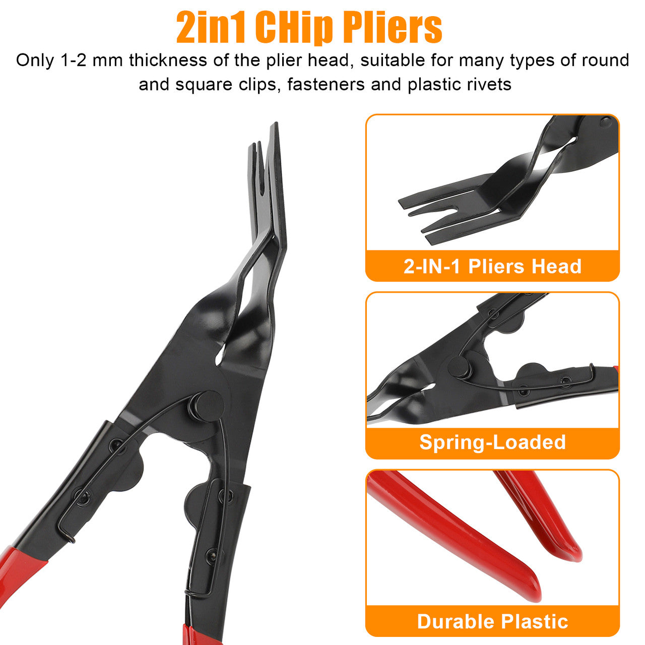 Our Clip Remover Tool Set offers superior durability with alloy steel construction. Ergonomic design, 2-in-1 plier head, and spring-loaded mechanism ensure efficient, damage-free removal of various clips, fasteners, and more.