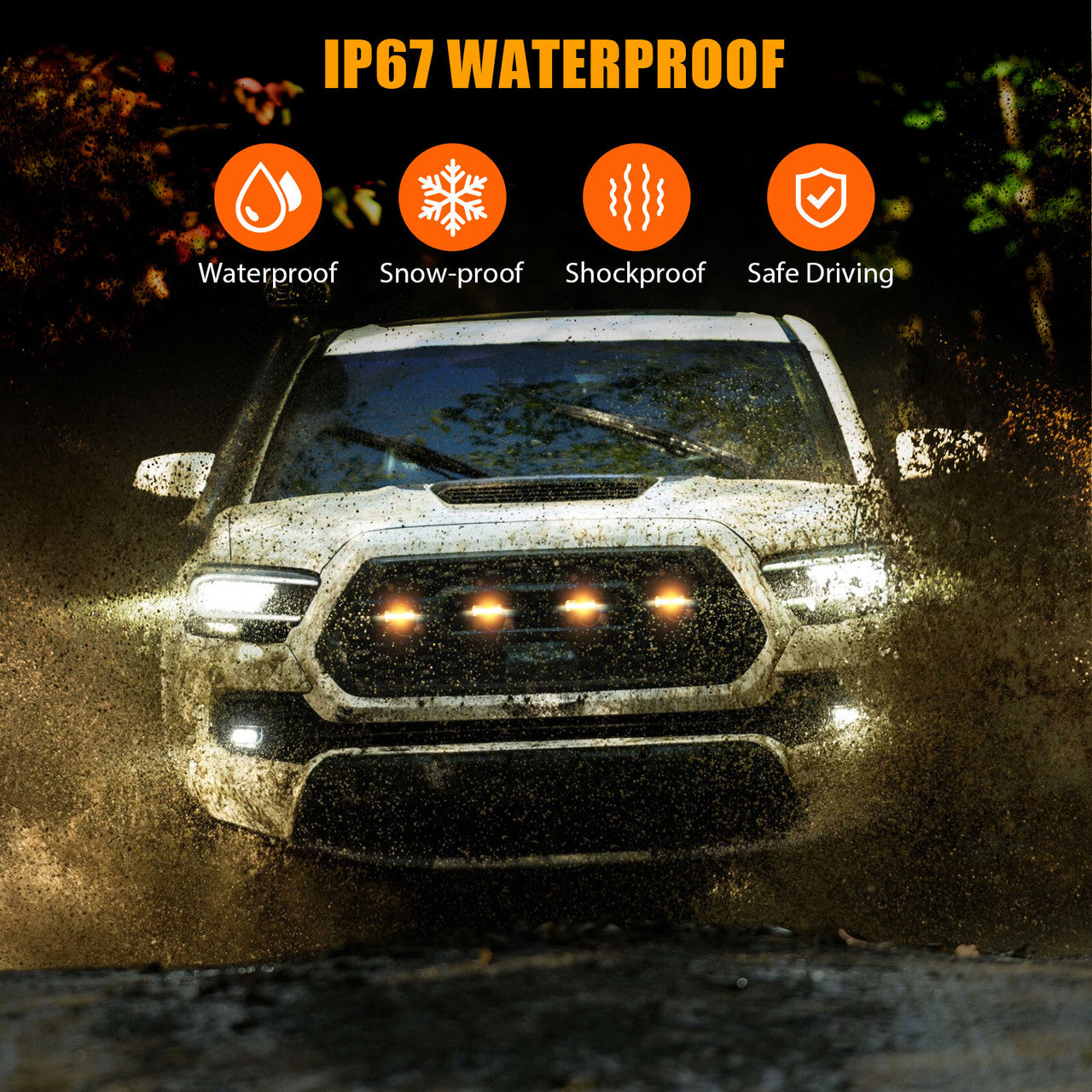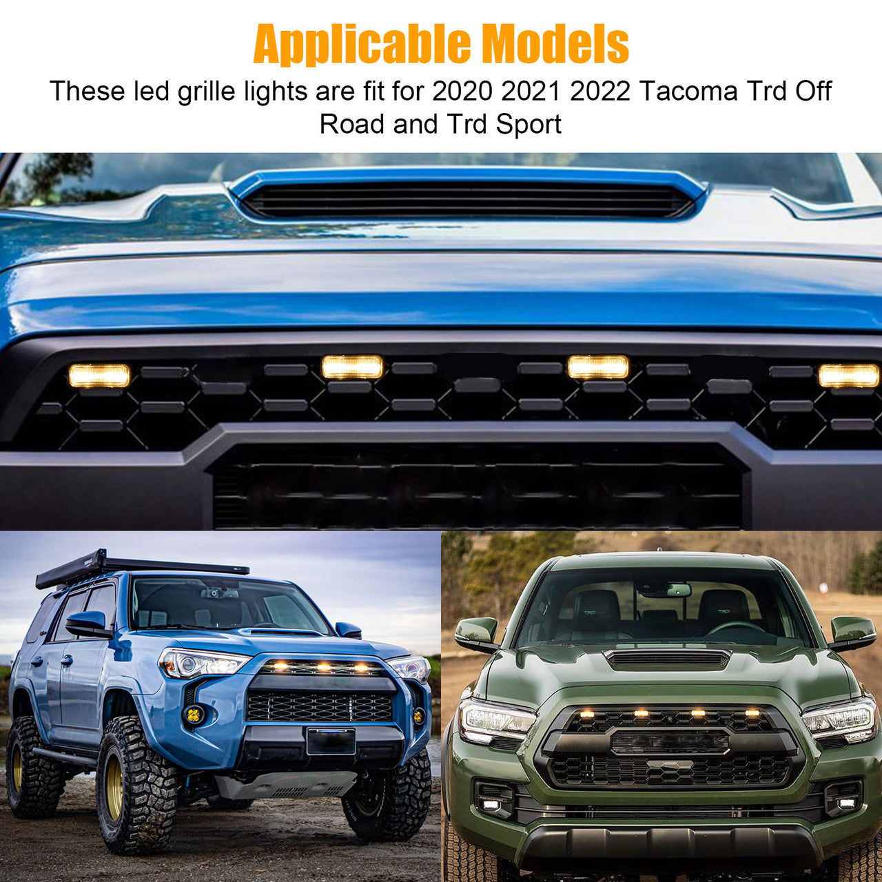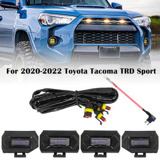 Product Features:● High-Quality Material: The bezel part and the housing part are made of high-quality plastic. The lens is made of PMMA. It is durable, scratch, water, and corrosion resistant, and will not fade even if exposed for a long time. ● Safety Driving: This led grille lights can make your car more visible to other drivers at night and in bad weather (rainy, snowy, or foggy), to keep your safety when driving down the road. ● Easy to Install: Plug & play, no drilling required. Just insert the light into a mesh hole, you can mount it flexibly anywhere on your vehicle’s exterior surface or grille. Recommend hooking up the power before installation to make sure the grille light works. Note: The two grille lights installed in the middle can be distinguished according to the shape. ● Applicable Models: These led grille lights are fit for 2020 2021 2022 Tacoma Trd Off Road and Trd Sport. Not fit for 2020-2022 SR, SR5, Limited, Trd Pro.