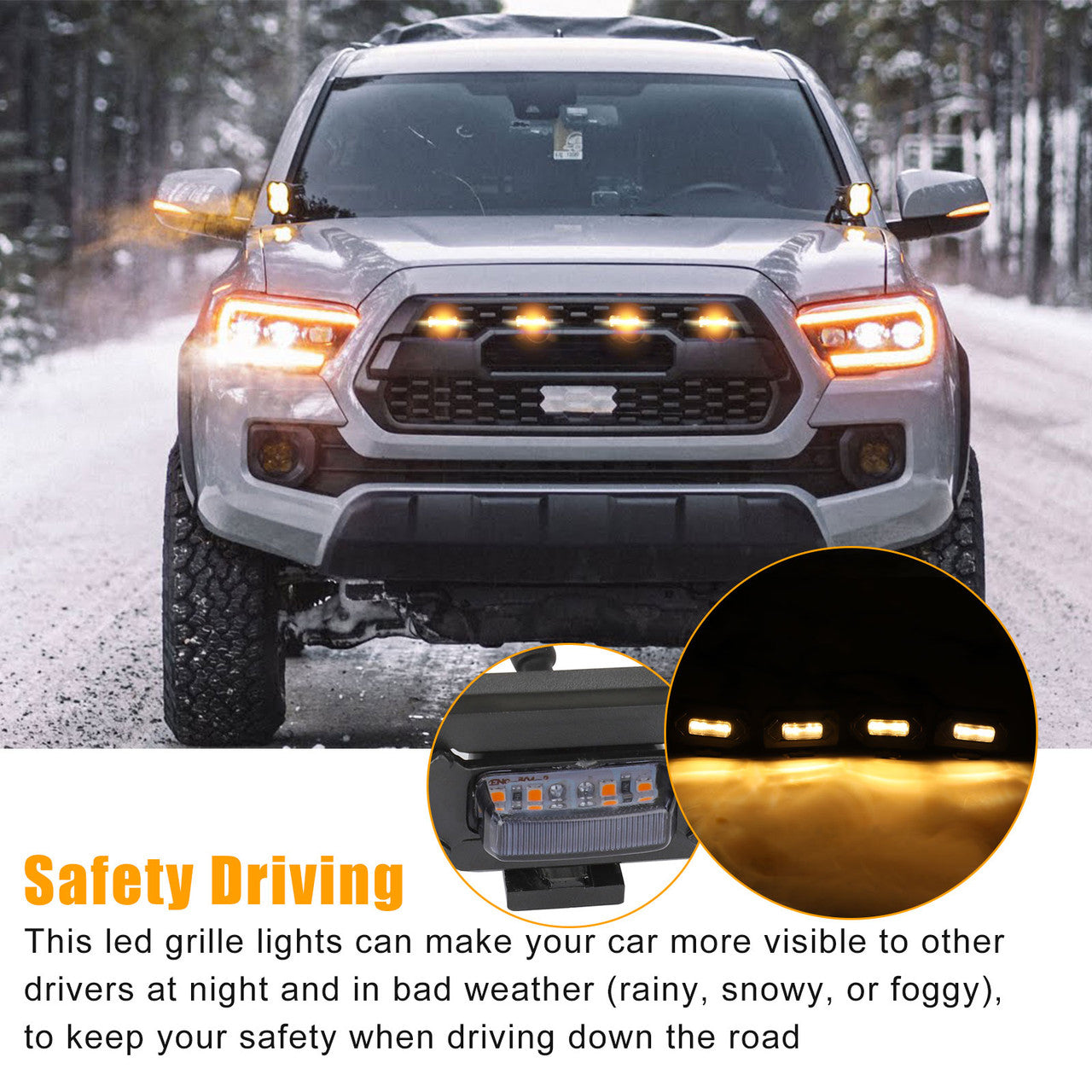 Product Specifications:✅Type:LED Grille Lights✅Material:Plastic+PMMA✅Light color:Amber (Yellow)✅Lens color:Smoked black✅Installation position:Front Grille Mesh✅Voltage:12-24V DC