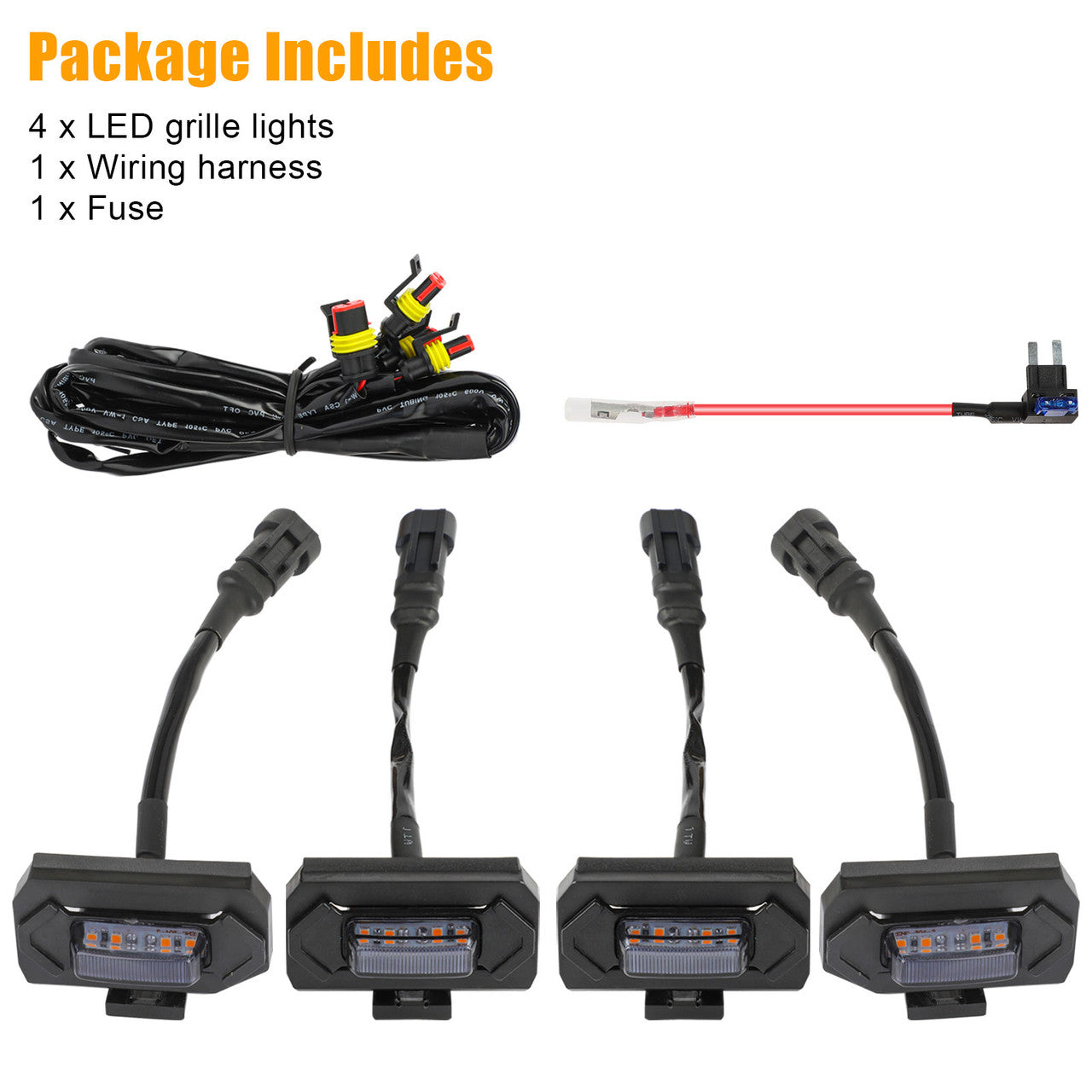 4 X LED grille lights1 X Wiring harness1 X Fuse