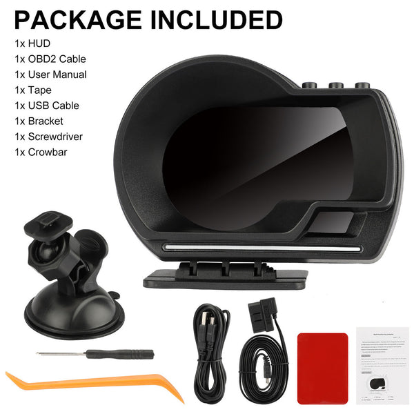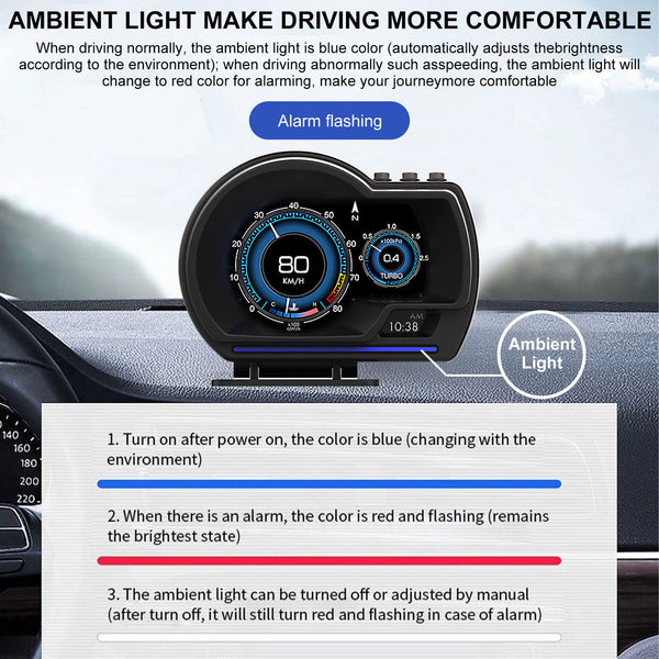 Much Cooler than Others: A LED mood ambient lighting as the flux water to change the color with your driving speed, blue for normal, red flashing for alarm; add the time on the lower right corner; added adjustable base support, for higher, lower, front and backward to be adjusted as you wish, the tape, and a crowbar for the cable fixation. This obd hud doesn’t support JOBD and OBDI.OBD model is not compatible with a hybrid electric vehicle, diesel car, pickup truck, RV, computer modified car