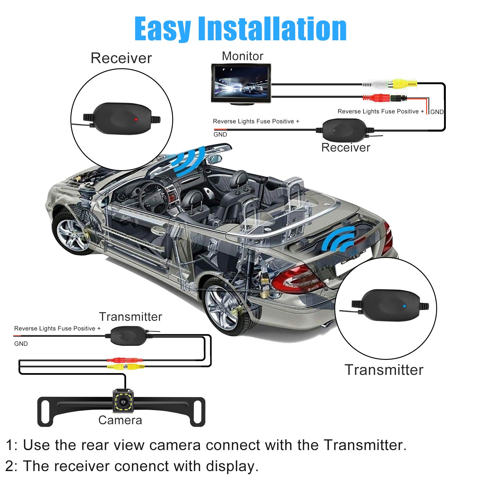 Upgrade your vehicle's rear-view system with our high-grade Wireless Car Rear View Camera Kit. This innovative solution transforms any standard reversing camera with an RCA connection into a cutting-edge wireless setup. Engineered with professional-grade durability and waterproofing, it withstands the harshest weather conditions. The camera’s high-definition image quality and 12 LED-enhanced night vision provide crystal-clear visibility for safe reversing, day or night. Enjoy the simplicity of a cable-free installation and a user-friendly design. This kit is ideal for anyone seeking to enhance their car's rear-view functionality without the hassle of complex wiring.