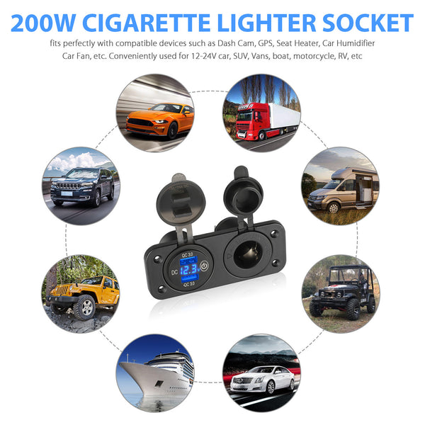 200W Cigarette Lighter Socket: Total power up to 150W (12V) / 200W (24V). Enough for everyday use, fits perfectly with compatible devices such as Dash Cam, GPS, Seat Heater, Car Humidifier, Car Fan, etc. Conveniently used for 12-24V car, SUV, Vans, boat, motorcycle, RV, etc.