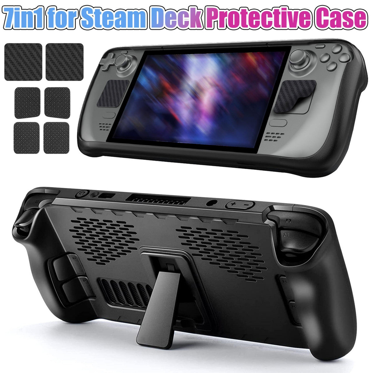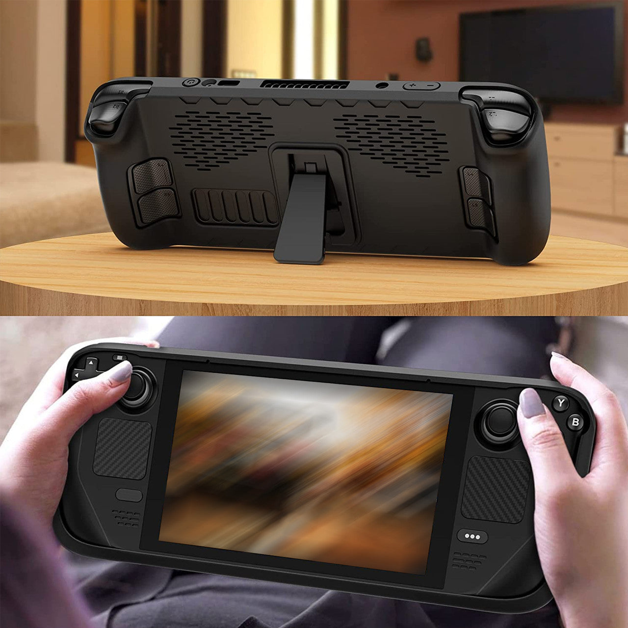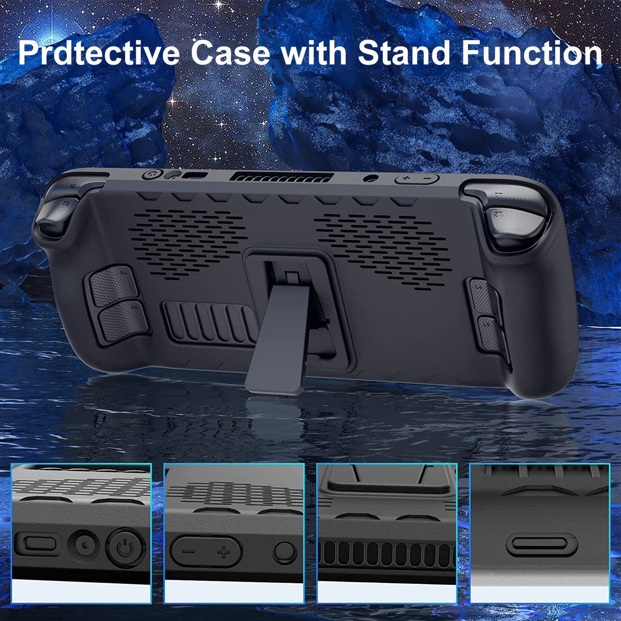 Product Features:● Unique Design: This protective case is specifically designed for the steam deck. Precision cutting of the steam deck case allows every port or button to be not blocked by the protective case, so all functions of the steam deck can be used without interference. ● Built-in Kickstand Design: This steam deck case has a built-in kickstand on the back so you can smoothly place the steam deck on a table and use the mouse and keyboard. Switch between handheld and tabletop game modes at will. Better heat dissipation by using a kickstand to support the steam deck. ● Excellent Heat Dissipation: The precise cutout of this protective case will not block the heat sink of the steam deck. The additional cooling holes are added to the steam deck case back, solving the heat dissipation problem excellently. ● High-Quality Material: This steam deck case is made of high-quality TPU material. This material is wear-resistant, scratch-resistant, impact-resistant and shock-absorbing, and not easily deformed, which can protect your steam deck from daily bumps, drops, scratches, and dust. ● Full Protection: There are 6 pcs of additional protective stickers to protect your touchpad and L4/L5/R4/R5 buttons and provide a different hand feel. This steam deck case fully protects your console from daily bumps, drops, scratches, and dust.